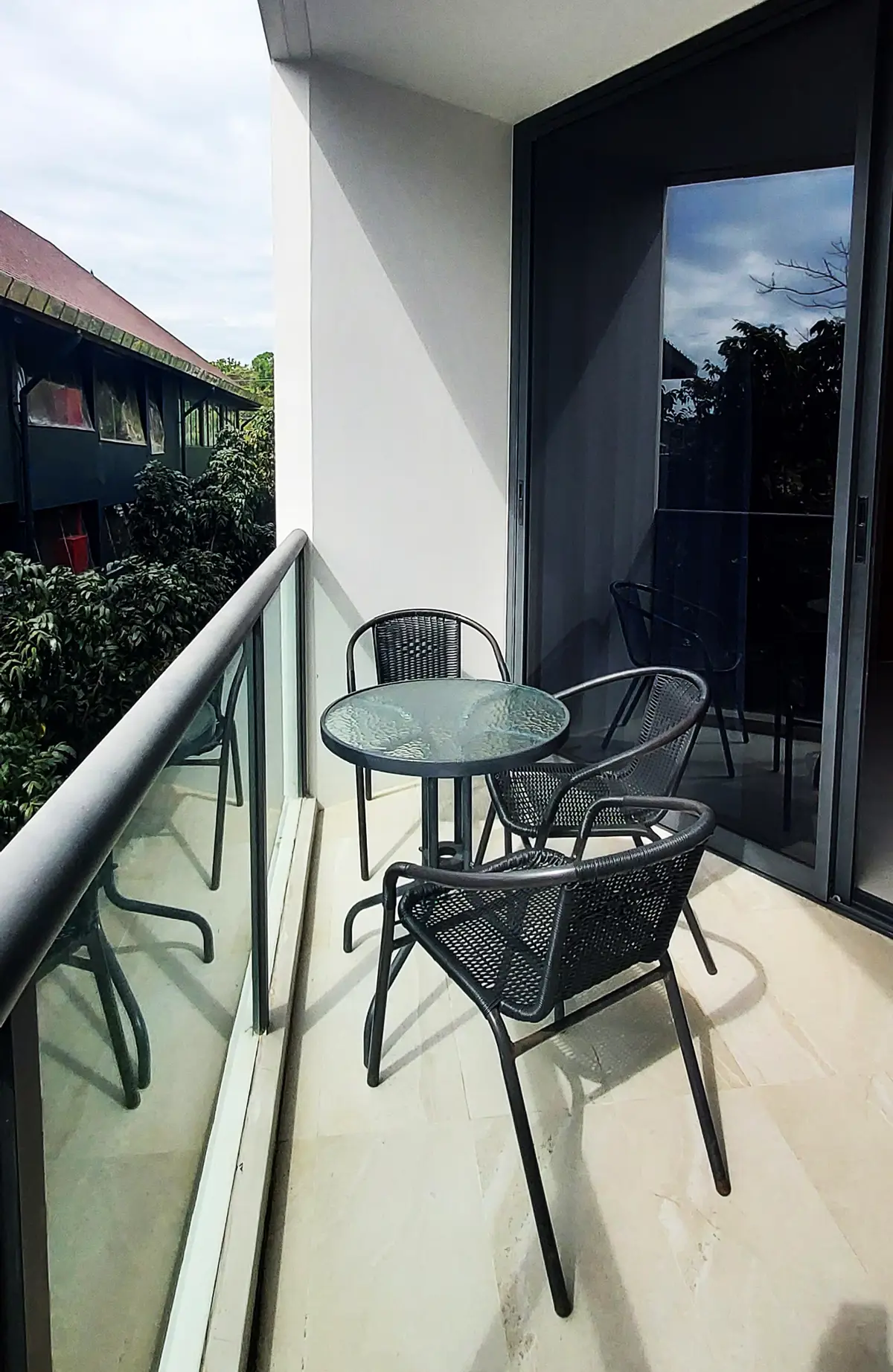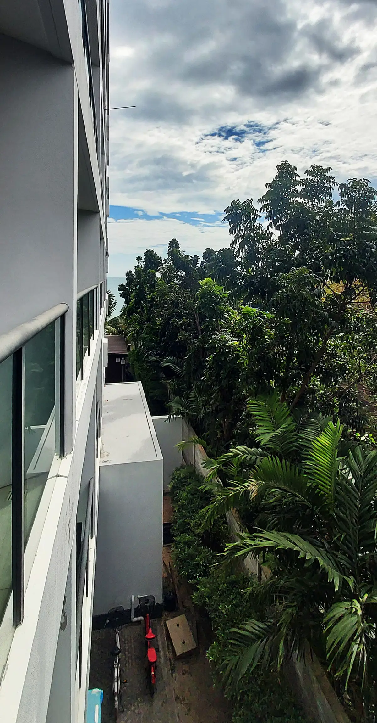 From the balcony, the main view is a garden, but the sea can be glimpsed.