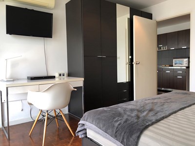 1 bedroom, 1 bathroom condo with a size of 58 sqm. on the 29th floor of the popular Sukhumvit Suite on Sukhumvit 13. The condo comes fully furnished and the building itself has a swimming pool, gym and sauna as well as restaurants, convenience store, salon and laundry. This building is popular because of its low prices and proximity to the BTS and MRT stations and Terminal 21 shopping center (10 minute walk) as well as the exciting nightlife of Sukhumvit 11.