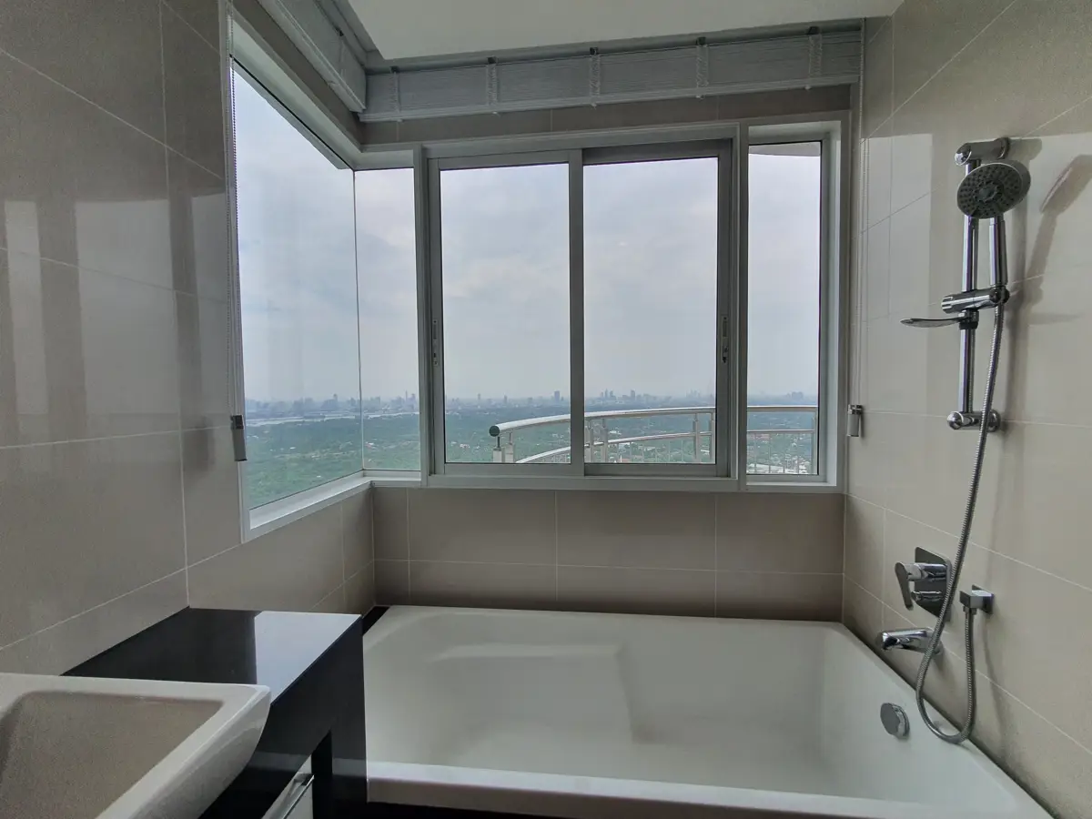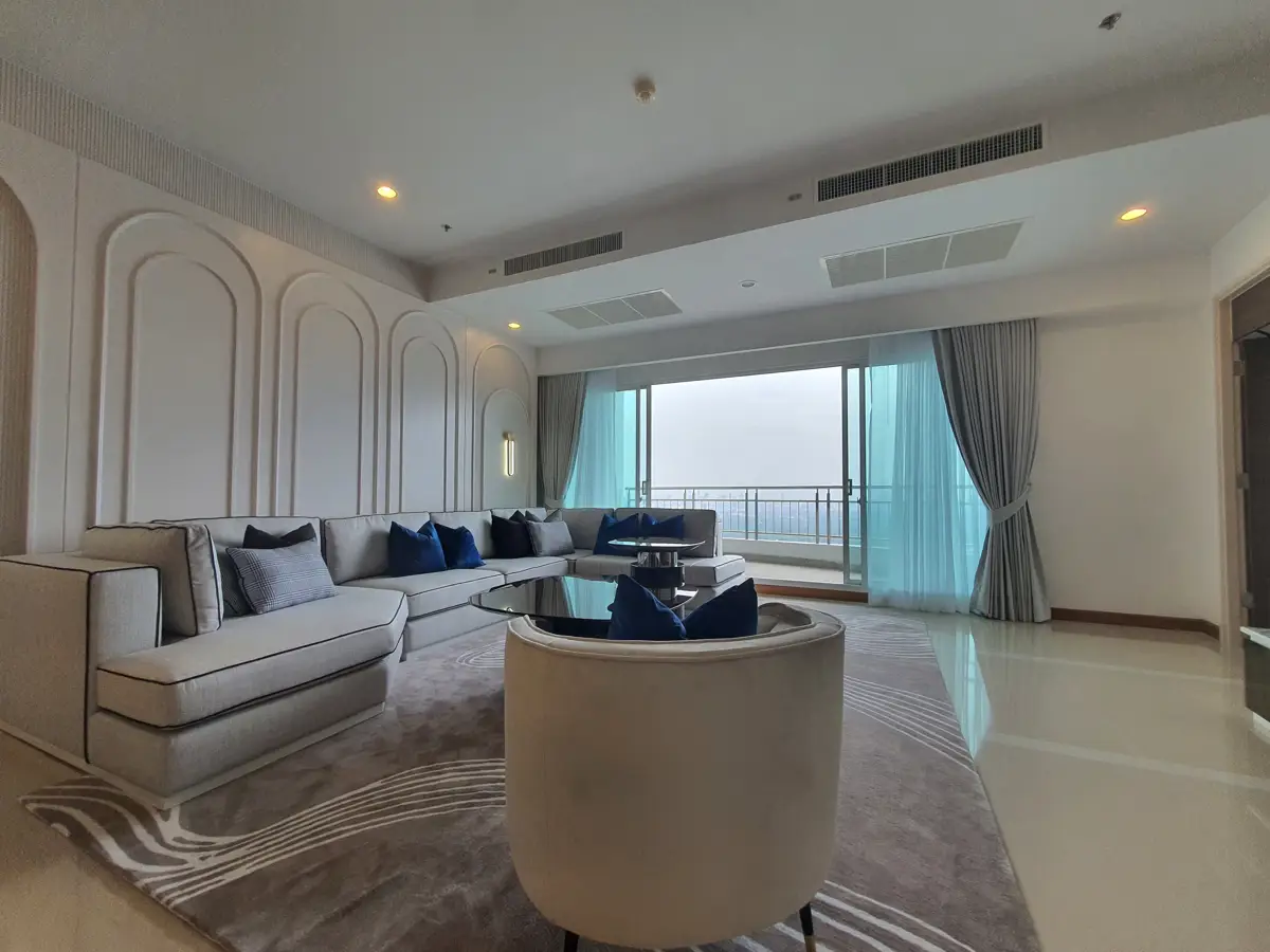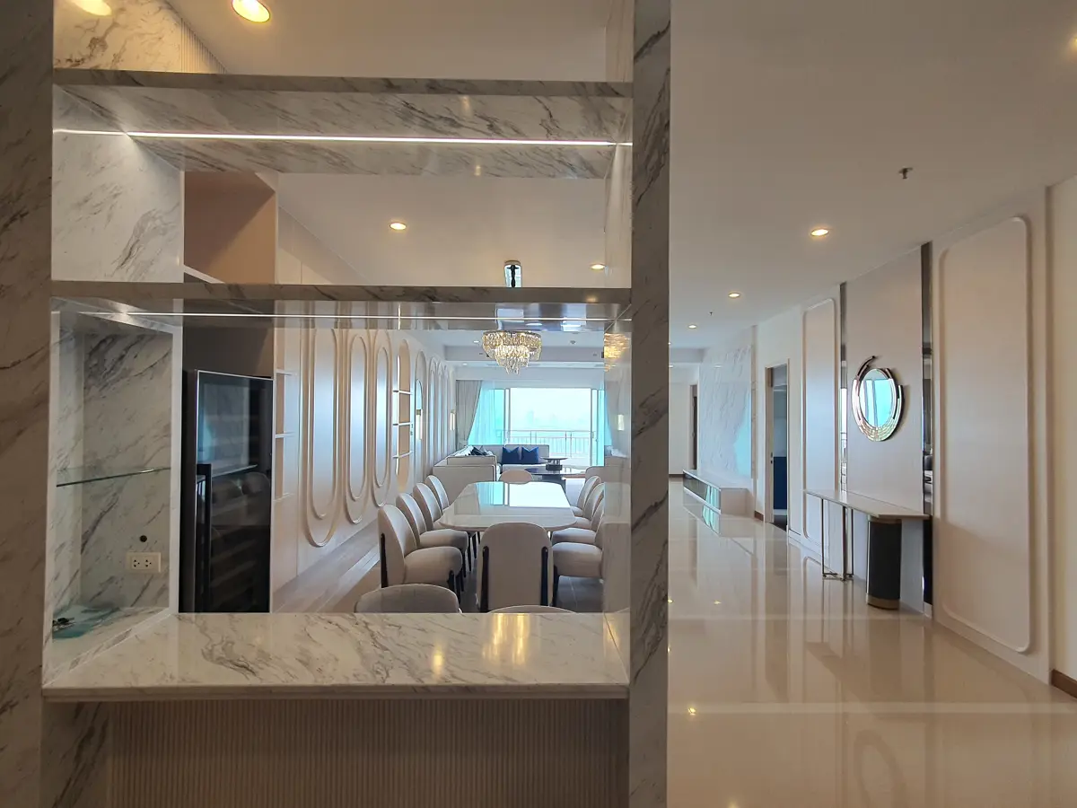 This is a 4 bedroom, 4 bathroom penthouse on the market for rent at Supalai Prime Riva, on Rama 3 Road, Bangkok. The spacious condo measures 355.55 sqm, is on the 43rd floor with amazing river views and comes furnished.
