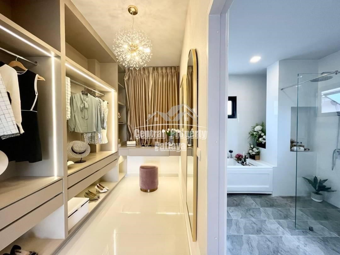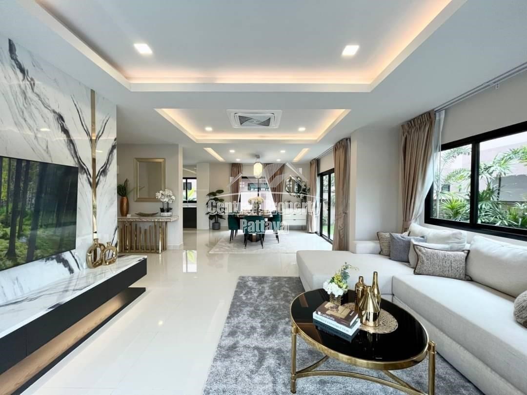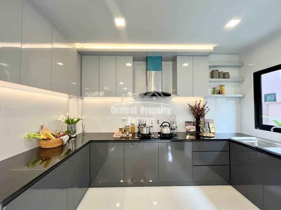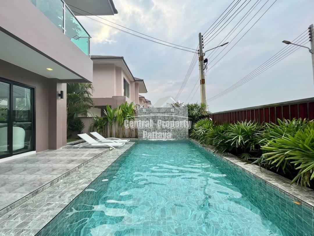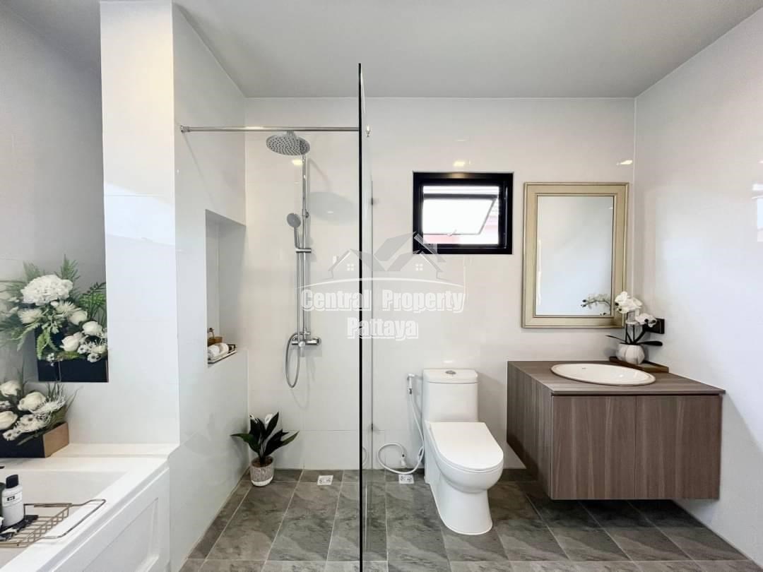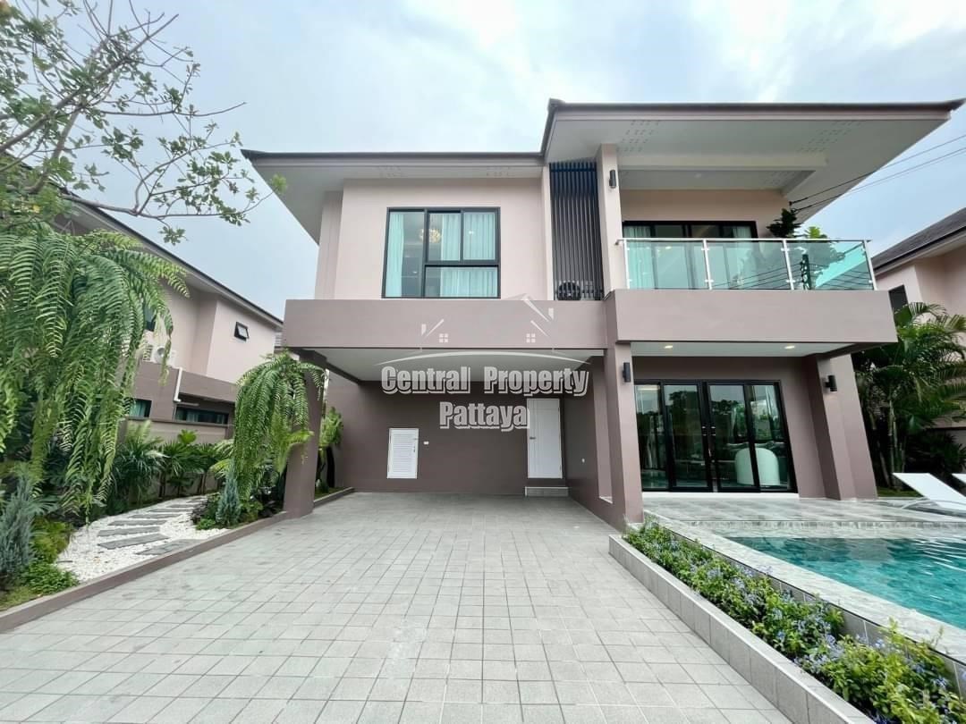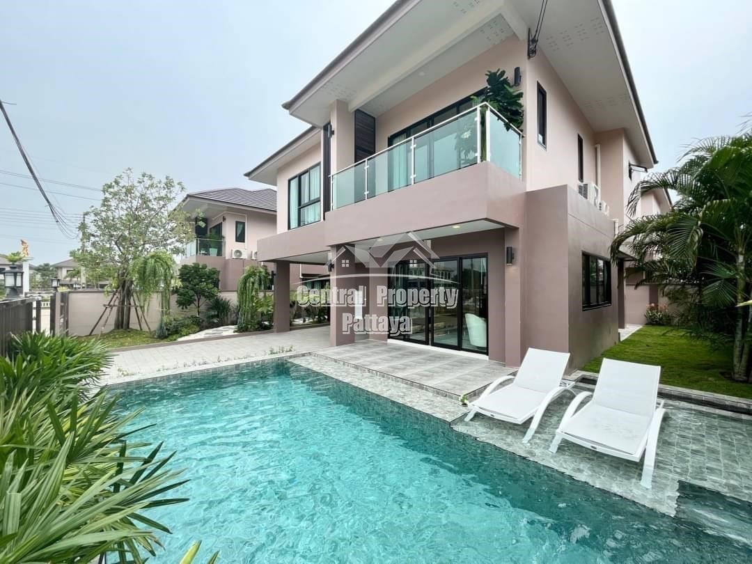 Spacious and modern, this recently completed 4 bed, 3 bath private pool villa is offered for sale in Thai name in Huay Yai. The contemporary interior is generous in size, including a large European family kitchen, 4 large bedrooms and 3 elegant bathrooms, as well as substantial storage space and quality appliances included. The exterior includes a large, landscaped garden, large, private swimming pool, substantial pool deck and covered parking for 2 vehicles.