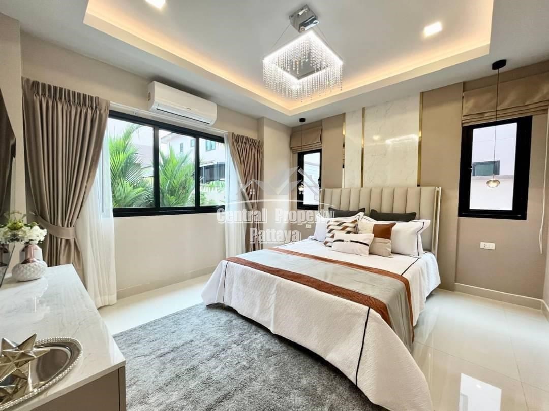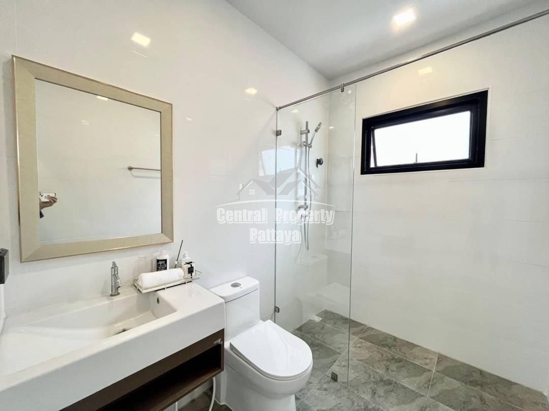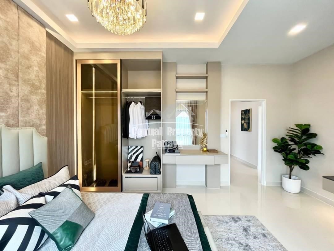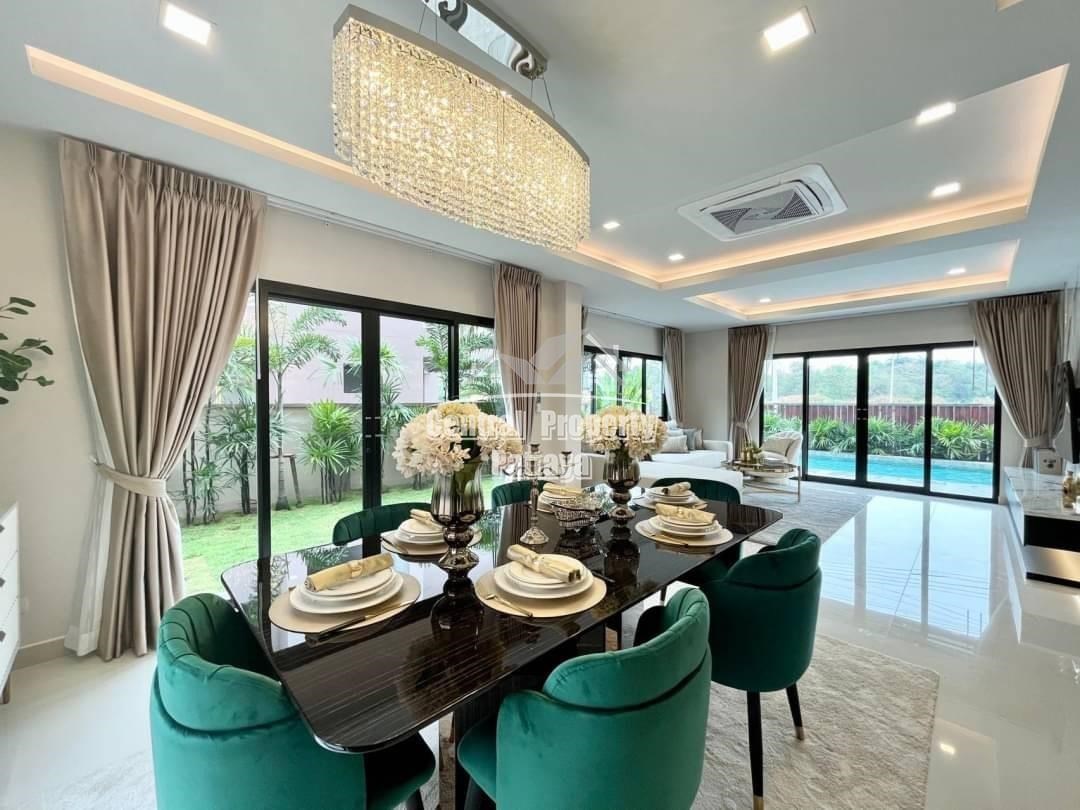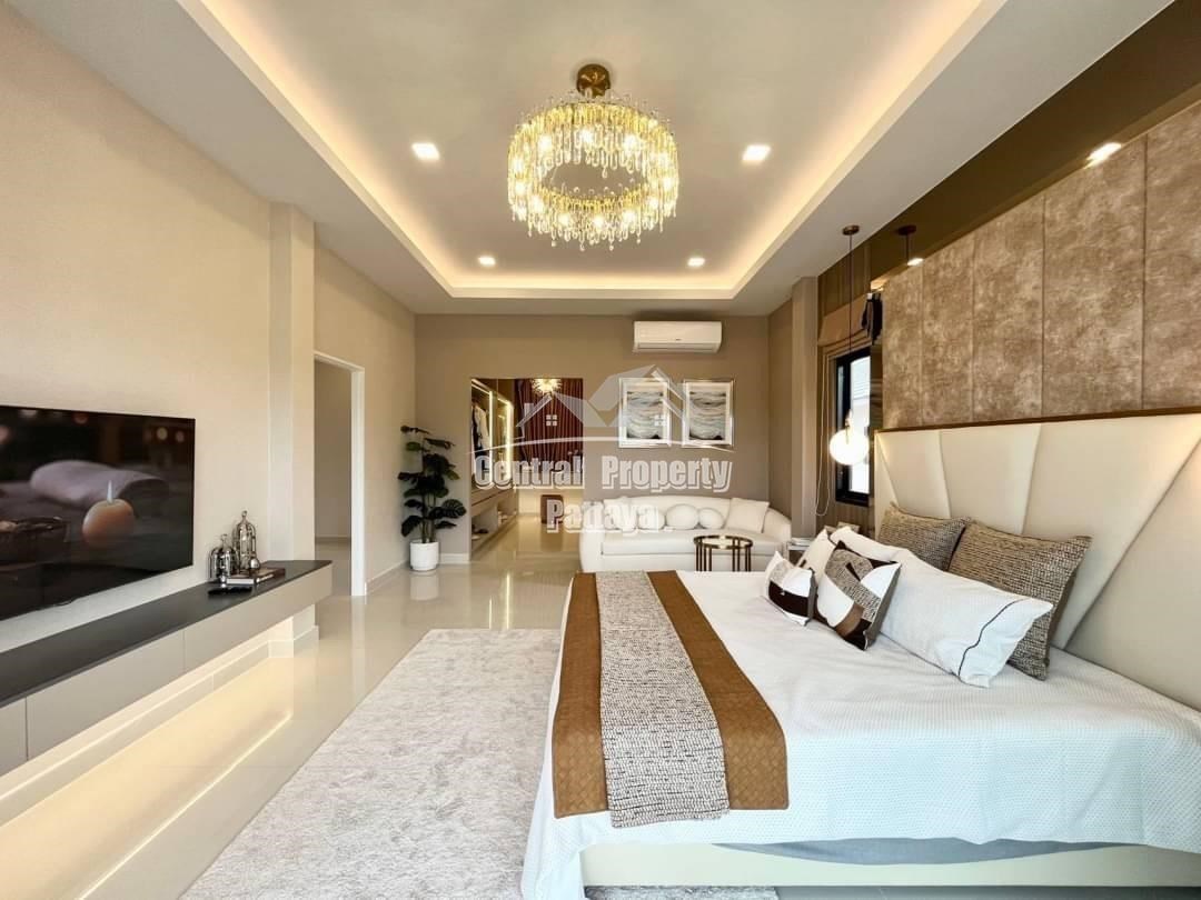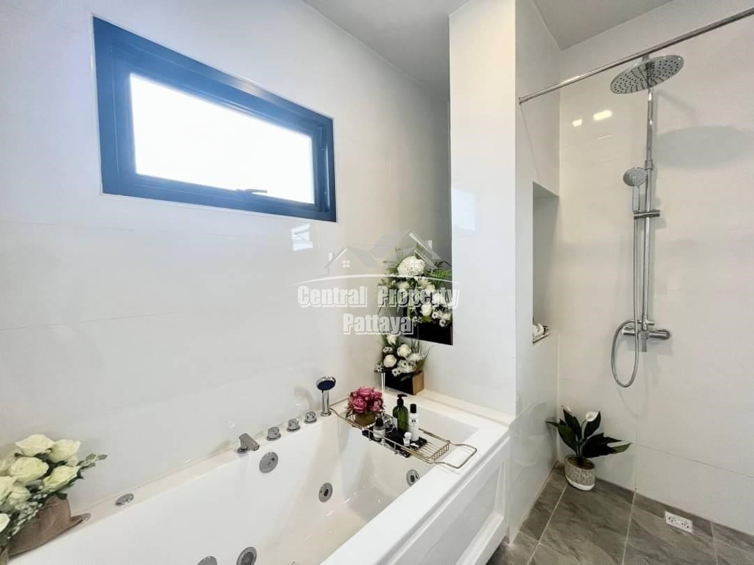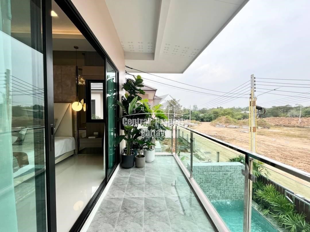 Spacious and modern, this recently completed 4 bed, 3 bath private pool villa is offered for sale in Thai name in Huay Yai. The contemporary interior is generous in size, including a large European family kitchen, 4 large bedrooms and 3 elegant bathrooms, as well as substantial storage space and quality appliances included. The exterior includes a large, landscaped garden, large, private swimming pool, substantial pool deck and covered parking for 2 vehicles.