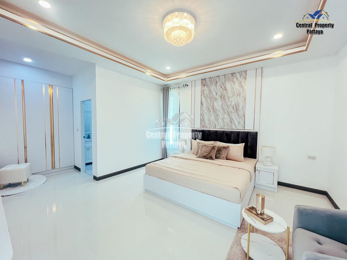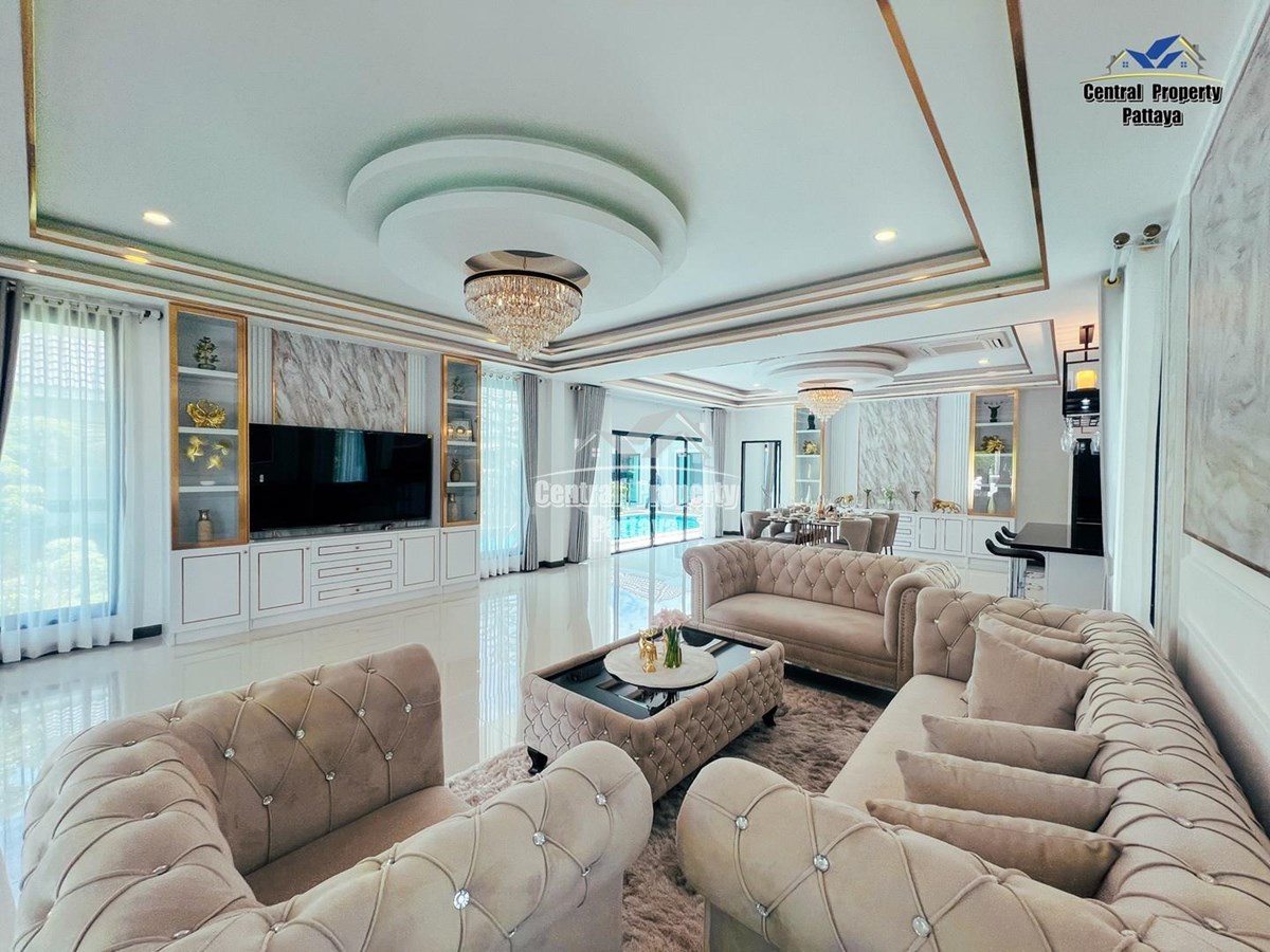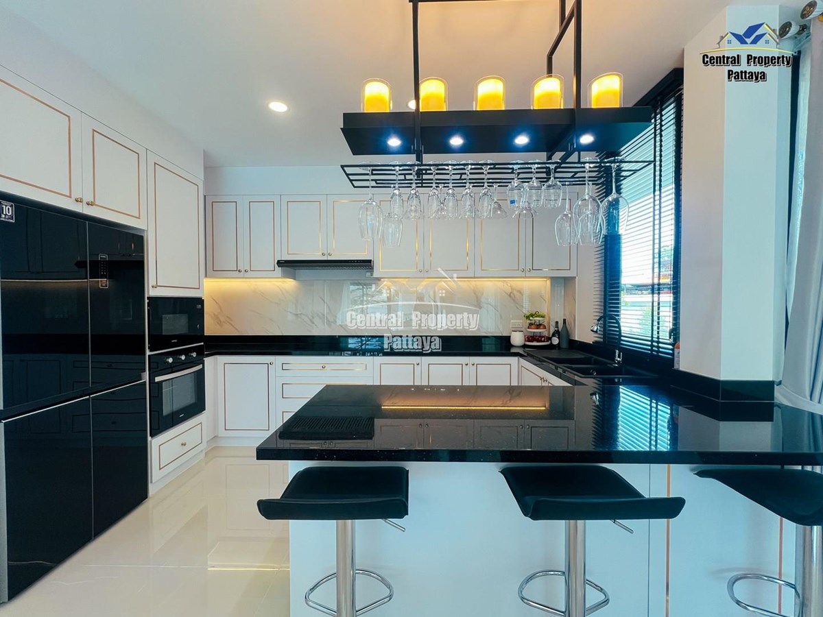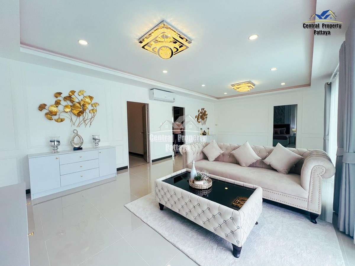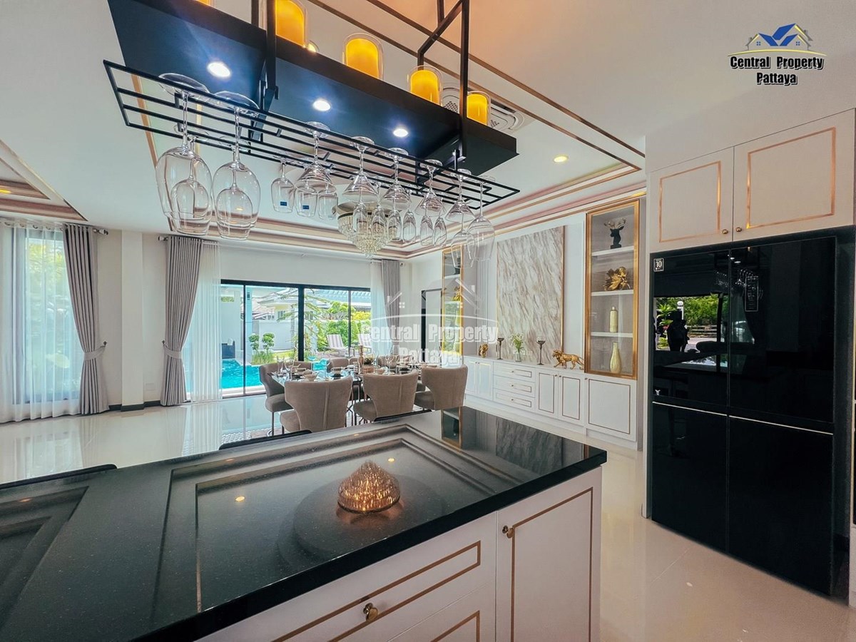 Exceptional 6 bedroom, 8 bathroom house with private pool for sale in Thai/Company name in East Pattaya. The house has been recently completed to a very high standard and is fully furnished, including fitted wardrobes and a professional grade European family kitchen. The bathrooms are all ensuite, spacious and very modern. The materials used throughout are of high quality with local touches used to accentuate the high ceilings and spacious and stylish interior.
