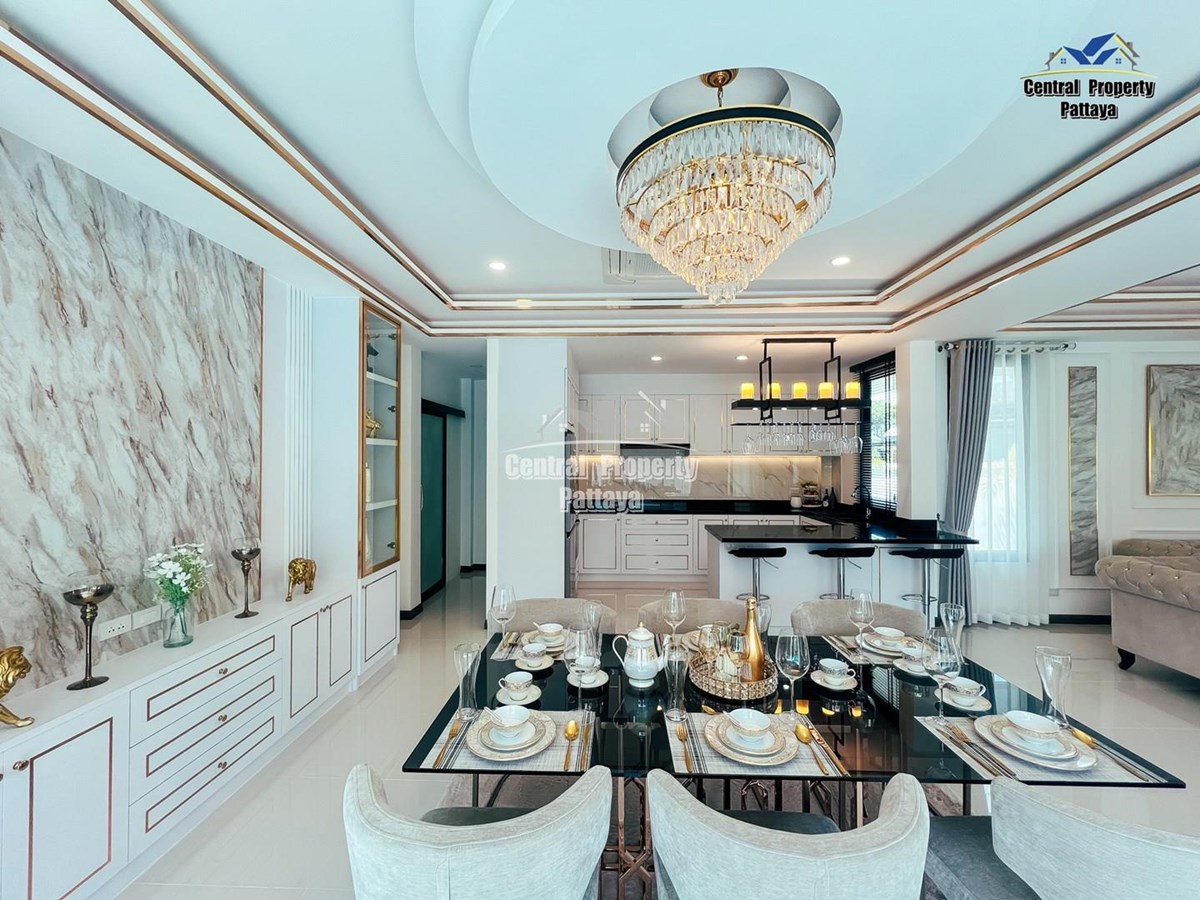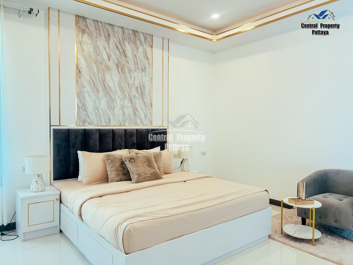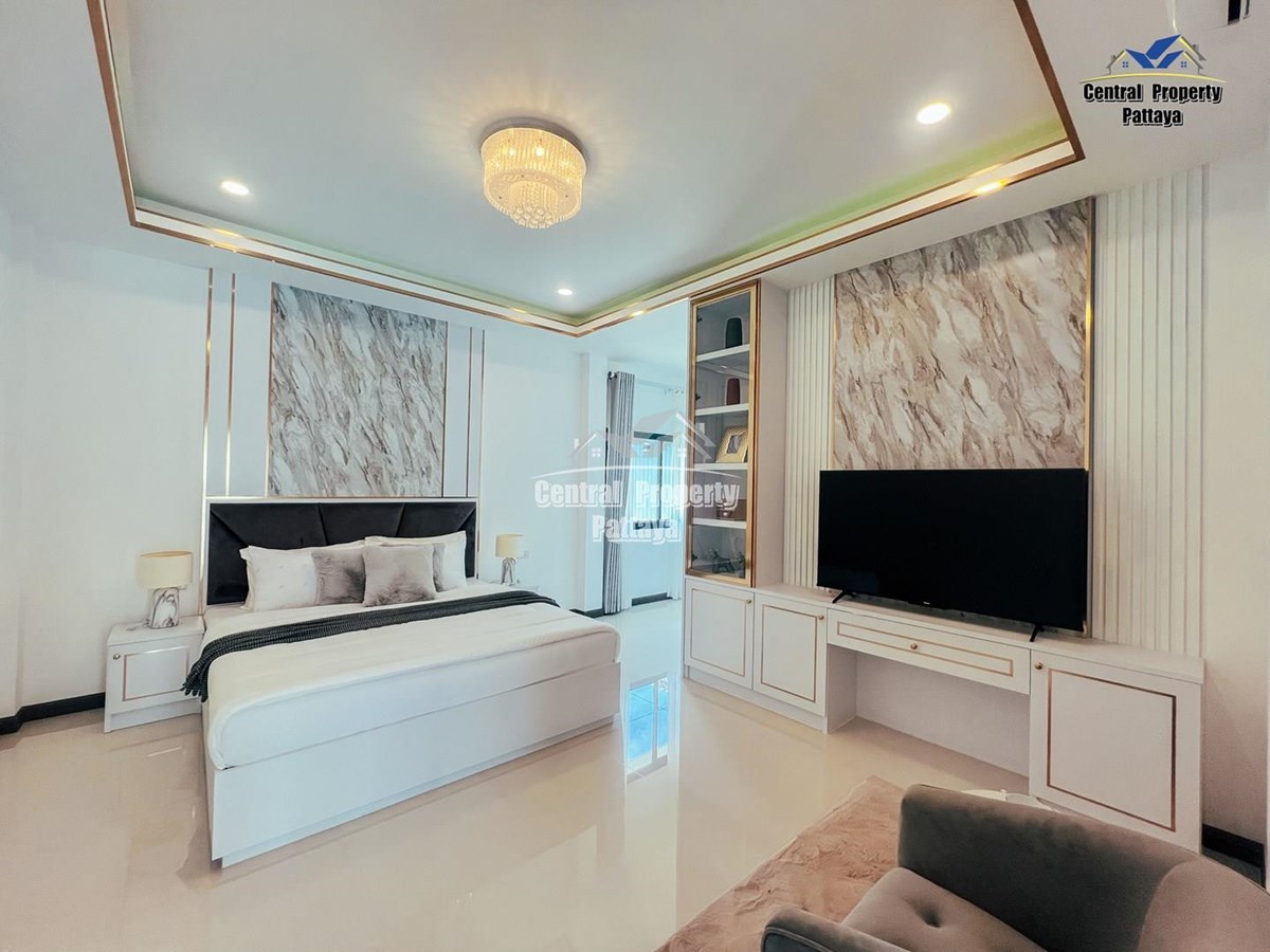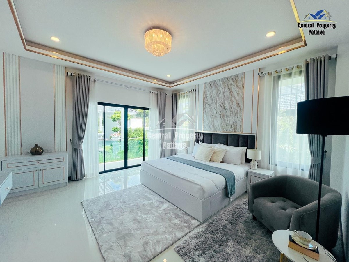 Exceptional 6 bedroom, 8 bathroom house with private pool for sale in Thai/Company name in East Pattaya. The house has been recently completed to a very high standard and is fully furnished, including fitted wardrobes and a professional grade European family kitchen. The bathrooms are all ensuite, spacious and very modern. The materials used throughout are of high quality with local touches used to accentuate the high ceilings and spacious and stylish interior.
