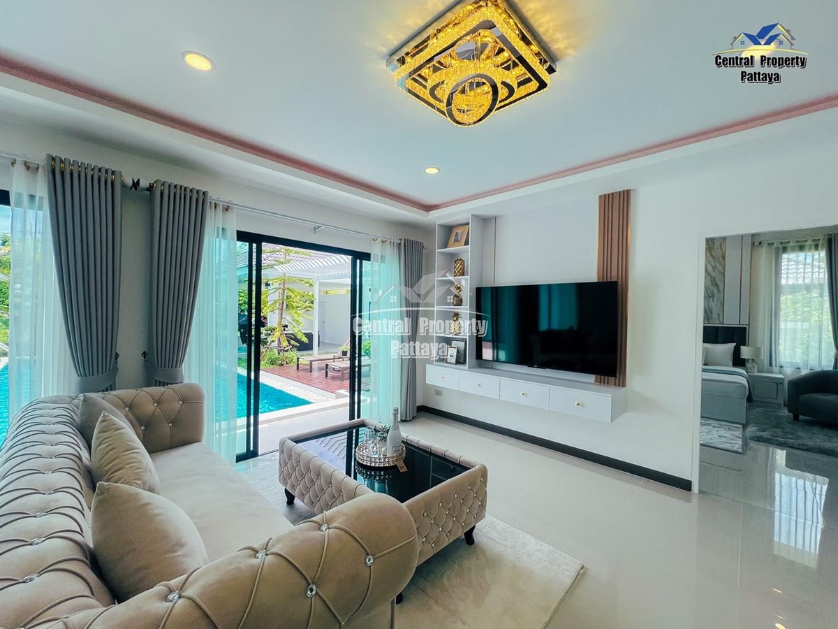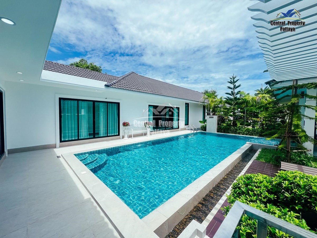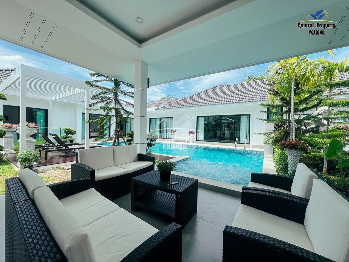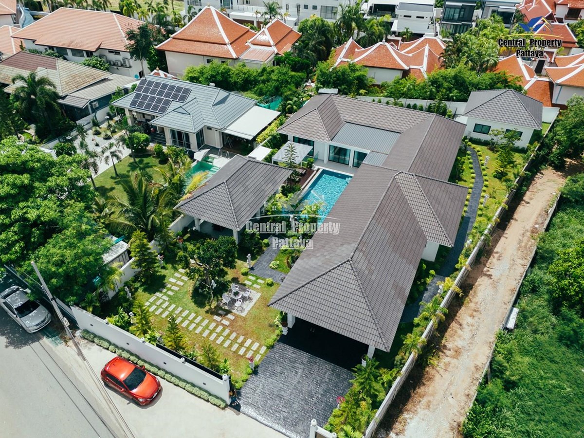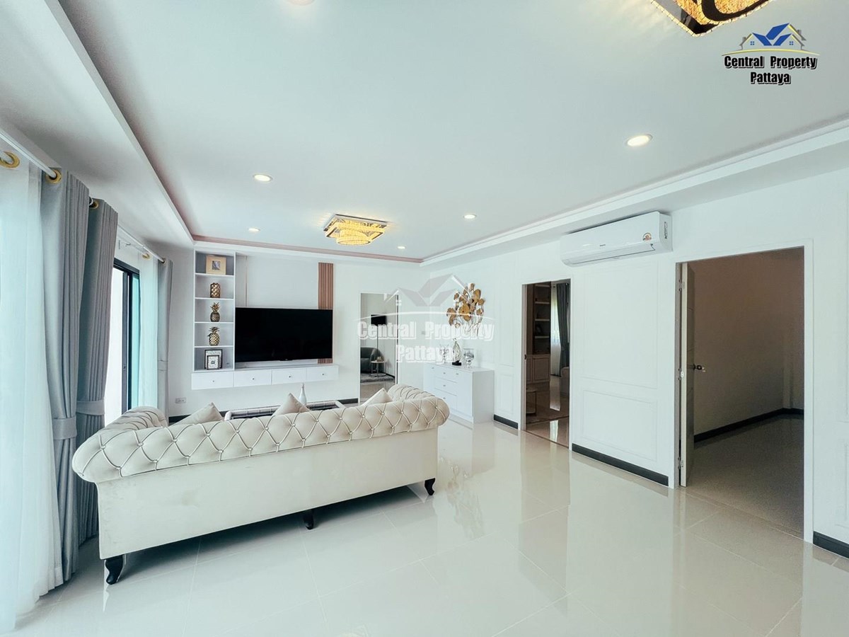 Exceptional 6 bedroom, 8 bathroom house with private pool for sale in Thai/Company name in East Pattaya. The house has been recently completed to a very high standard and is fully furnished, including fitted wardrobes and a professional grade European family kitchen. The bathrooms are all ensuite, spacious and very modern. The materials used throughout are of high quality with local touches used to accentuate the high ceilings and spacious and stylish interior.