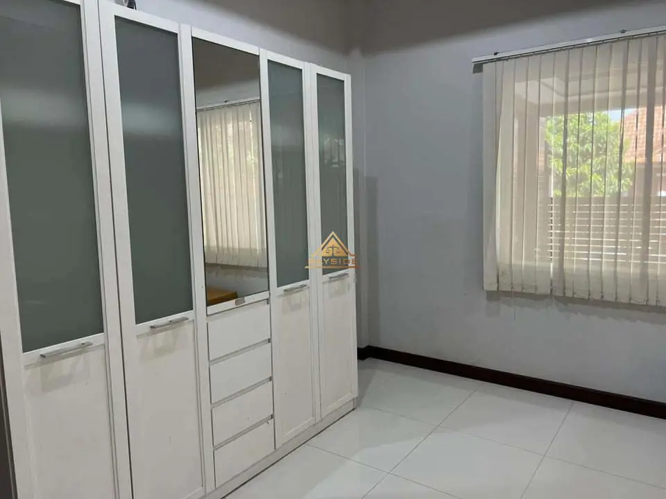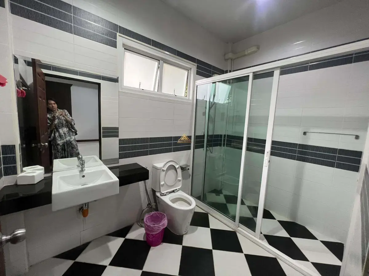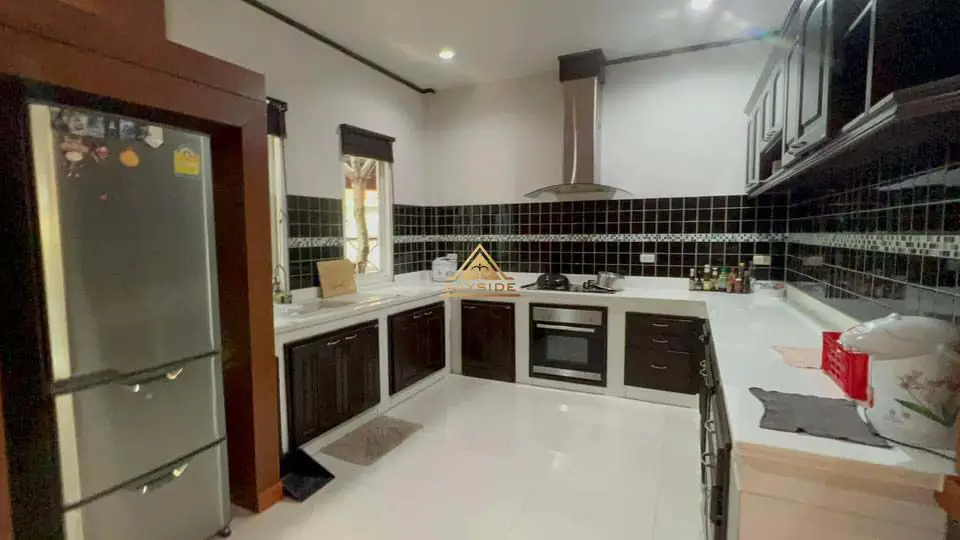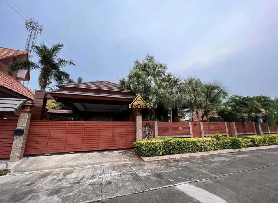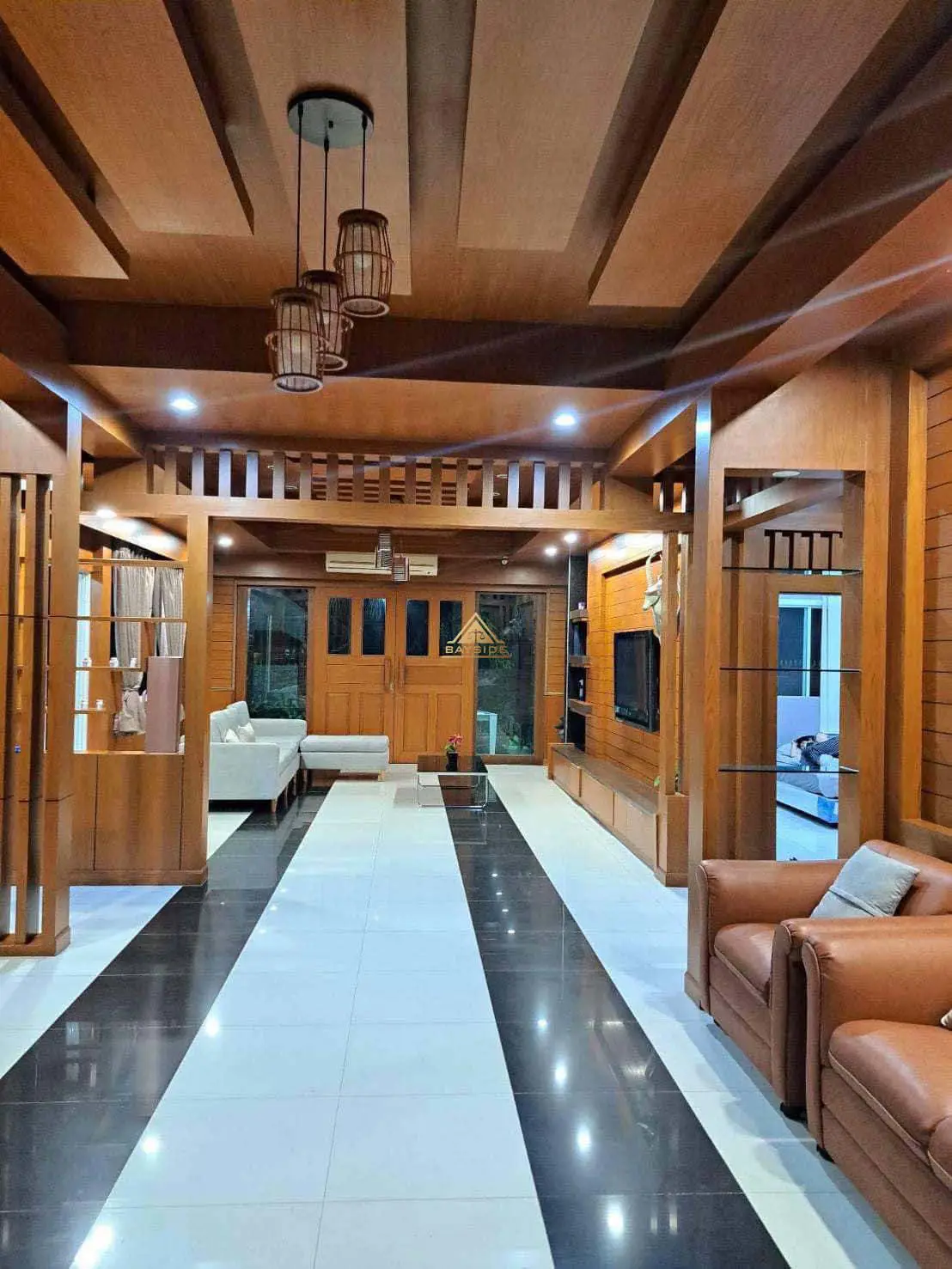 Detached house, pool villa, one floor, 3 bedrooms, 3 bathrooms, 1 guest house, Thai style has a Thai kitchen, Western kitchen, koi pond with pavilion. large swimming pool Poolside shower and a pavilion for living next to the pool and garden, decorated in teak wood style throughout. Very good condition,