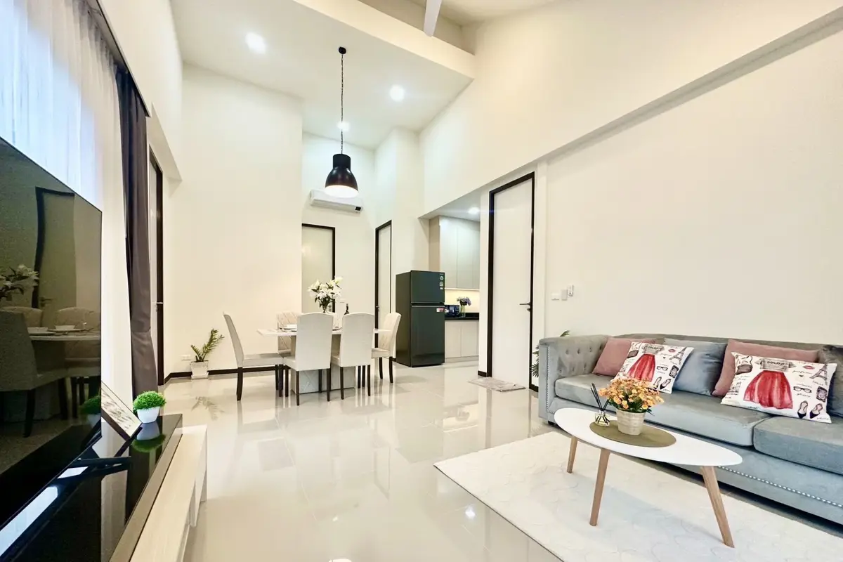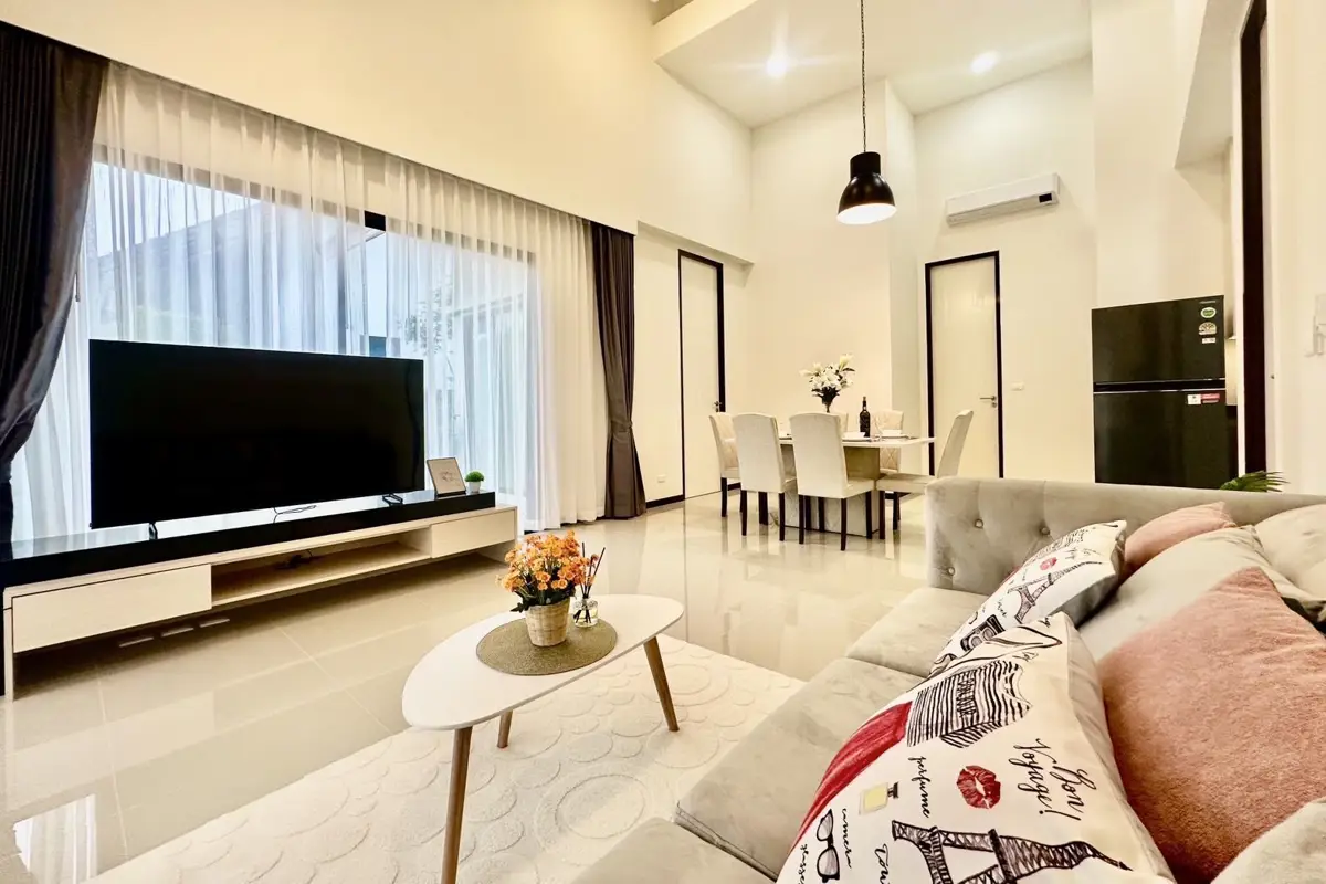 🔸 TV table 🔸 Samsung 65" TV 🔸 2.5m sofa set with central table 🔸 Built-in kitchen set 🔸 Electric stove + hood 🔸oven 🔸microwave 🔸 Refrigerator 14.5 Q 🔸 Dining Table Set 🔸 Built-in Kit wardrobe 🔸 6ft and 5ft beds 🔸 2 bathroom hot water heaters 🔸 3 air conditioners 🔸 Curtains for the whole house. 🔸 Water Pump with 1600 Liter Built-in Water Reserve Tank