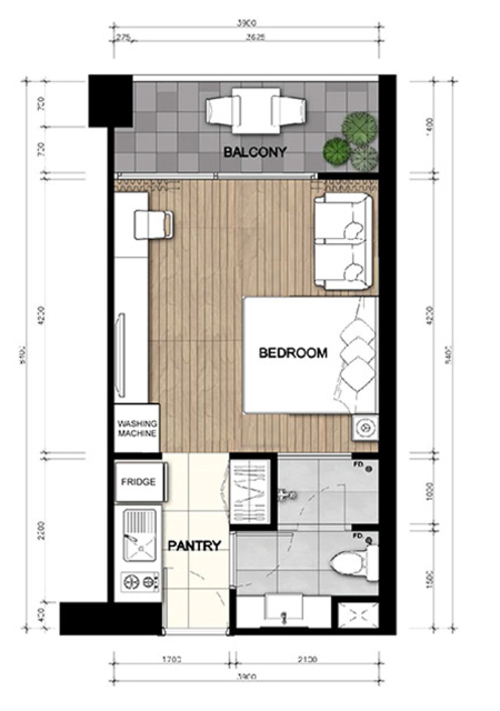 One of the very few studio apartments with an in-built washing machine and extra storage cupboards.