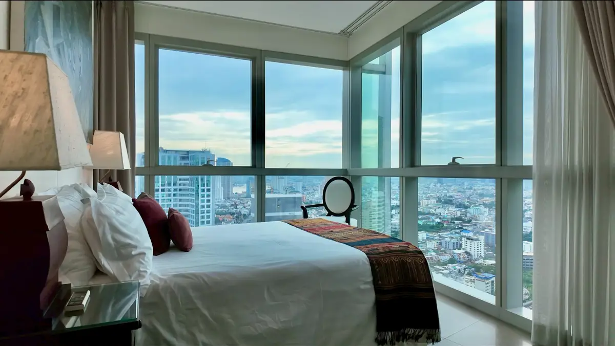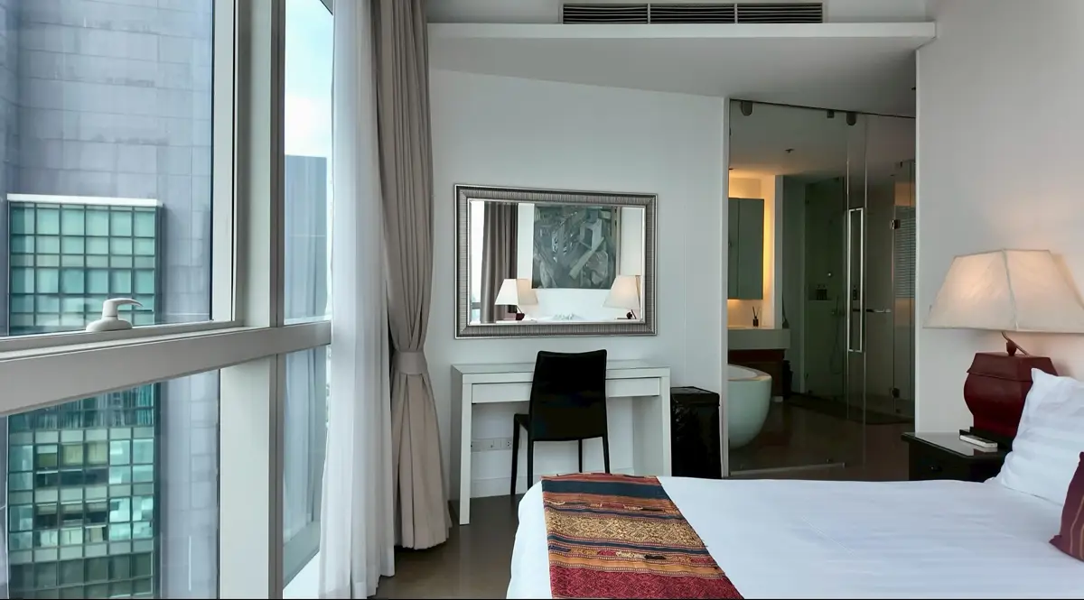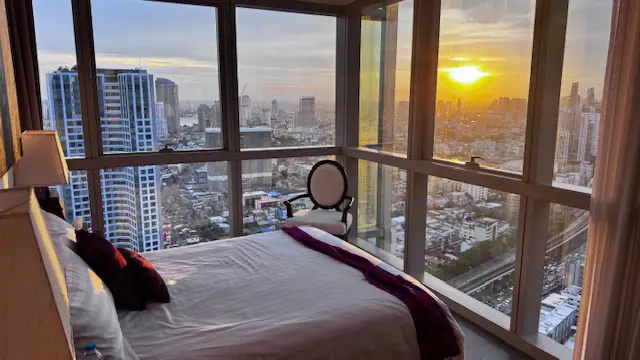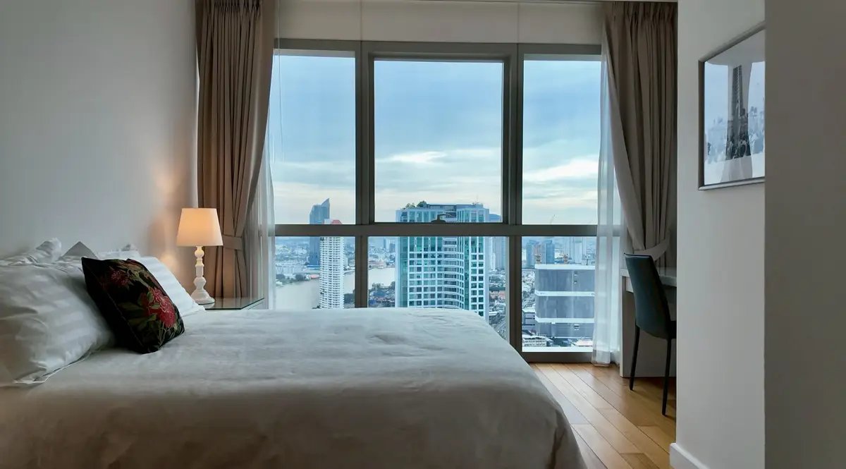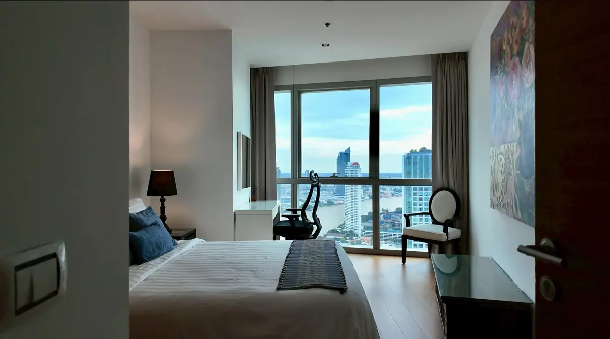 The project features two striking towers rising 71 and 42 storeys, housing over 800 residential units designed with elegance and modern comfort in mind. Each residence offers floor-to-ceiling windows, spacious layouts, and panoramic river and city views, ensuring a serene and exclusive living experience. This is a 3 bedroom, 2.5 bathroom corner unit residence available to rent. The property is fully furnsihed with contemporary decor, has an expansive open-plan living and dining area with floor to ceiling windows with panoramic views over the Chao Phraya River from every room. There is a European kitchen with premium appliances, large master suite with freestanding bathrub and dressing area and private balcony with sunset river views. The property measures 140 sqm and is on the 40th floor facing South.