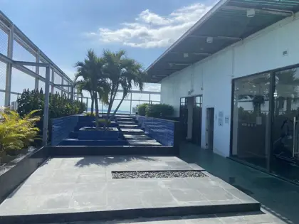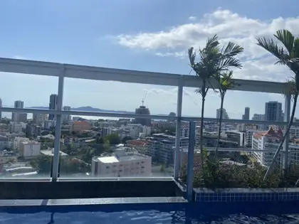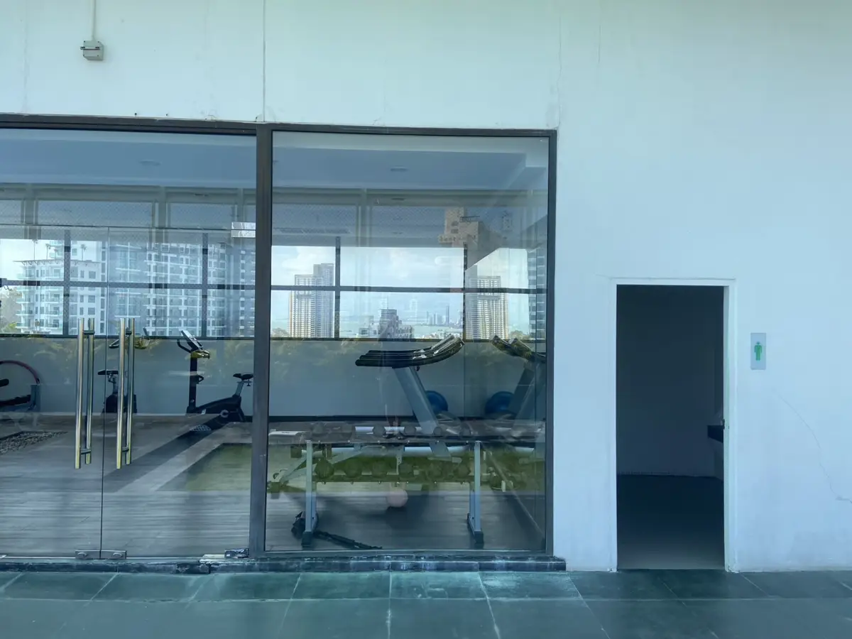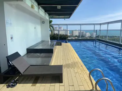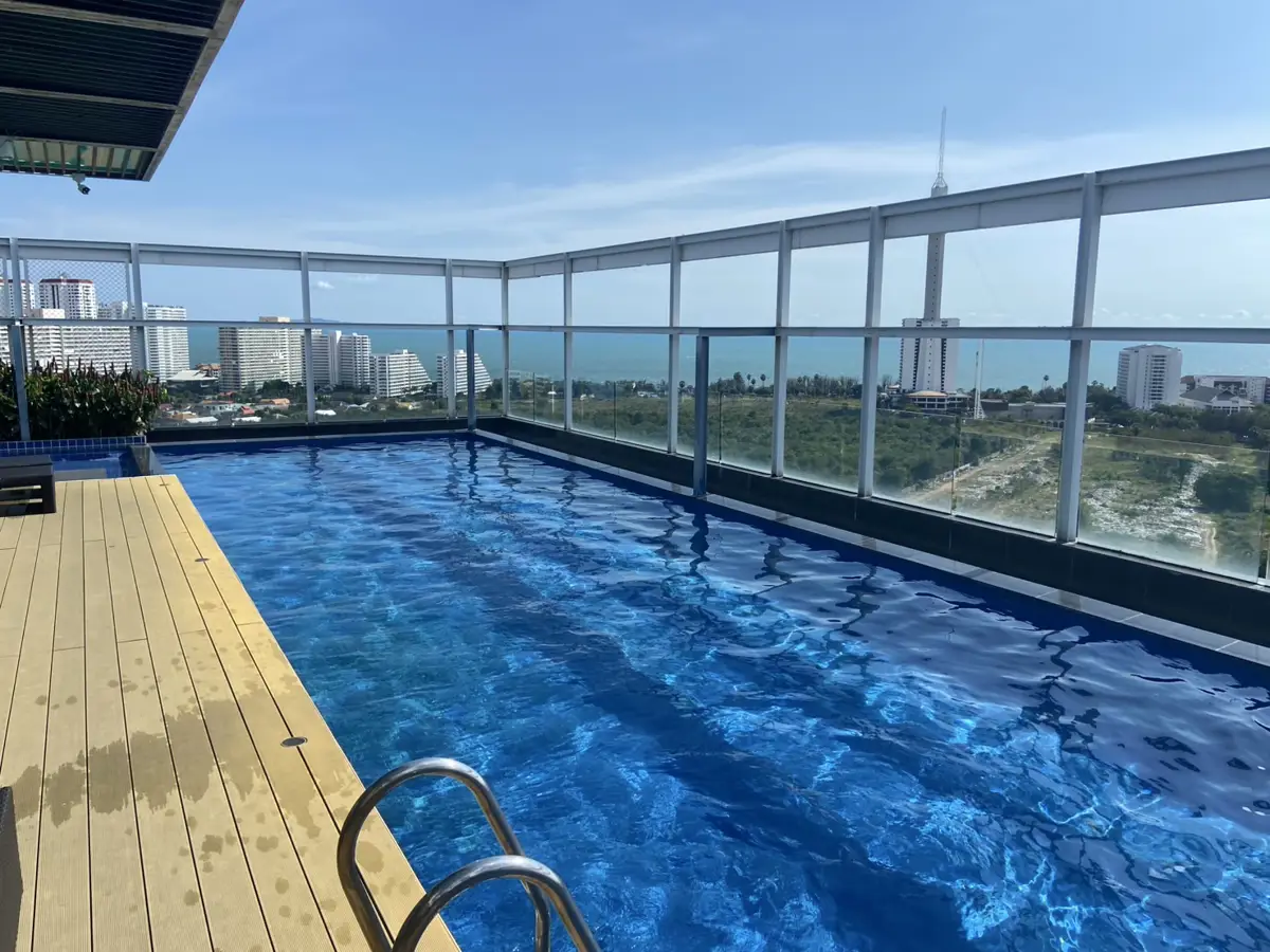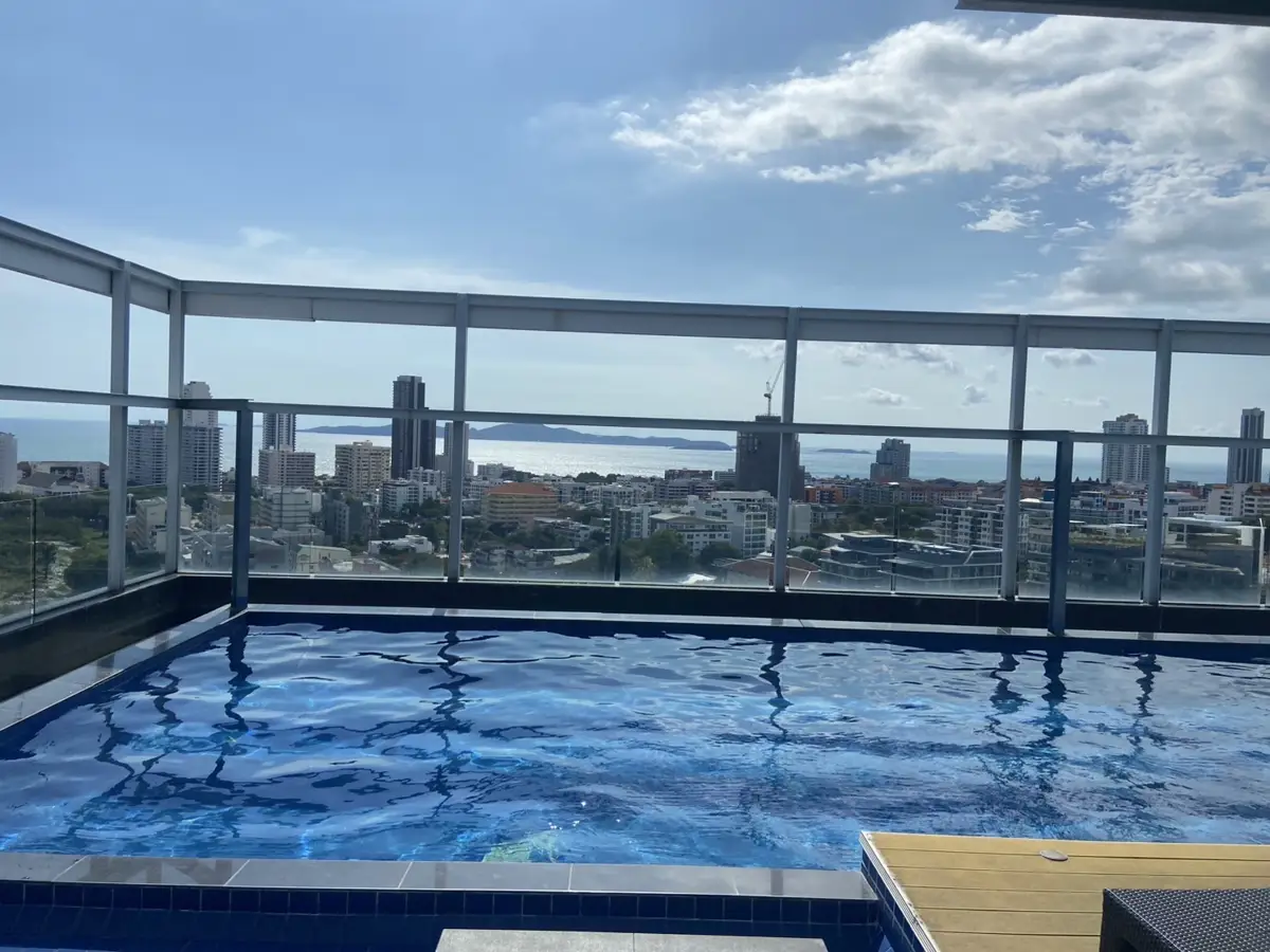 rooftop infinity edge swimming pool offering unobstructed views of Pattaya city and the ocean, a modern and fully equipped sky fitness room,