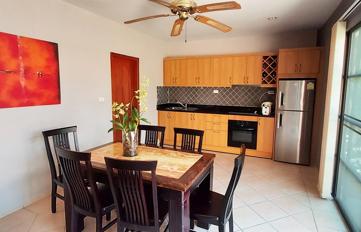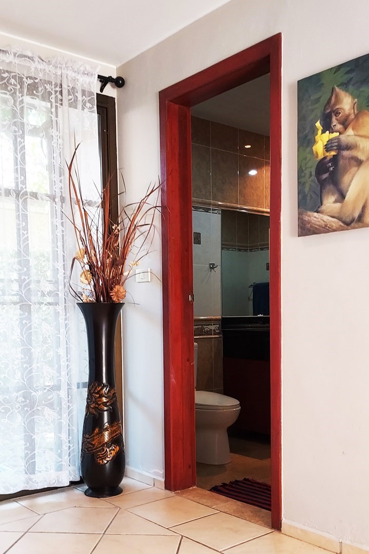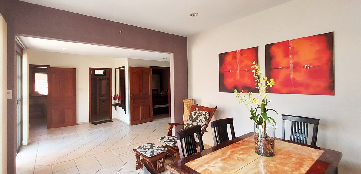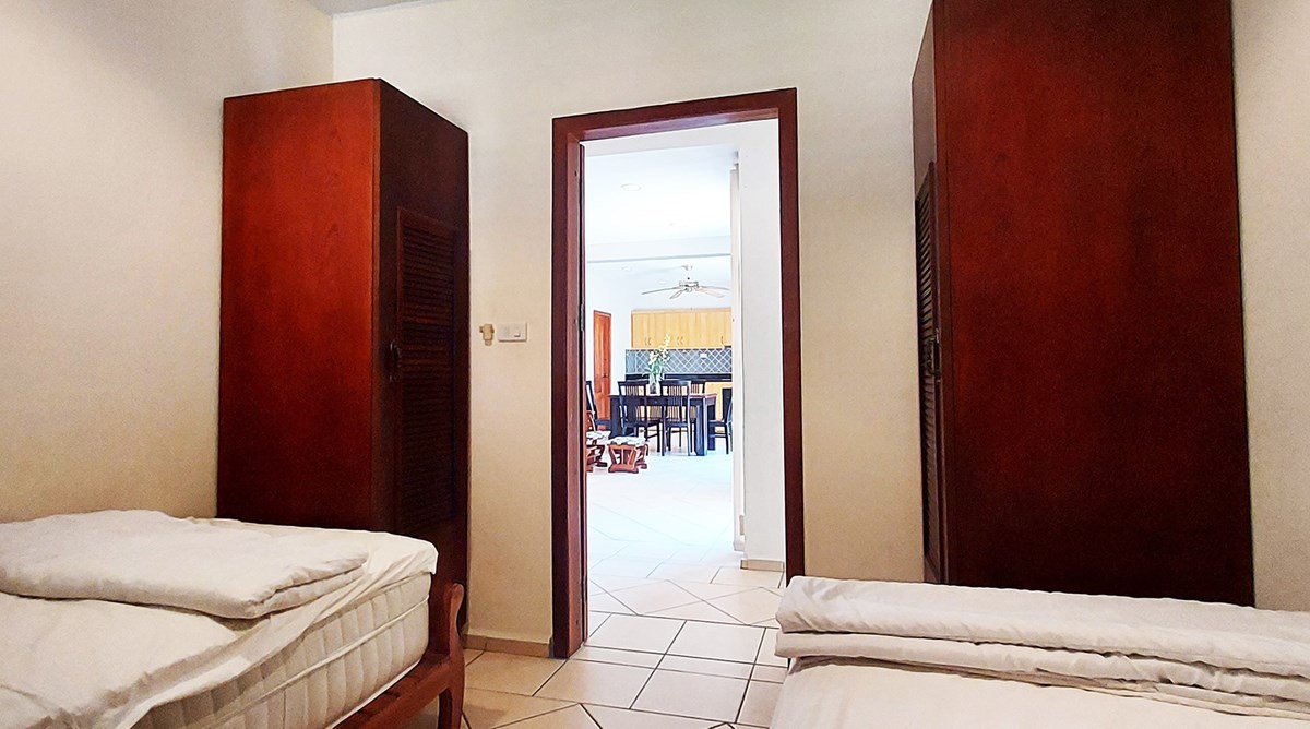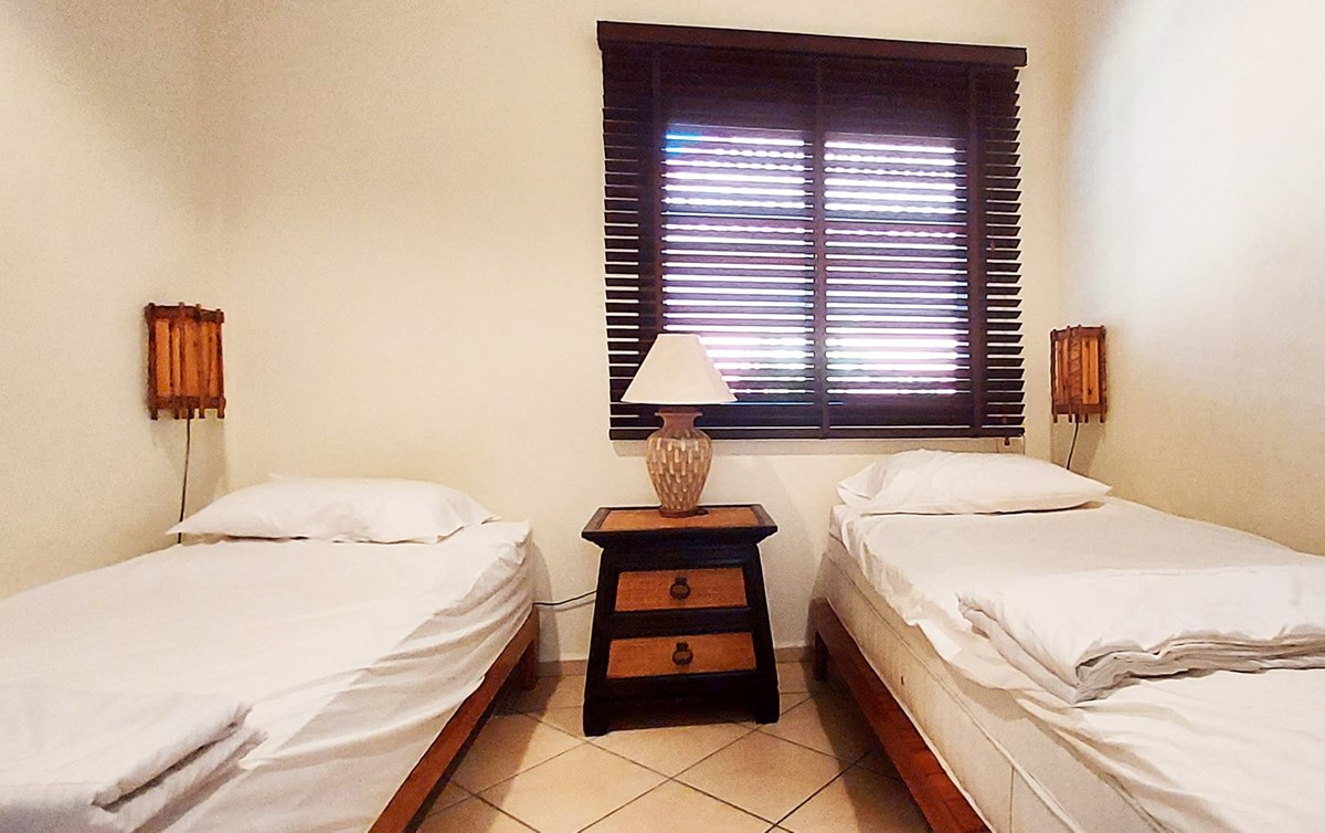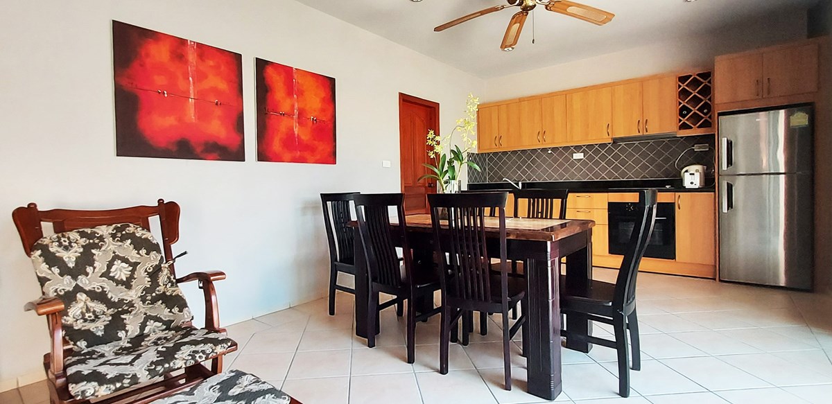 The kitchen is equipped with a 4-plate stove with oven, fridge and freezer and many storage cupboards. The bathrooms are fully tiled. AC in all rooms. There are fans in the dining room, living room and on the terrace. Both bedrooms have wardrobes. Mosquito screens for all windows.