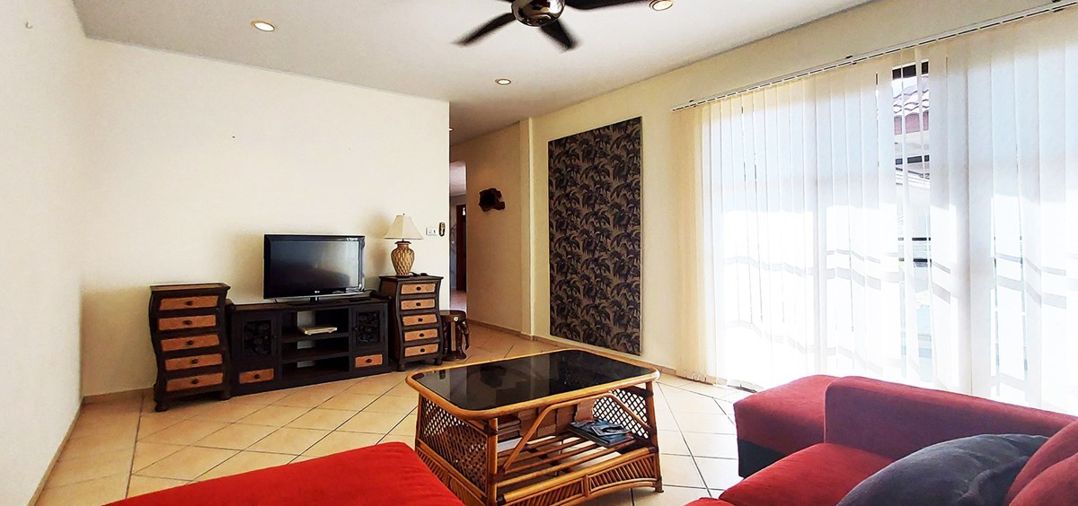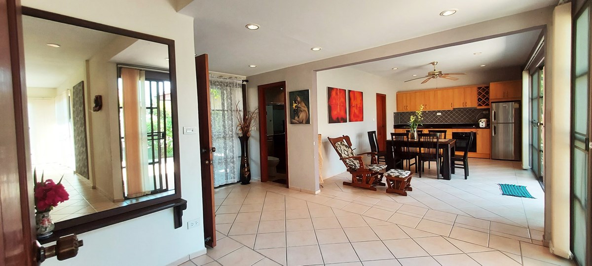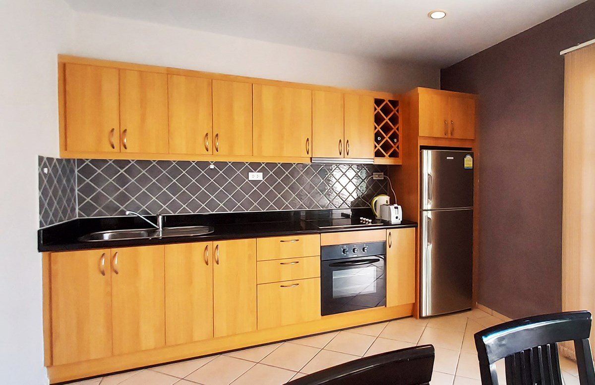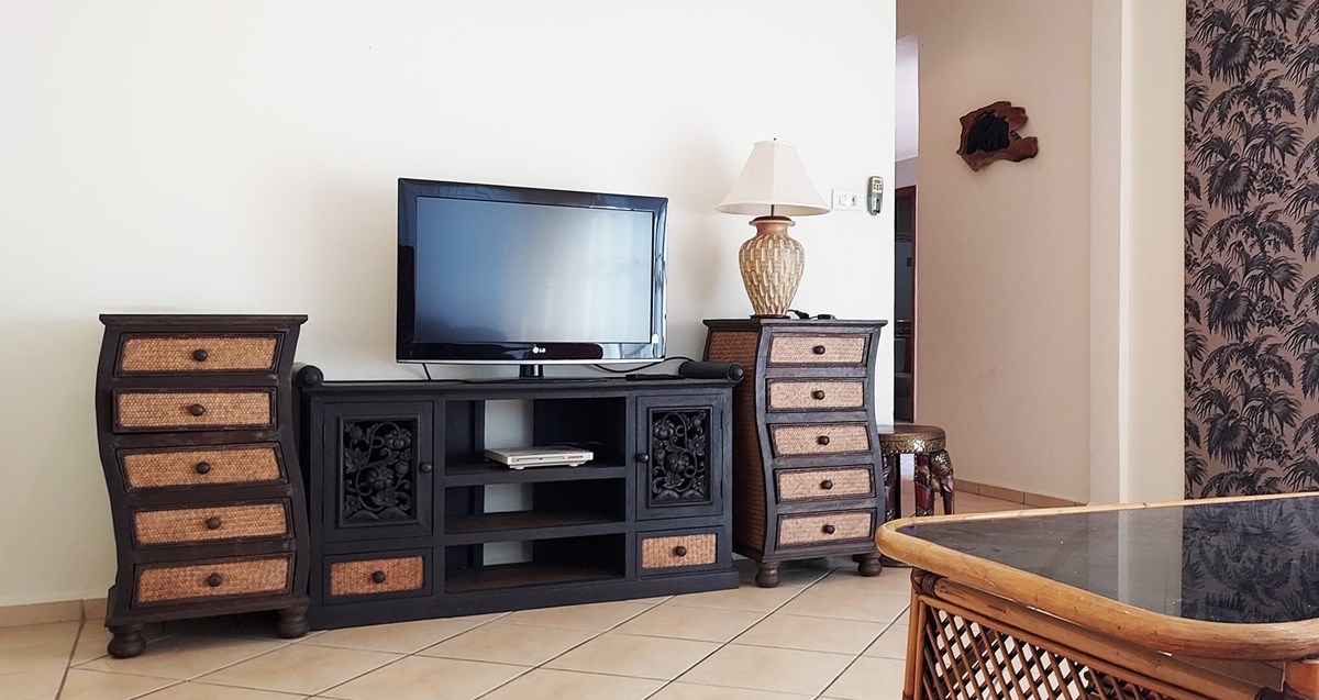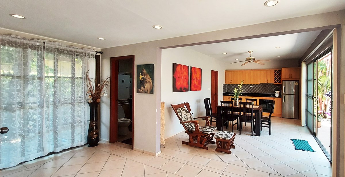 The kitchen is equipped with a 4-plate stove with oven, fridge and freezer and many storage cupboards. The bathrooms are fully tiled. AC in all rooms. There are fans in the dining room, living room and on the terrace. Both bedrooms have wardrobes. Mosquito screens for all windows.
