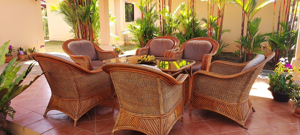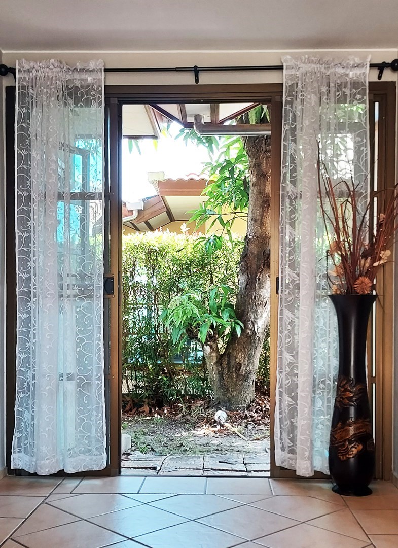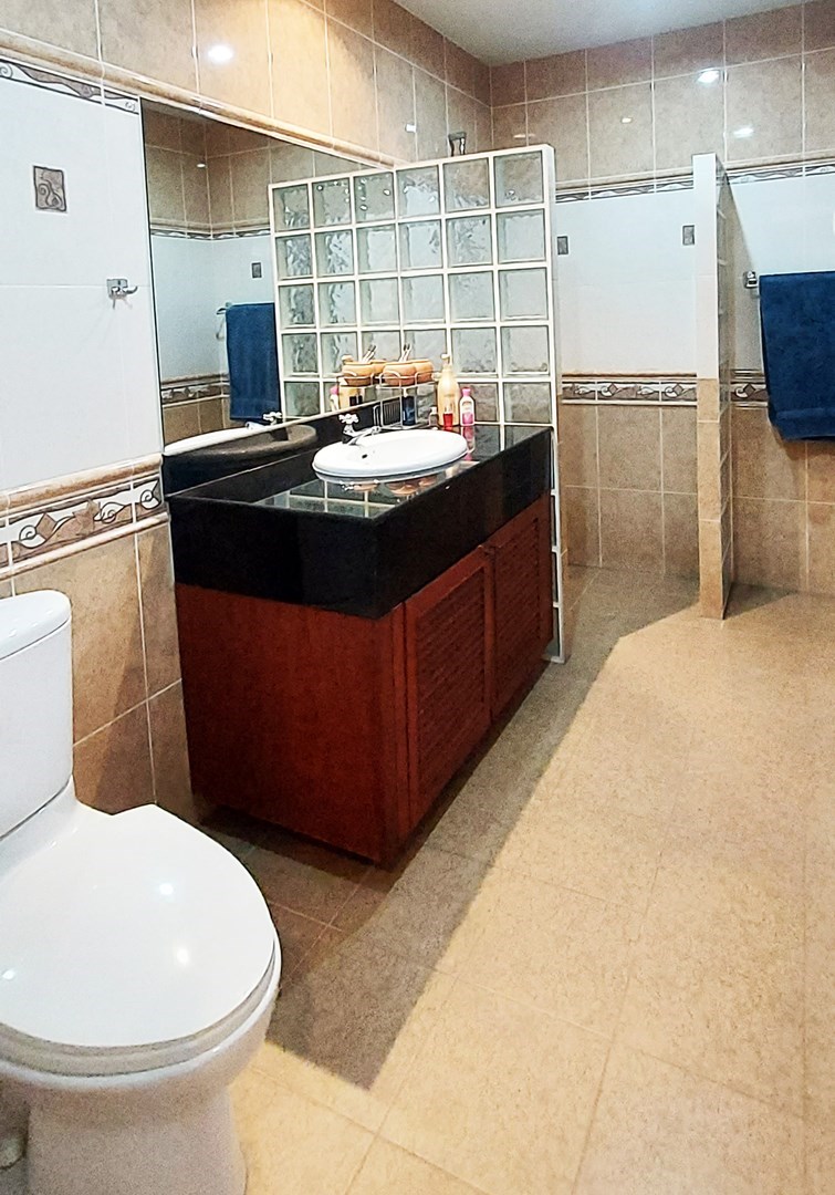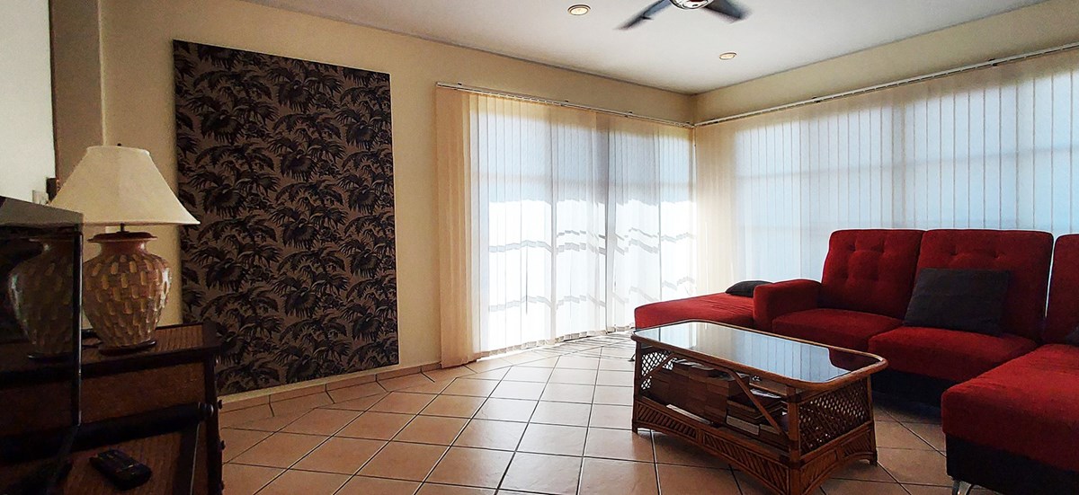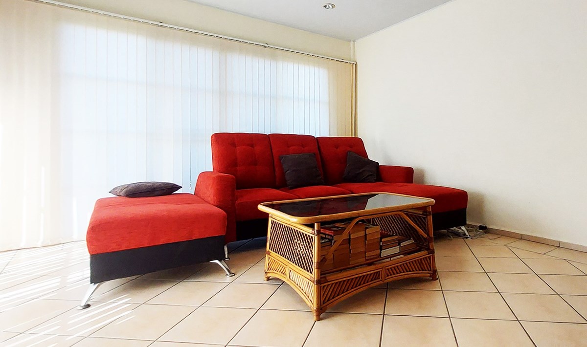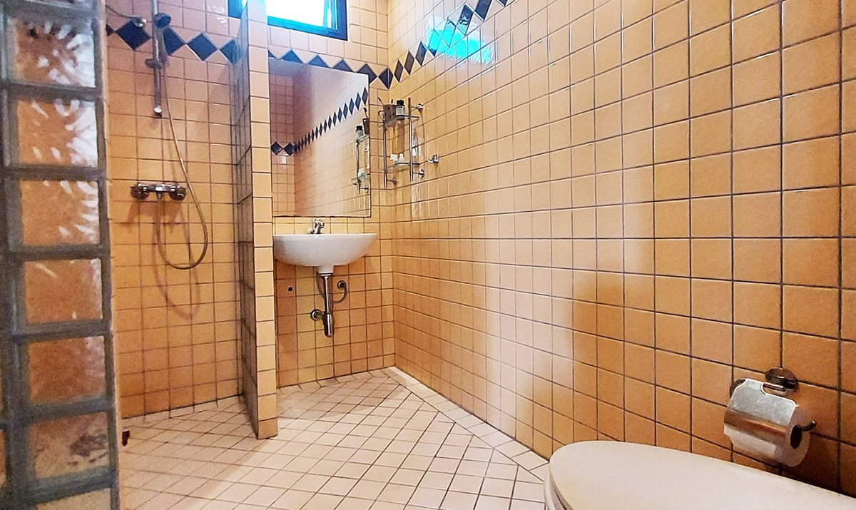 The kitchen is equipped with a 4-plate stove with oven, fridge and freezer and many storage cupboards. The bathrooms are fully tiled. AC in all rooms. There are fans in the dining room, living room and on the terrace. Both bedrooms have wardrobes. Mosquito screens for all windows.