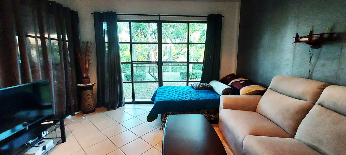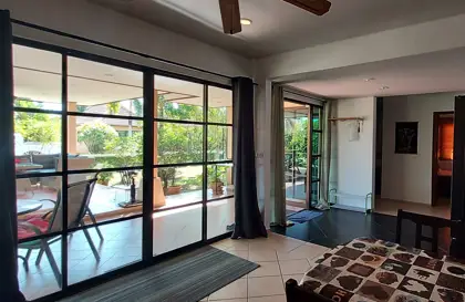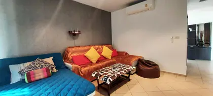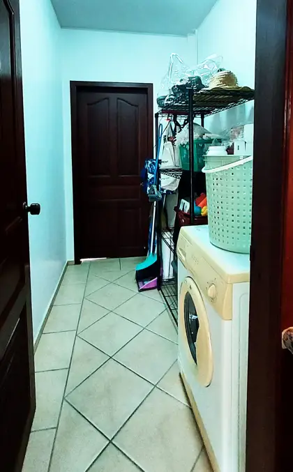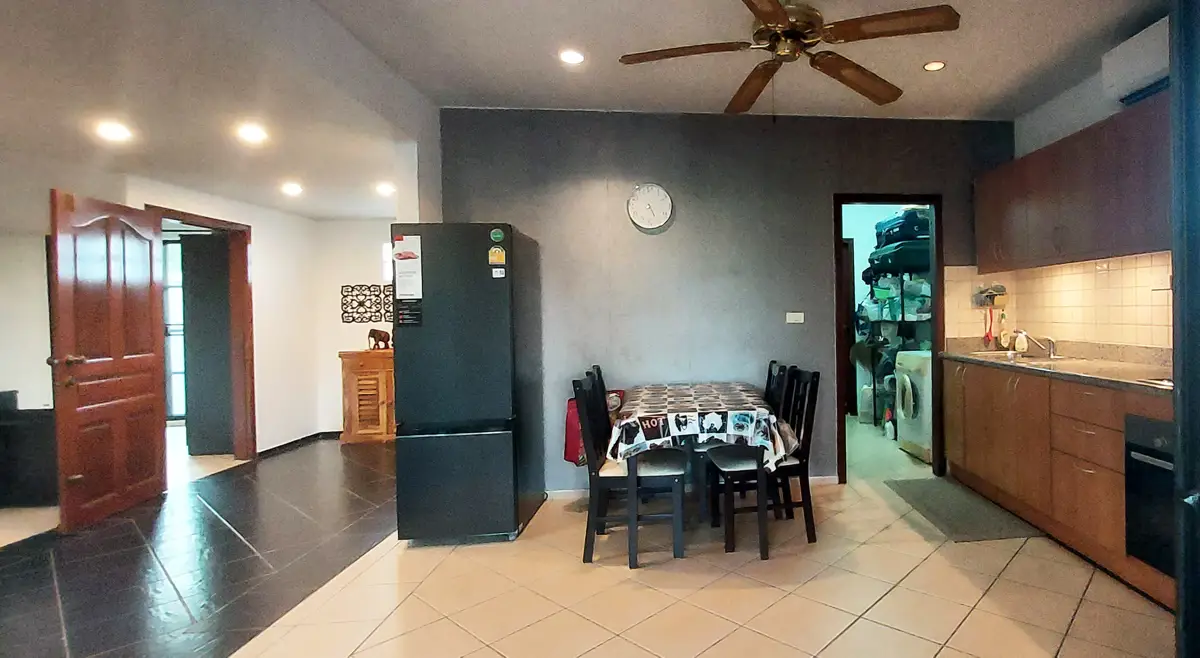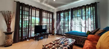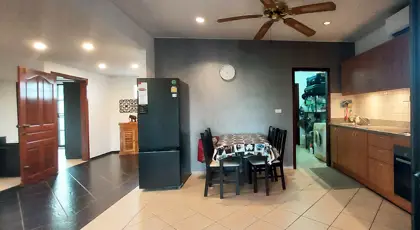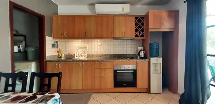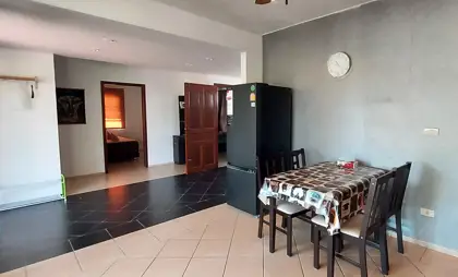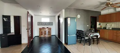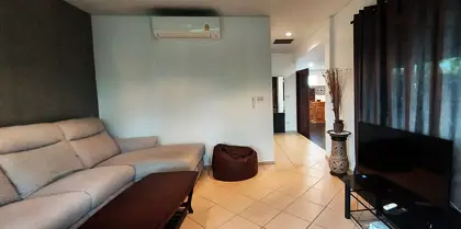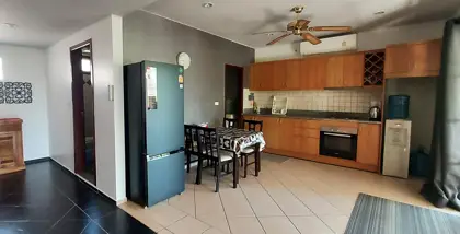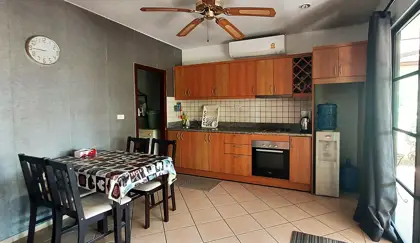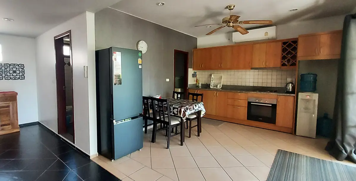 The kitchen is equipped with a 4-plate stove with oven and many storage cupboards. The bathroom are fully tiled. AC in all rooms. There are fans in the dining room, living room and on the terrace. Both bedrooms have wardrobes. Mosquito screens for all windows.