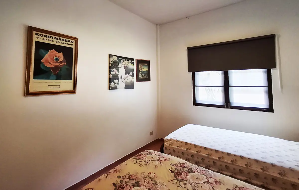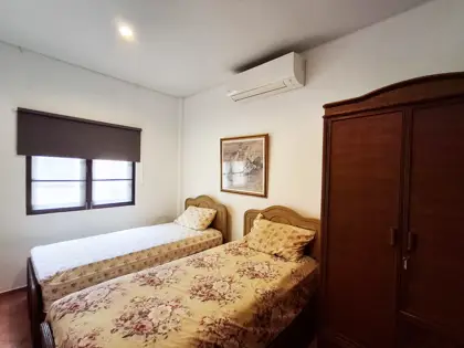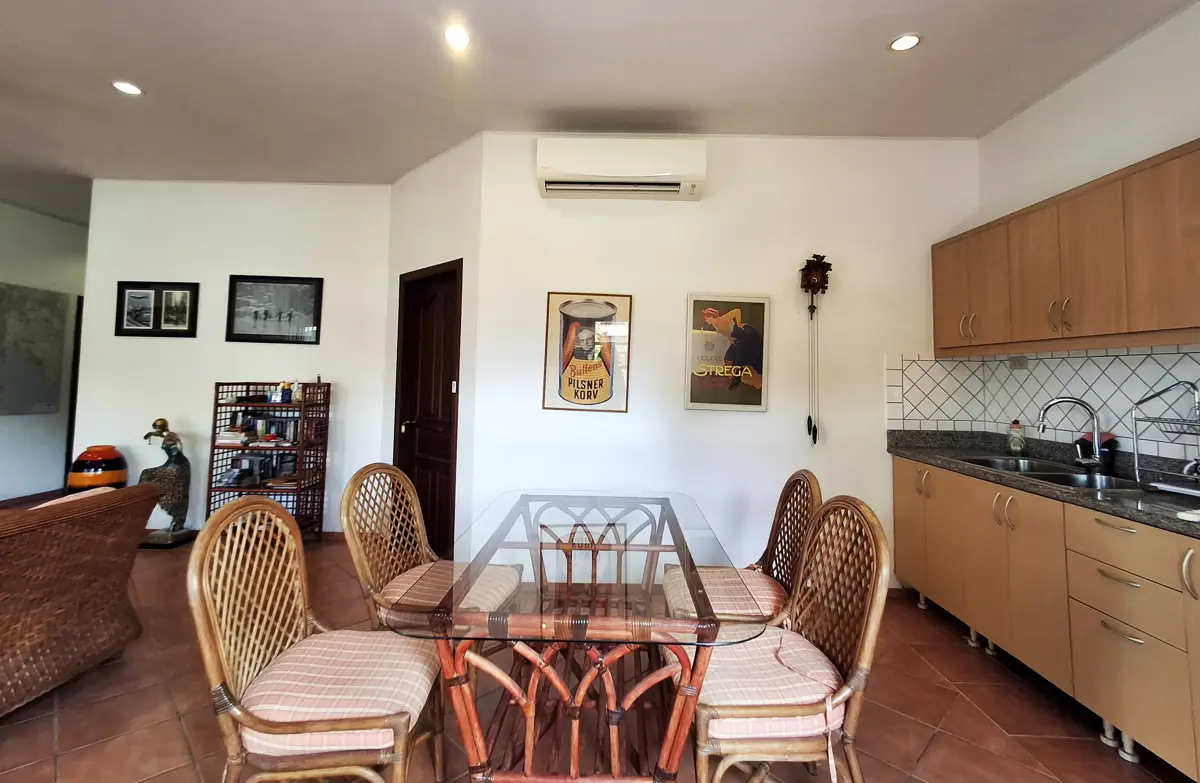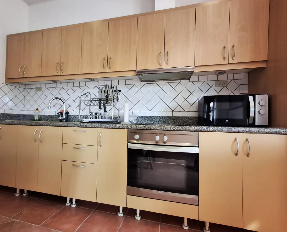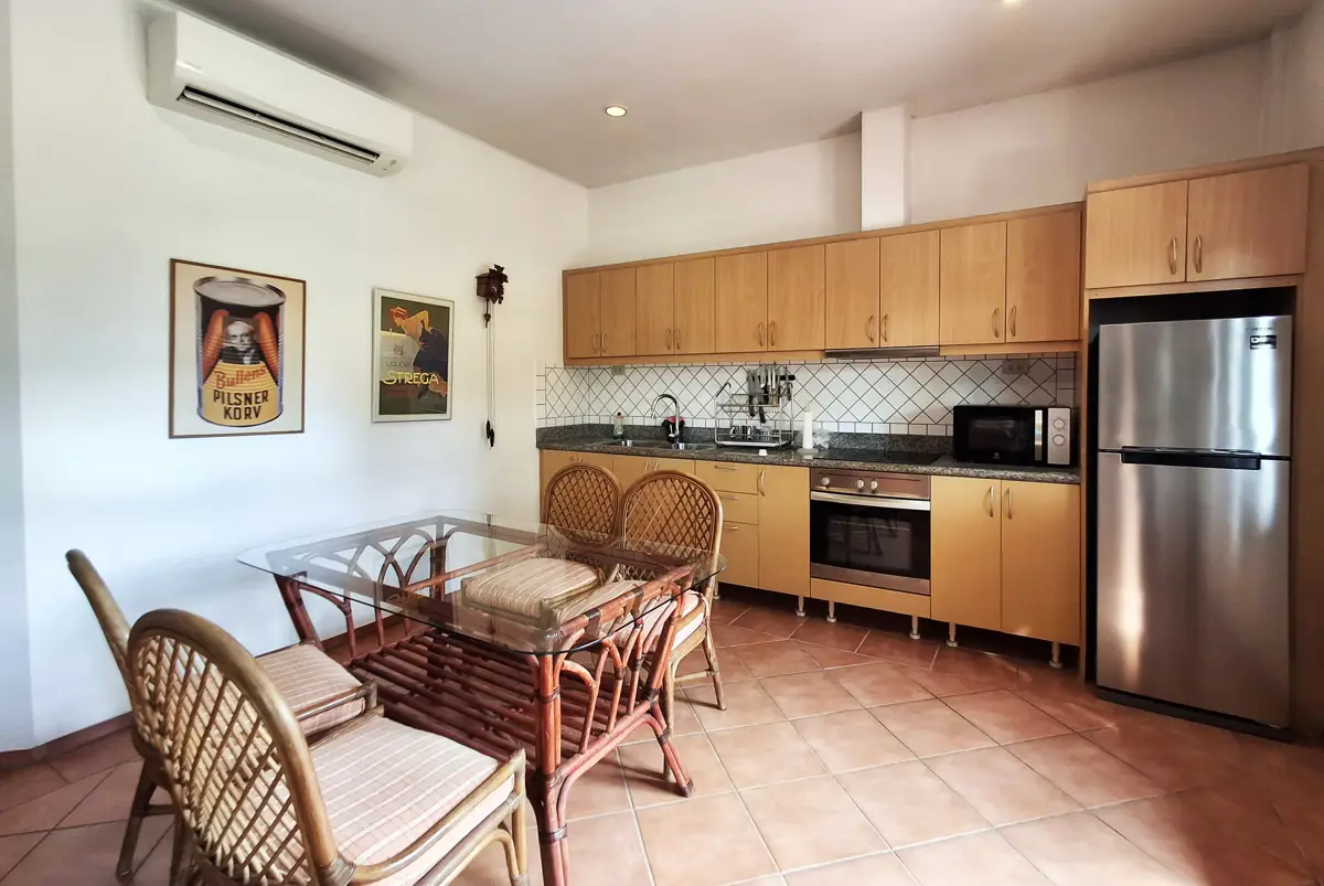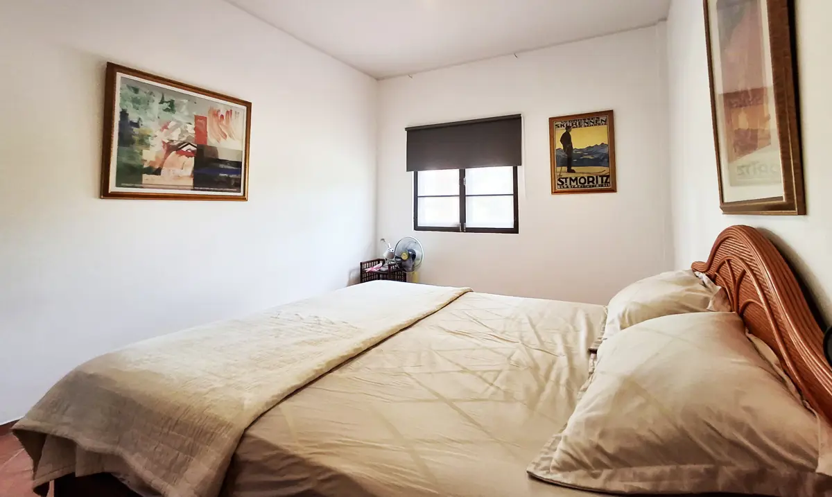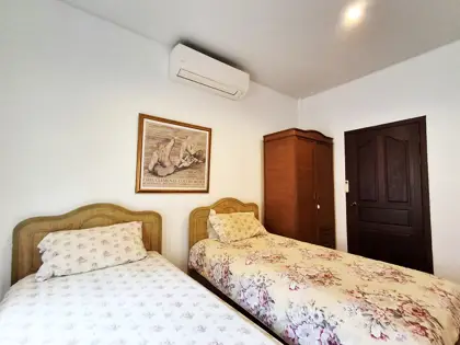 Two of the bedrooms have double beds, while the third has 2 single beds. All three bedrooms, as well as the kitchen/living room have AC. The living room and terrace have ceiling fans. Both bathrooms are fully tiled.