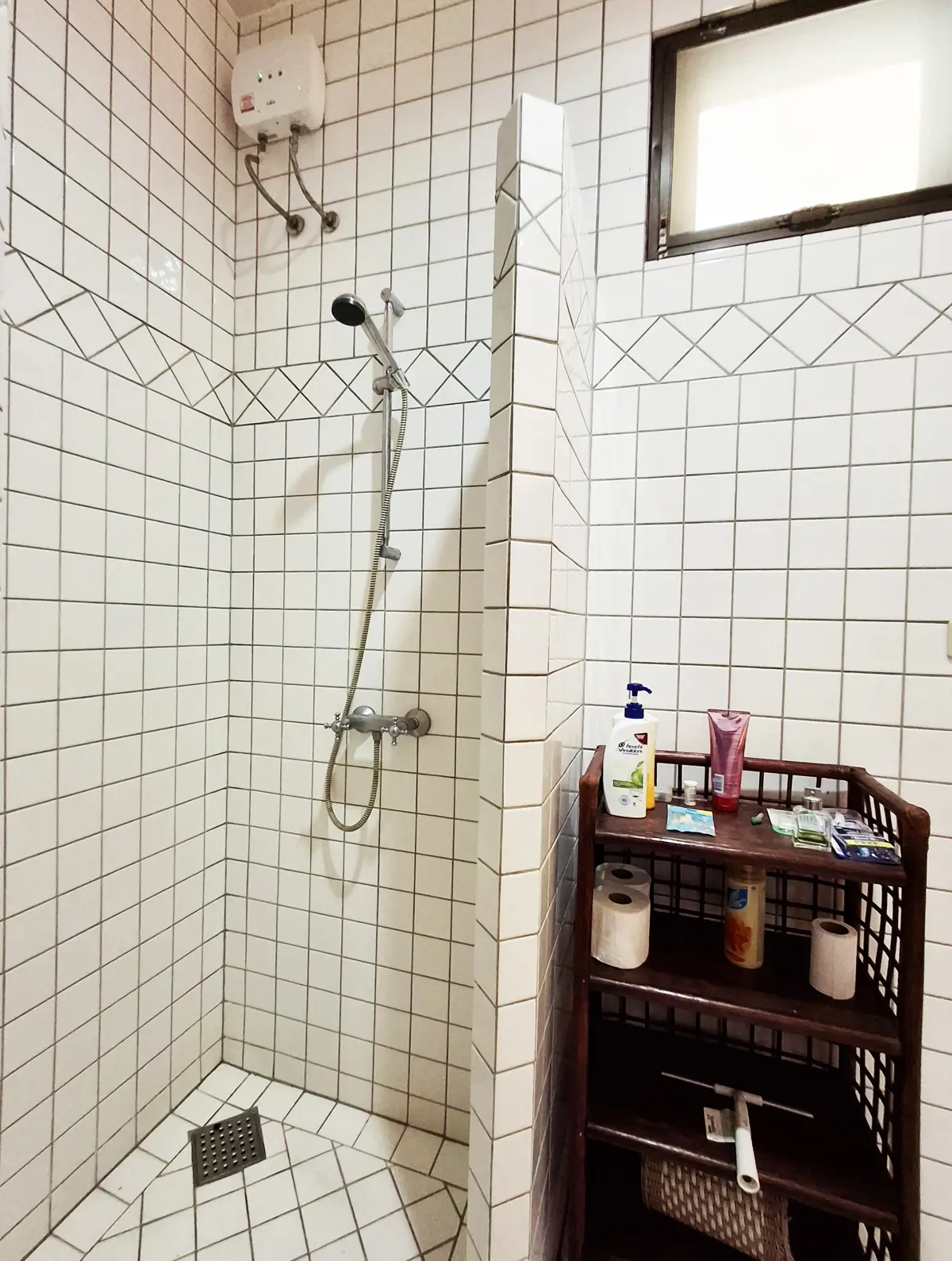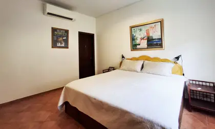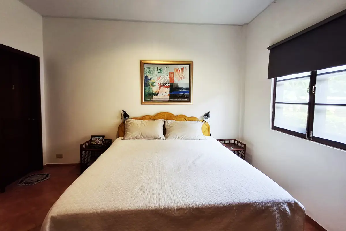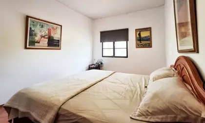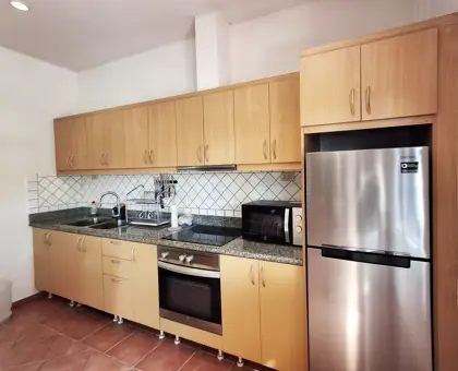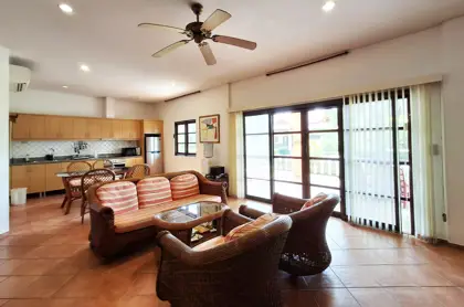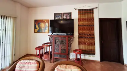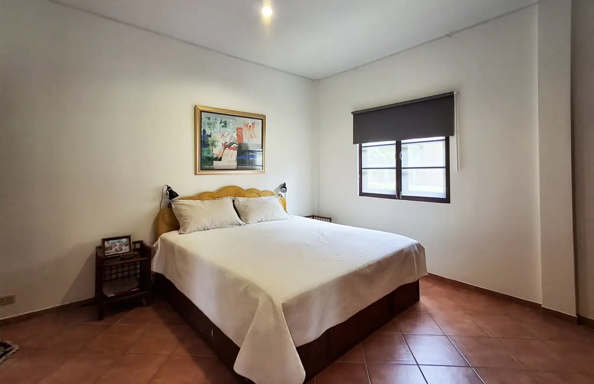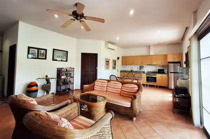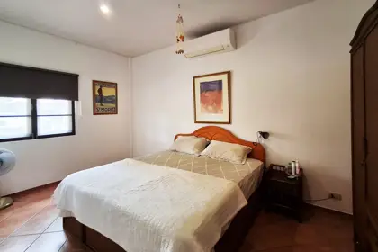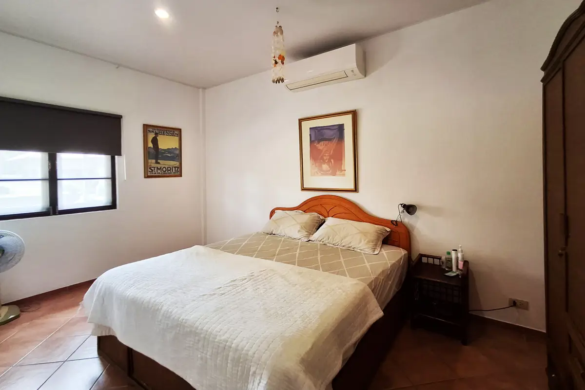 Two of the bedrooms have double beds, while the third has 2 single beds. All three bedrooms, as well as the kitchen/living room have AC. The living room and terrace have ceiling fans. Both bathrooms are fully tiled.