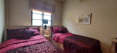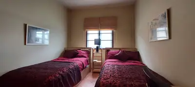 One of the bedrooms has a double bed, while the other bedroom has 2 double beds and a desk.