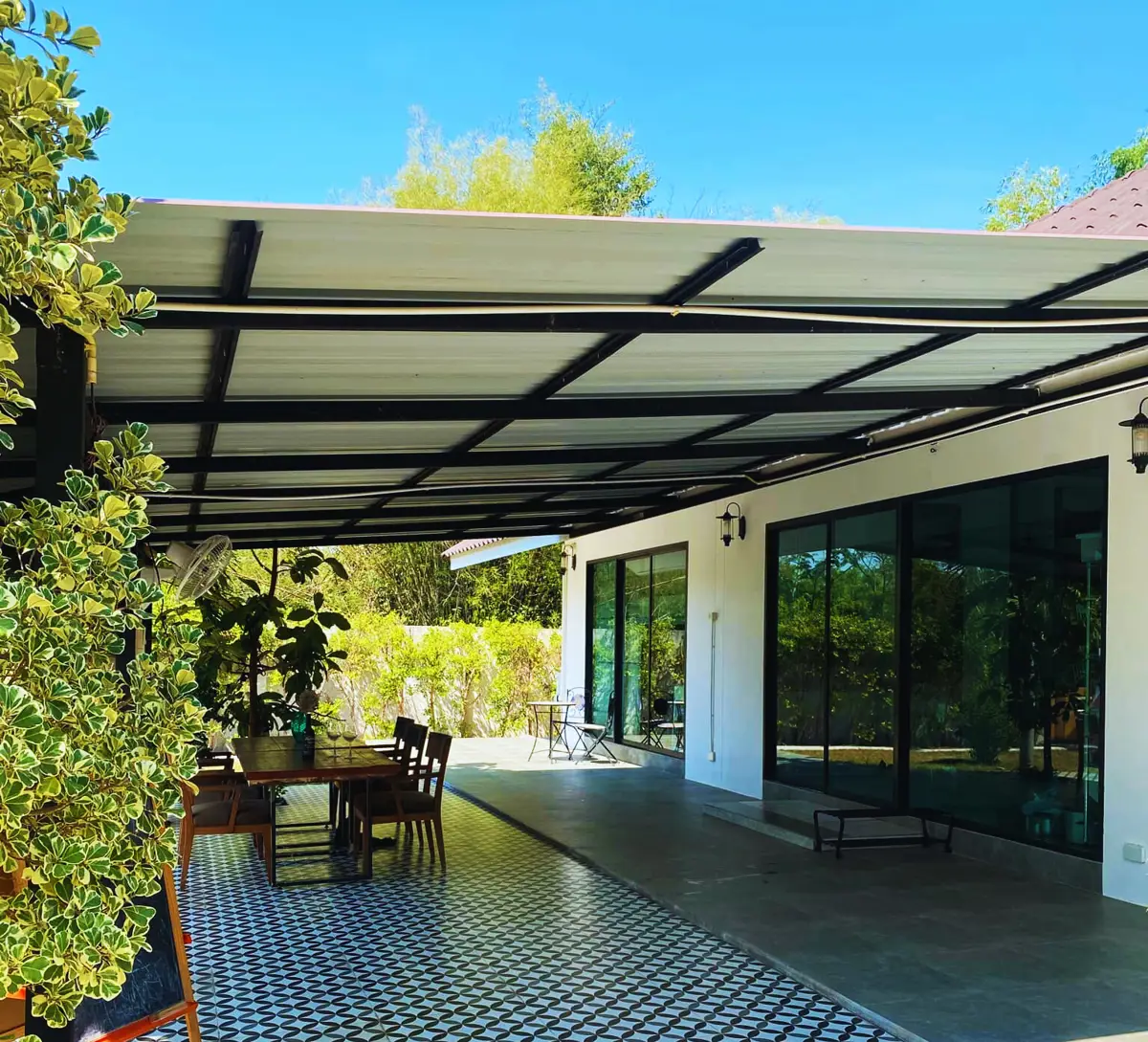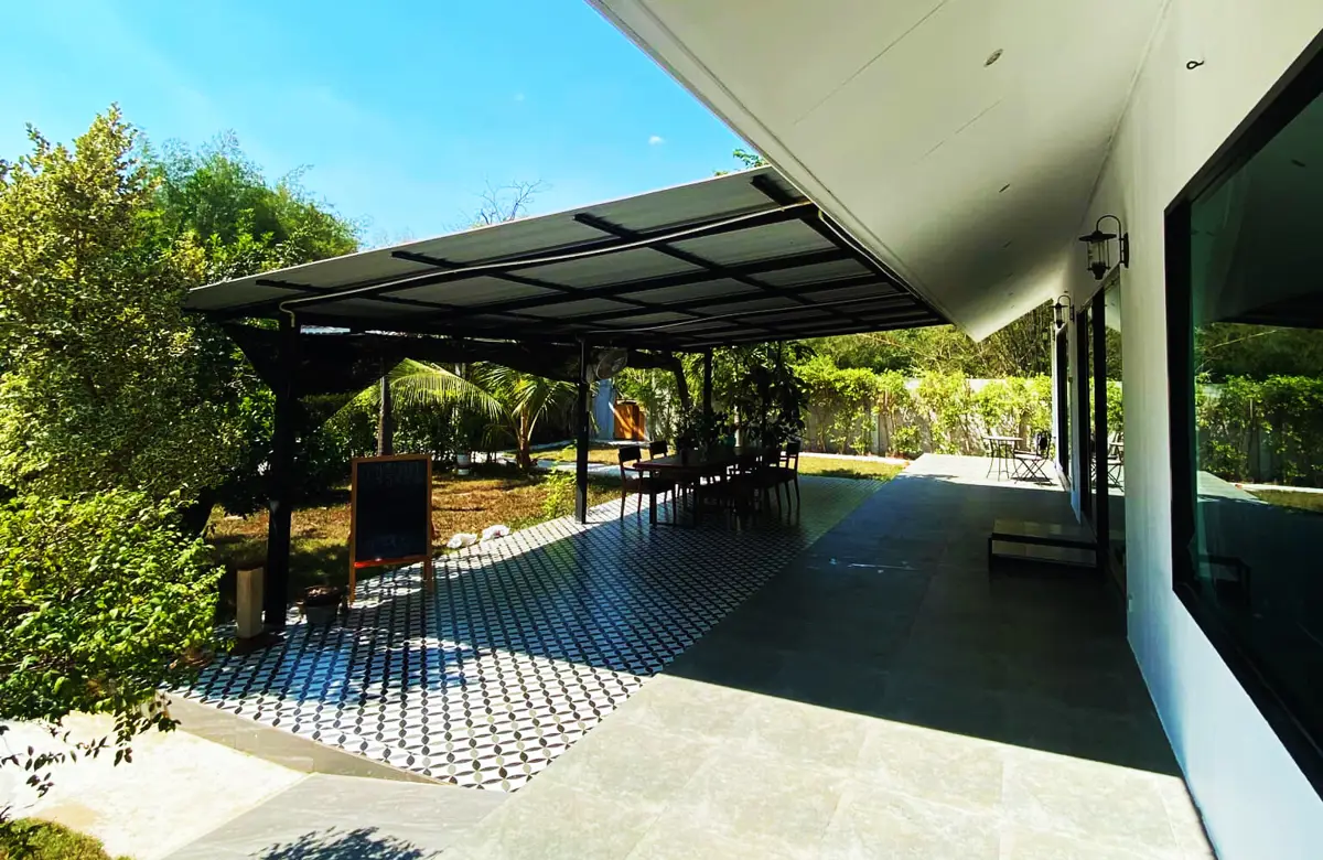 Large slightly raised, paved, outside patio under roof. Perfect for having friends over, bbq etc. This area facing a lovely garden with palms, fruit trees, flowers and lawns.