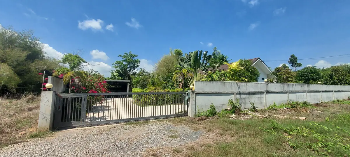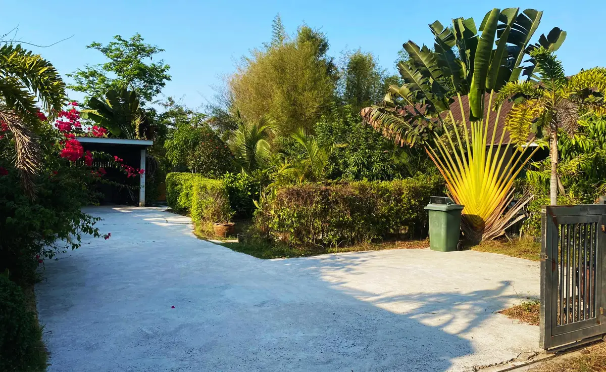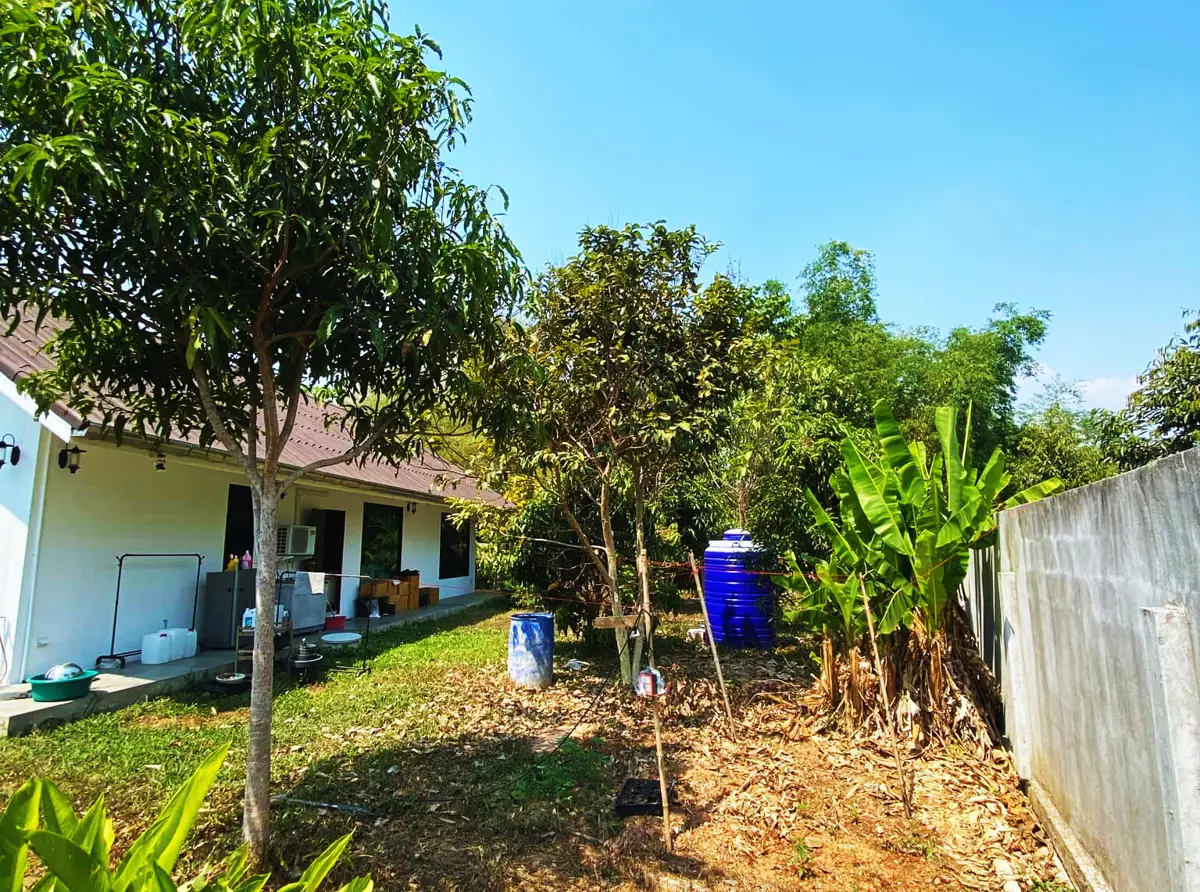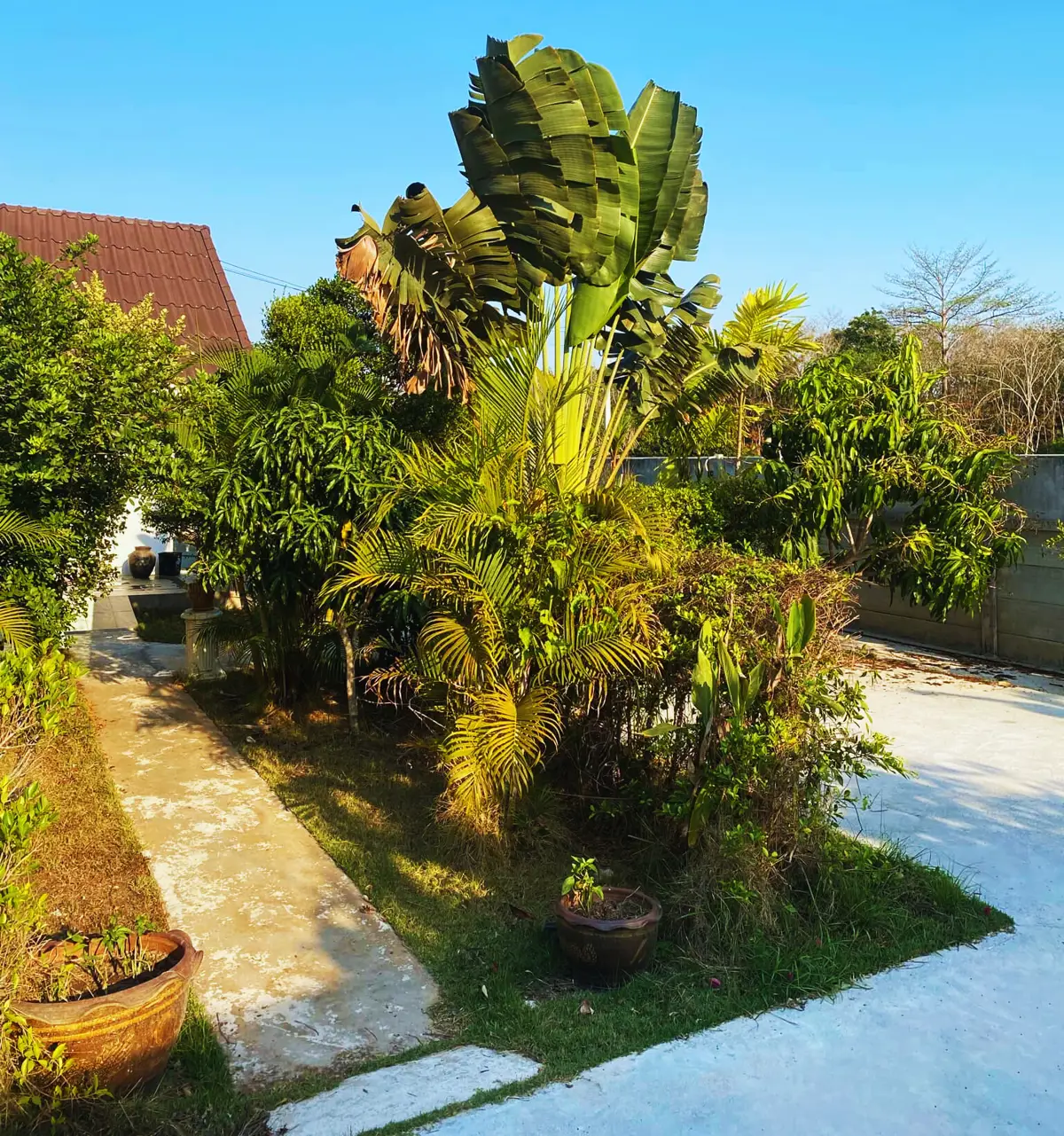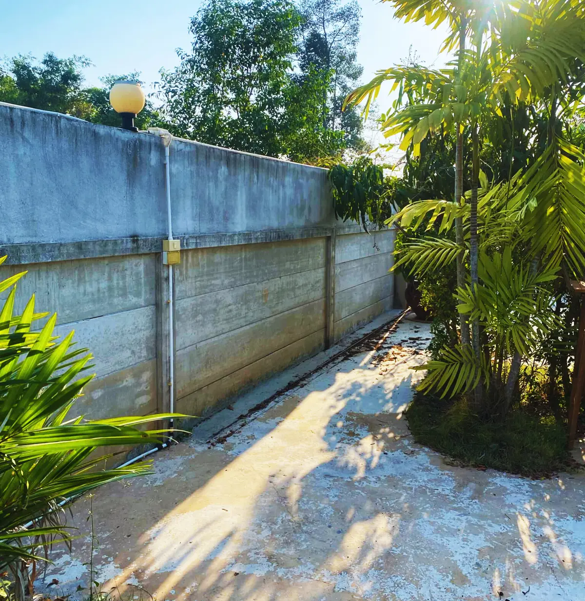 This property consists of a beautifully situated, nature integrated house set in a lush, 956 sqm tropical garden surrounded by a 2 m high wall (with outside height 4 m on two sides) with built-in lights. Even though the location is within a sleepy little village there are no direct neighbours. One side faces a Durian plantation, one a nature area with large bamboo and a small mountain creek. Theres a gate from the property on this side since the area can be utilized by the owner. The other two sides face empty plots.
