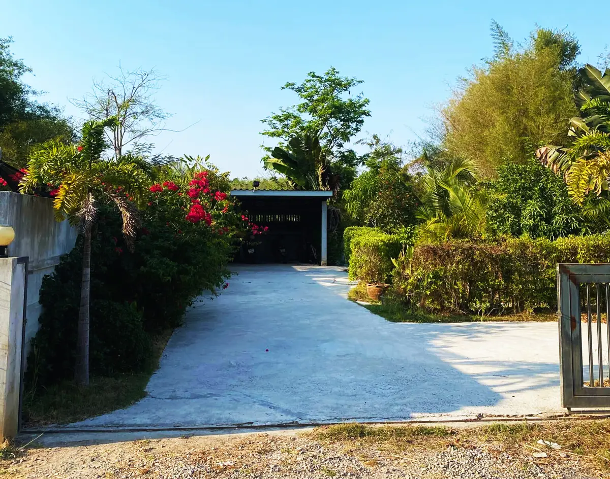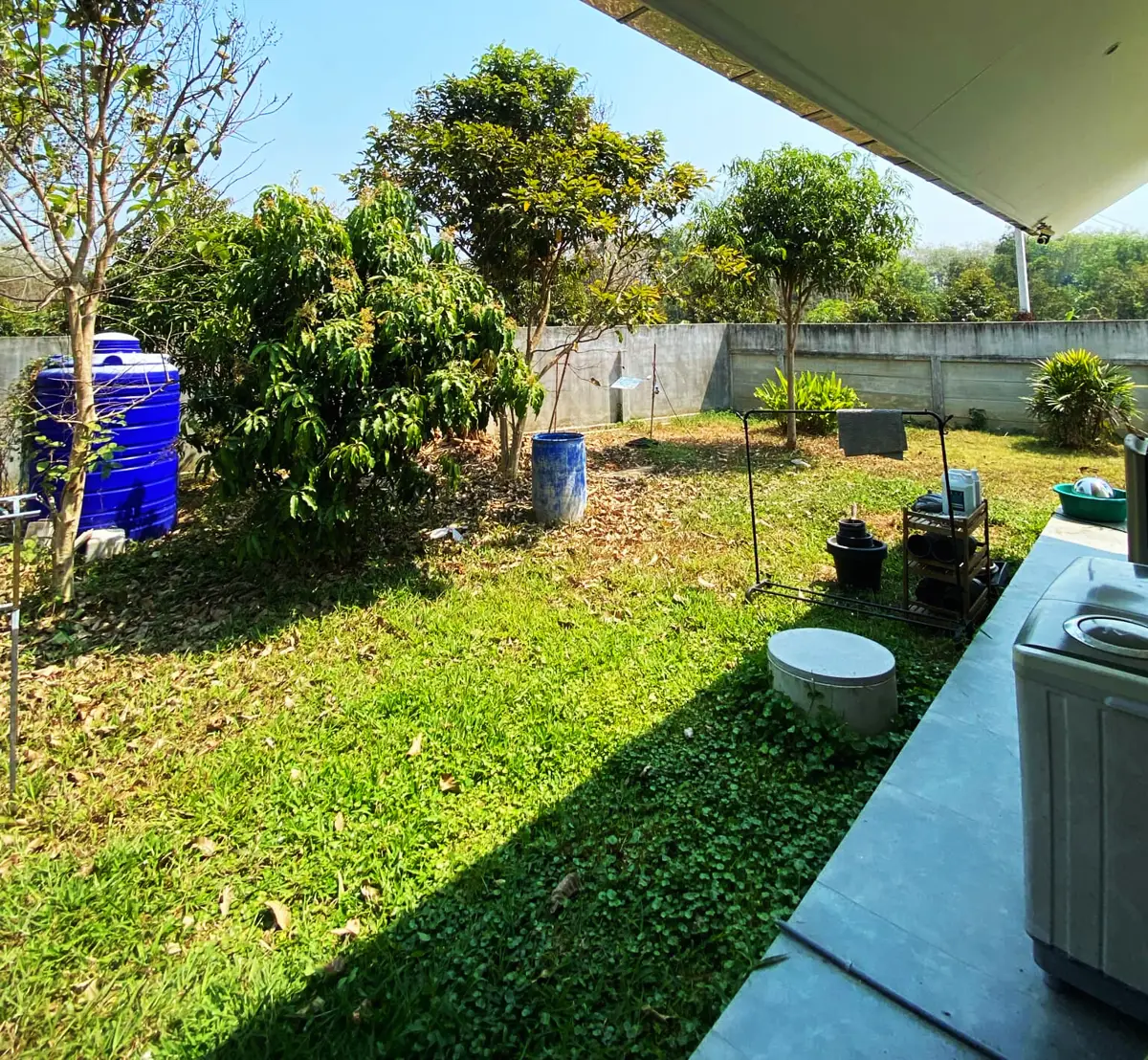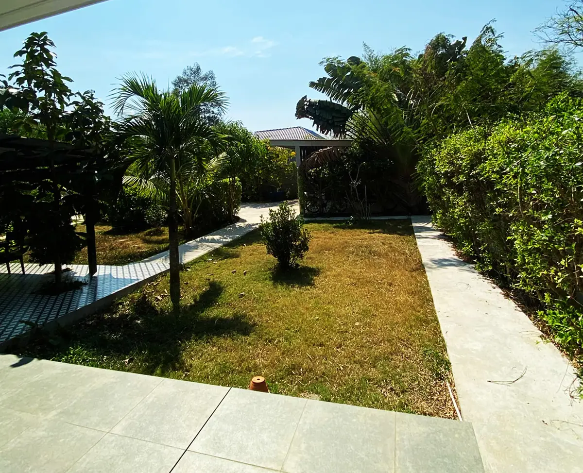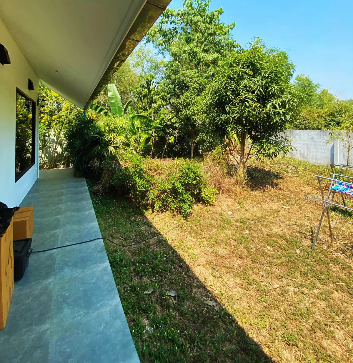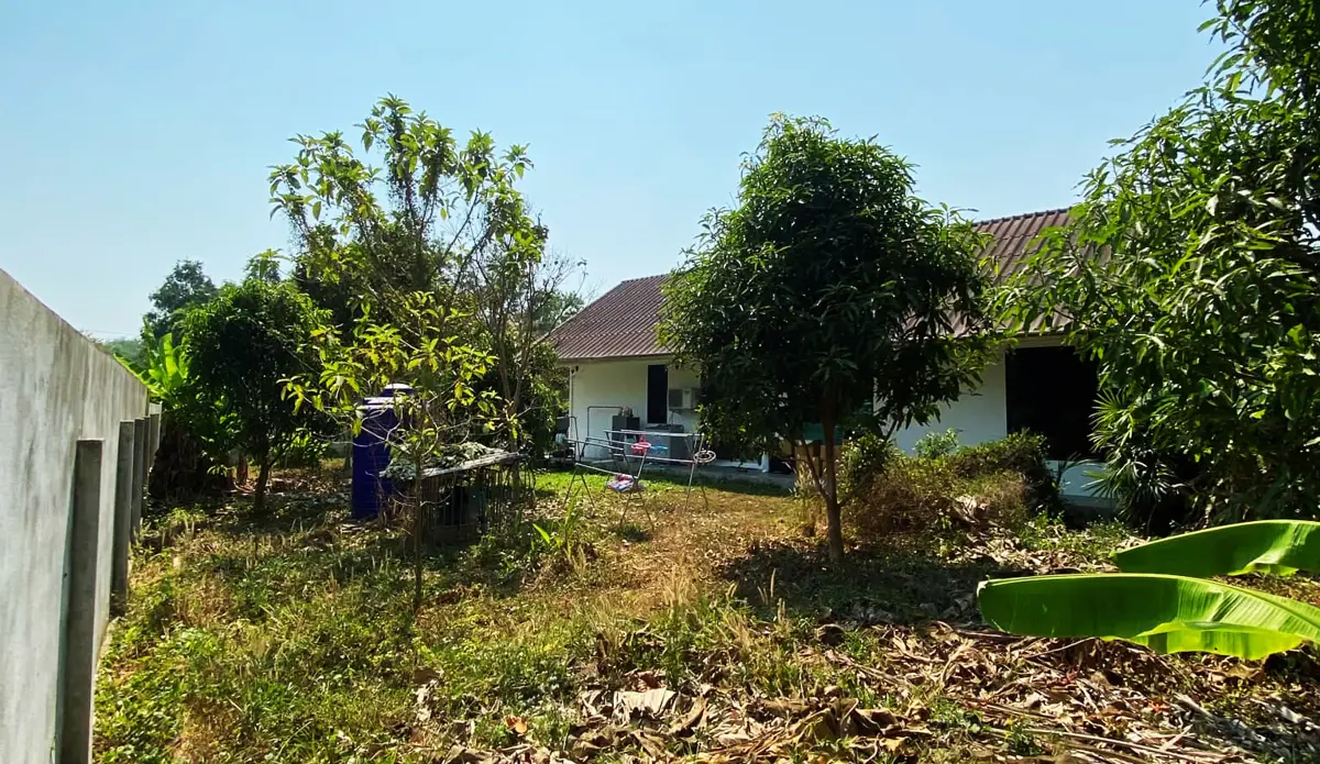 This property consists of a beautifully situated, nature integrated house set in a lush, 956 sqm tropical garden surrounded by a 2 m high wall (with outside height 4 m on two sides) with built-in lights. Even though the location is within a sleepy little village there are no direct neighbours. One side faces a Durian plantation, one a nature area with large bamboo and a small mountain creek. Theres a gate from the property on this side since the area can be utilized by the owner. The other two sides face empty plots.