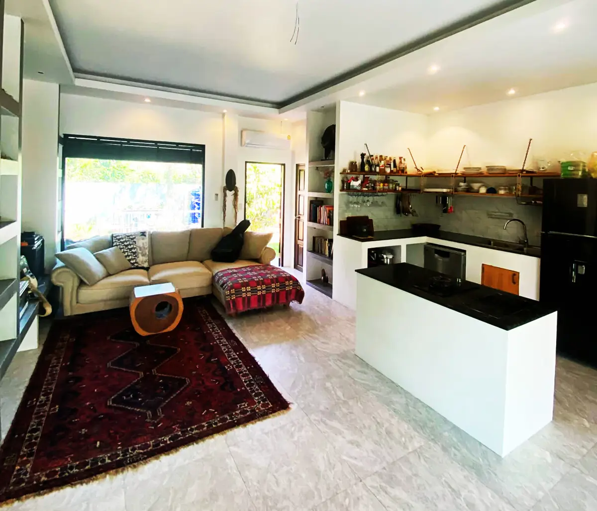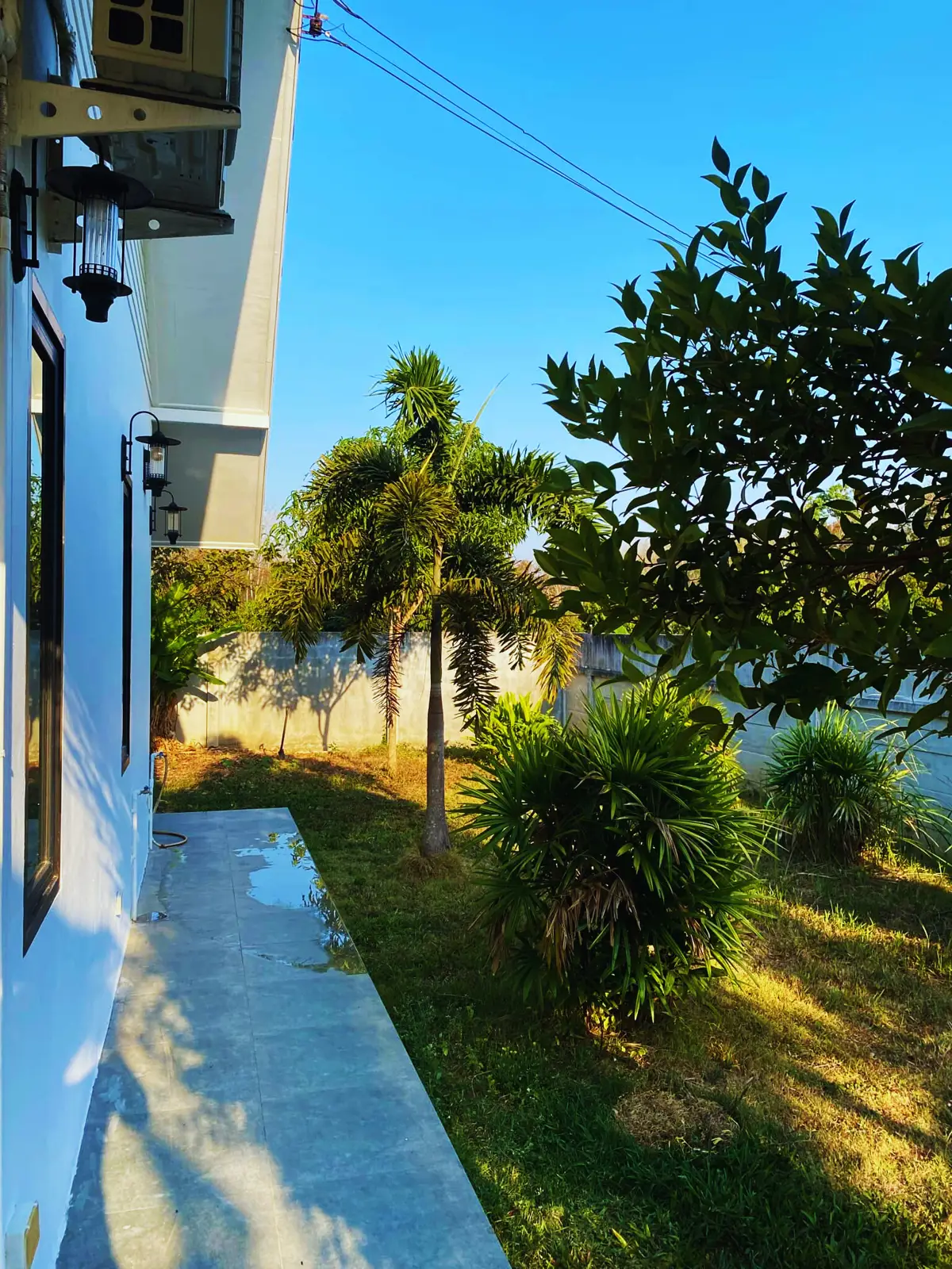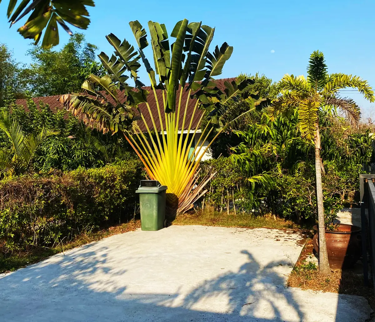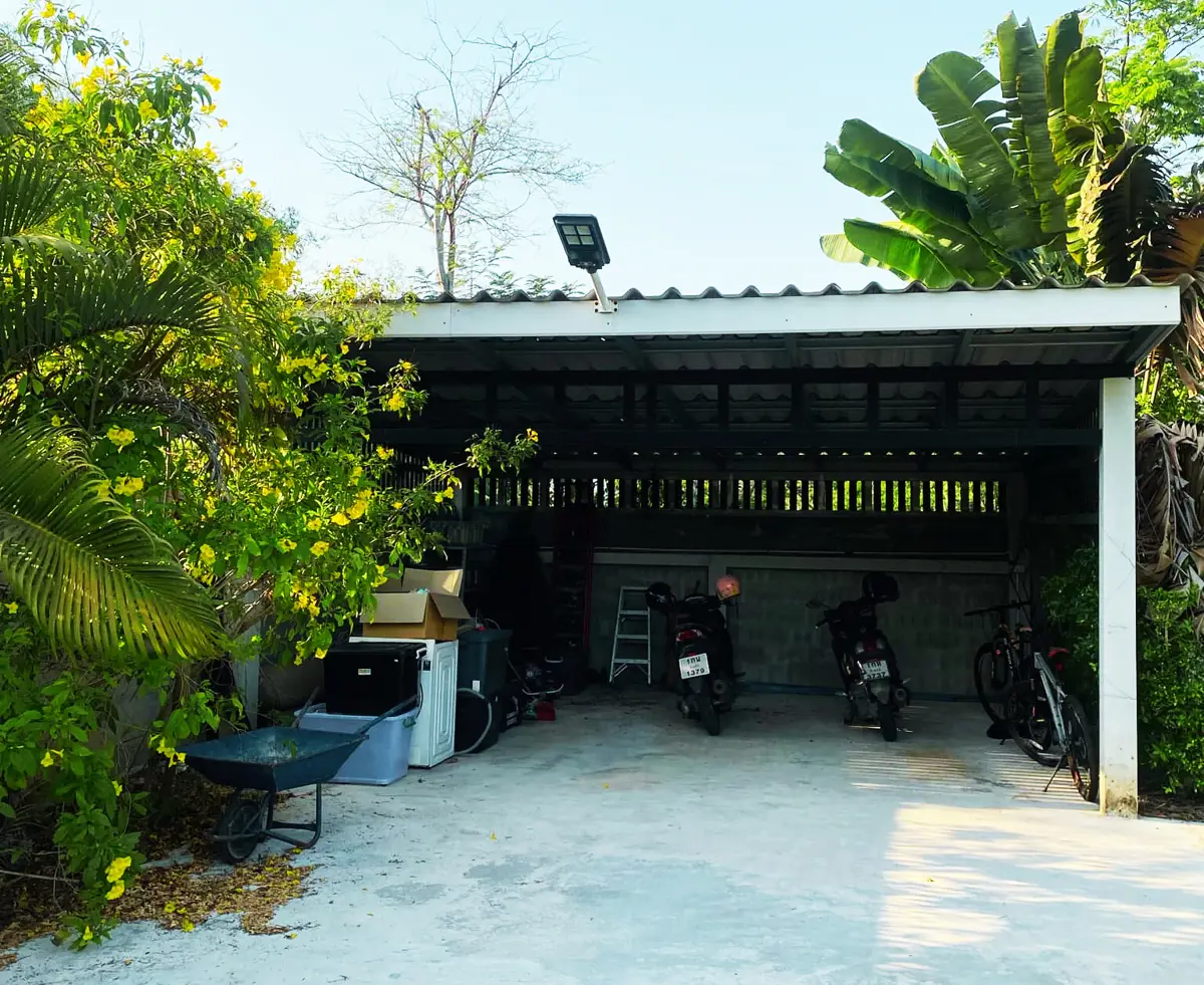This property consists of a beautifully situated, nature integrated house set in a lush, 956 sqm tropical garden surrounded by a 2 m high wall (with outside height 4 m on two sides) with built-in lights. Even though the location is within a sleepy little village there are no direct neighbours. One side faces a Durian plantation, one a nature area with large bamboo and a small mountain creek. Theres a gate from the property on this side since the area can be utilized by the owner. The other two sides face empty plots.