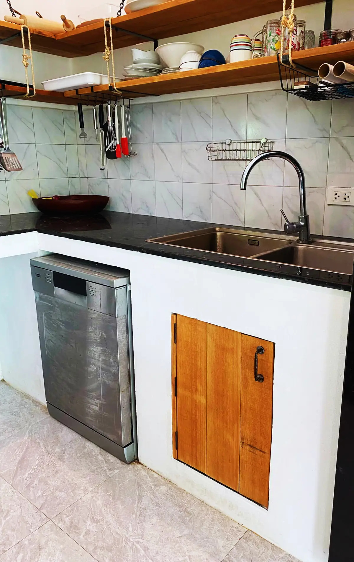 Kitchen has all modern appliances from Franke such as induction stove, gas stove for wok, warm air oven and a large dishwasher. Large, modern fridge. Kitchen tops are black granite and the shelves are rustic style in cast iron and genuine, oiled hardwood.