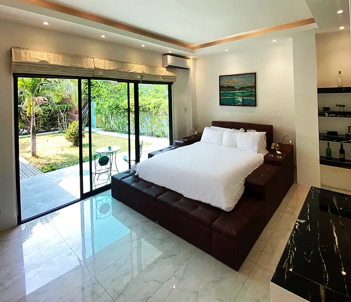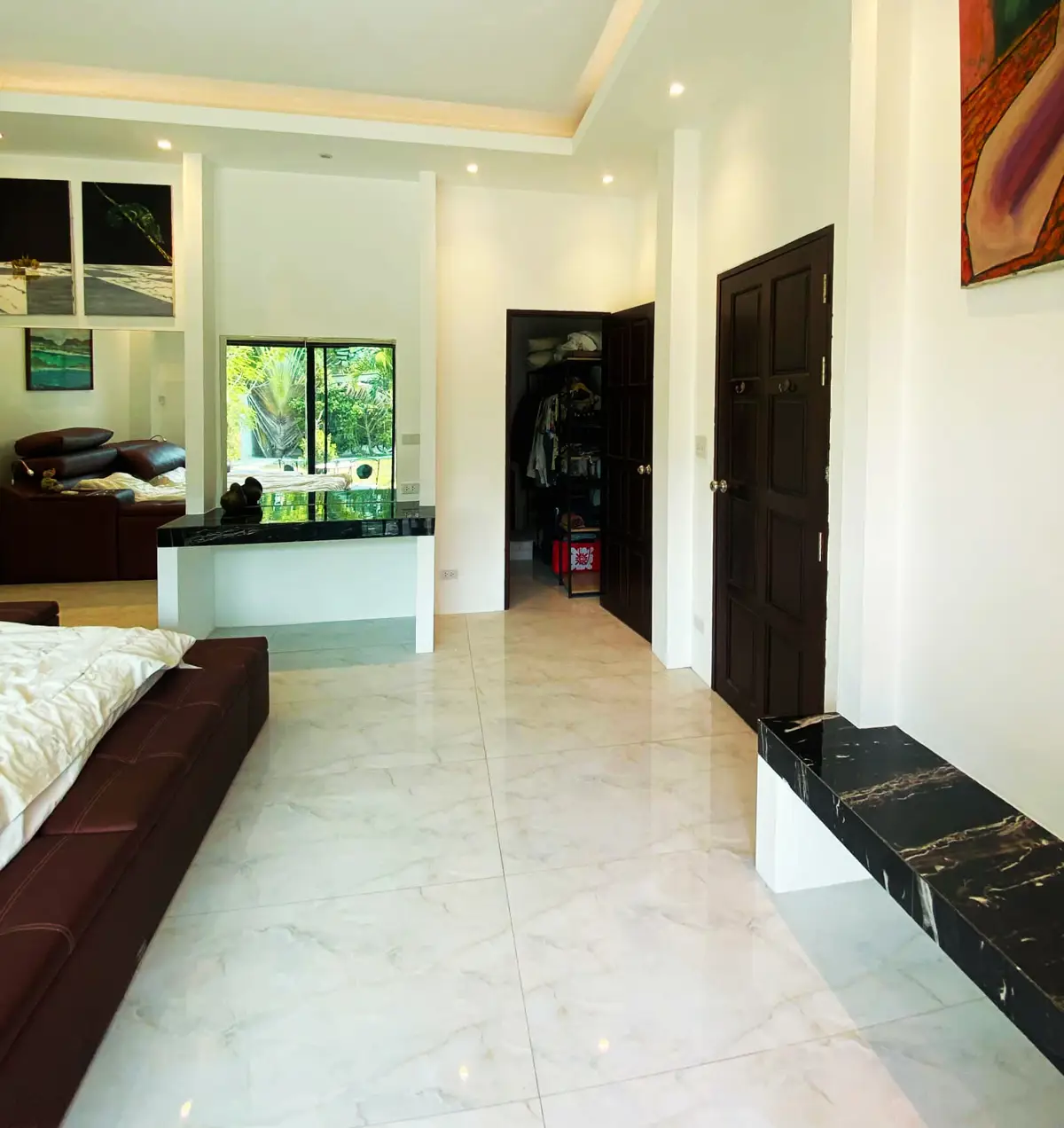 The main bedroom has large sliding doors opening up into the beautiful garden and social area. It has a built-in desk with a large mirror, another full size (about 2x2 m) mirror and a sitting area. Enter is from the garden or from the living room. Top quality curtains cover the sliding doors.