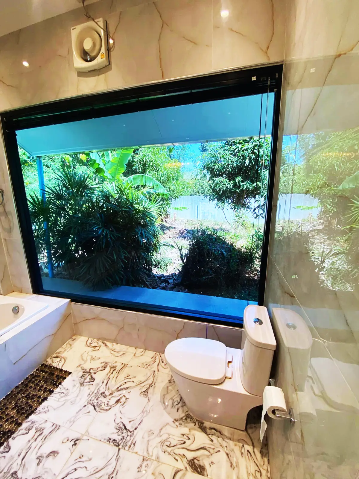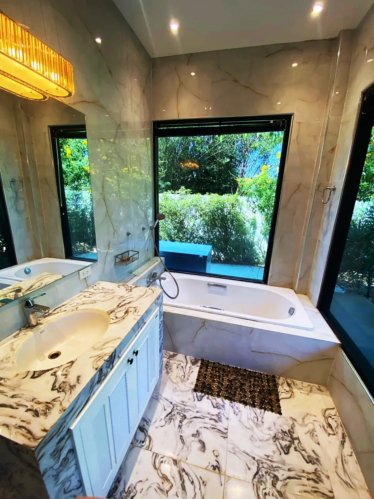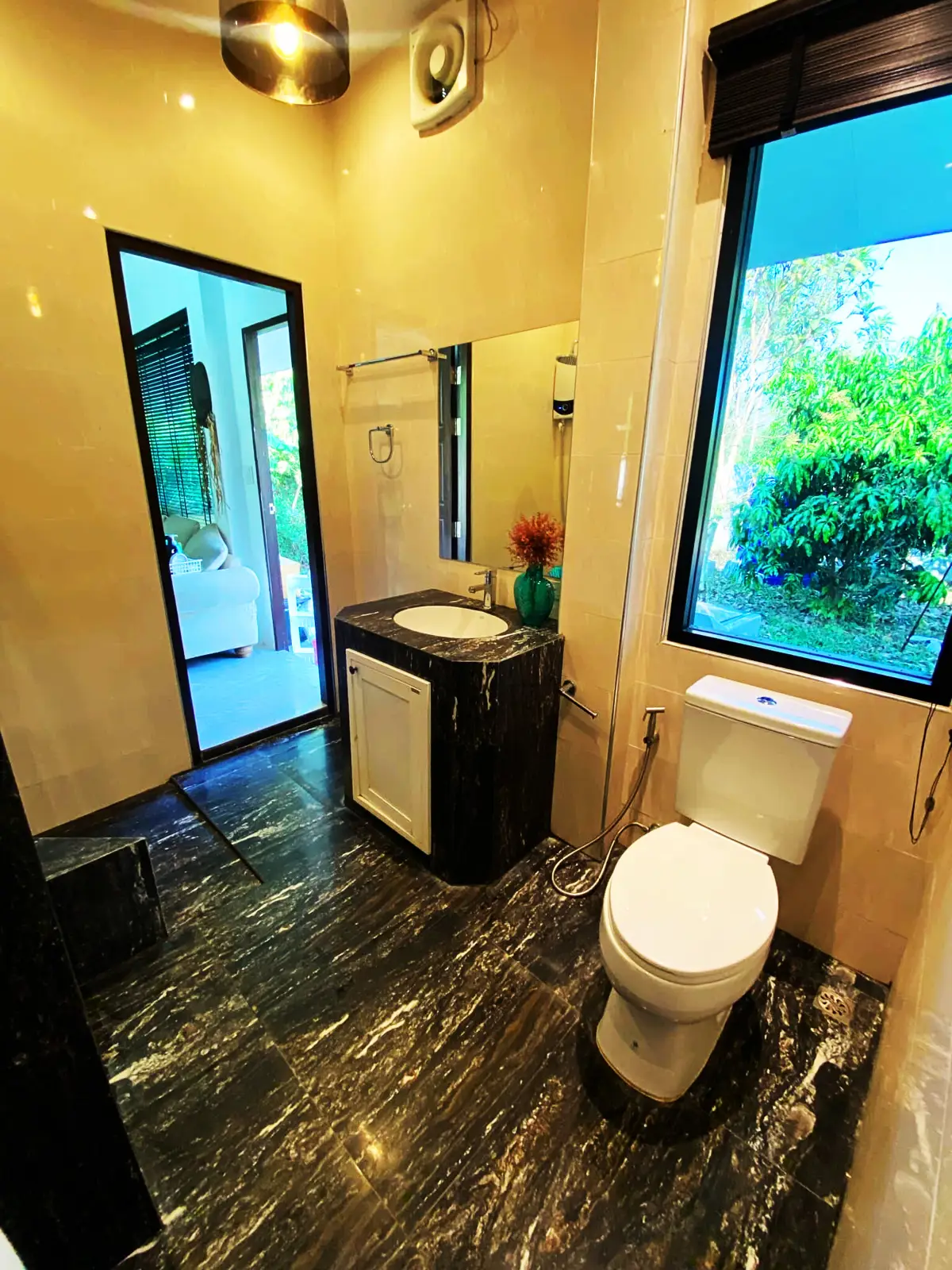 The architecture is western style with large windows and sliding doors and an open kitchen/ living room area. Two large bedrooms, one with en-suite luxury bathroom and walk-in closet attached. The smaller bedroom has a large closet that could be used for office etc and a door to the second bathroom. Both baths have one-way windows, the en-suite one large windows and a bath tub for relaxing/ spa.