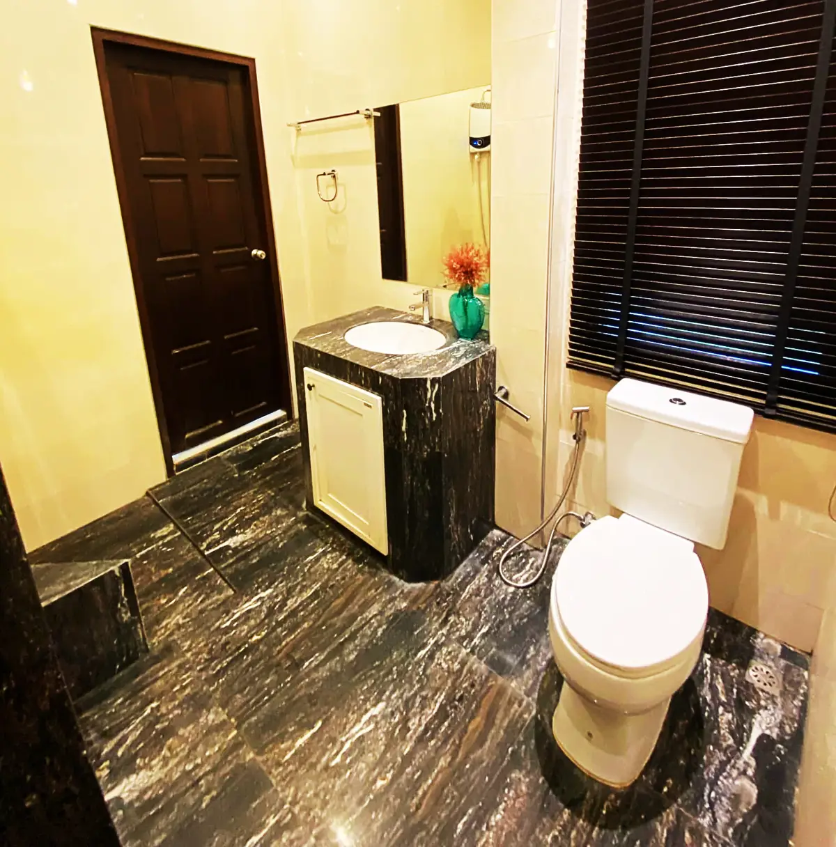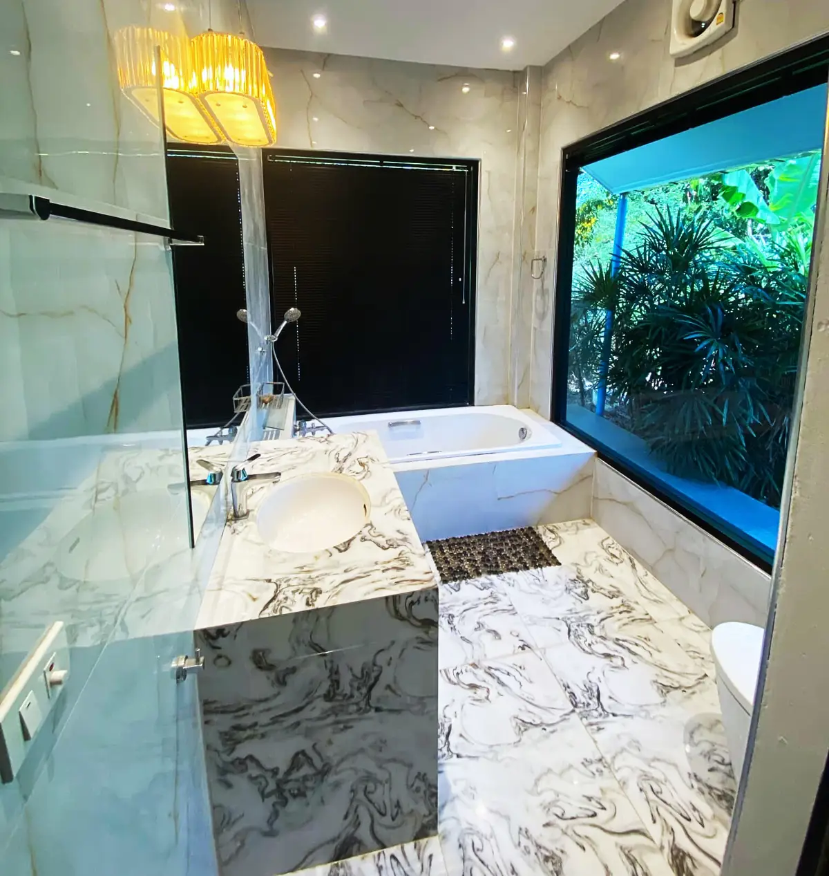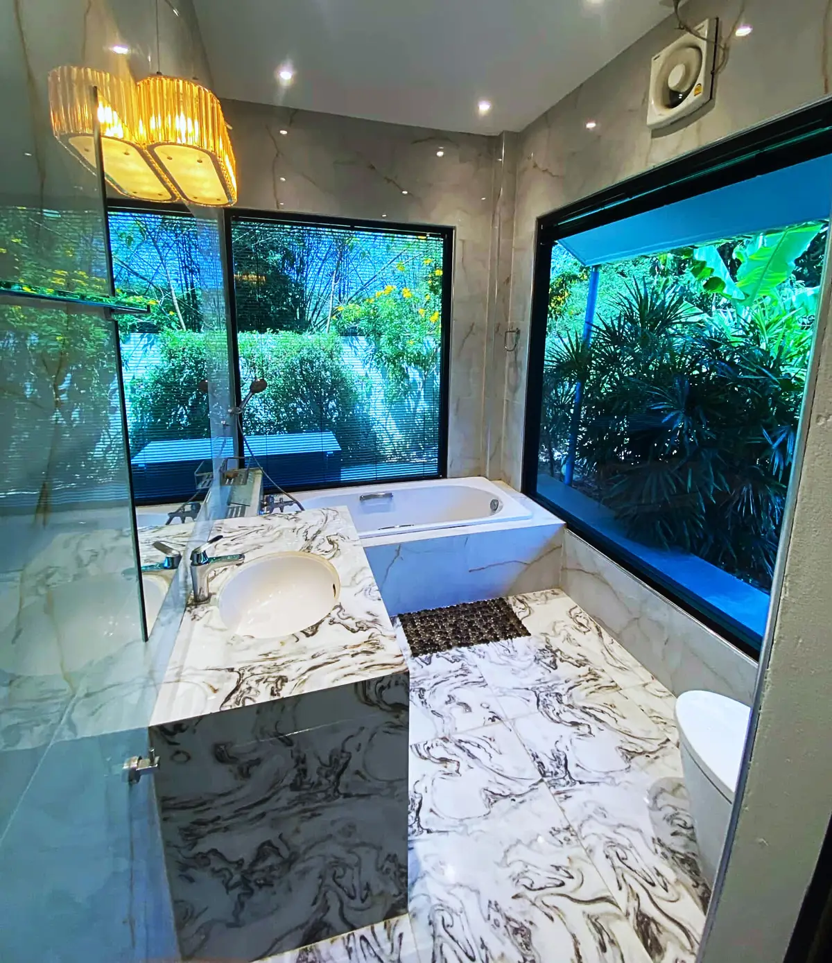 The architecture is western style with large windows and sliding doors and an open kitchen/ living room area. Two large bedrooms, one with en-suite luxury bathroom and walk-in closet attached. The smaller bedroom has a large closet that could be used for office etc and a door to the second bathroom. Both baths have one-way windows, the en-suite one large windows and a bath tub for relaxing/ spa.