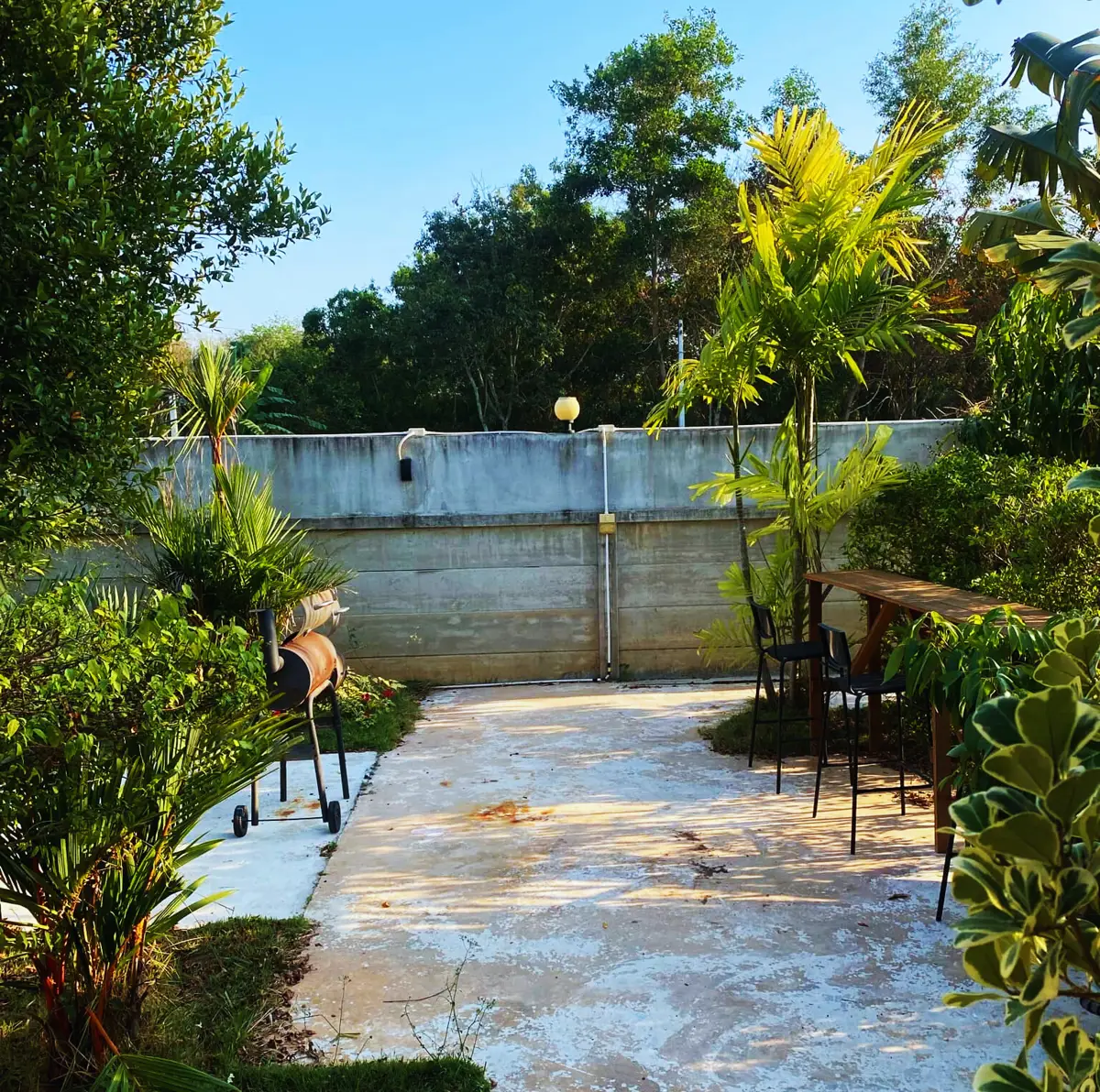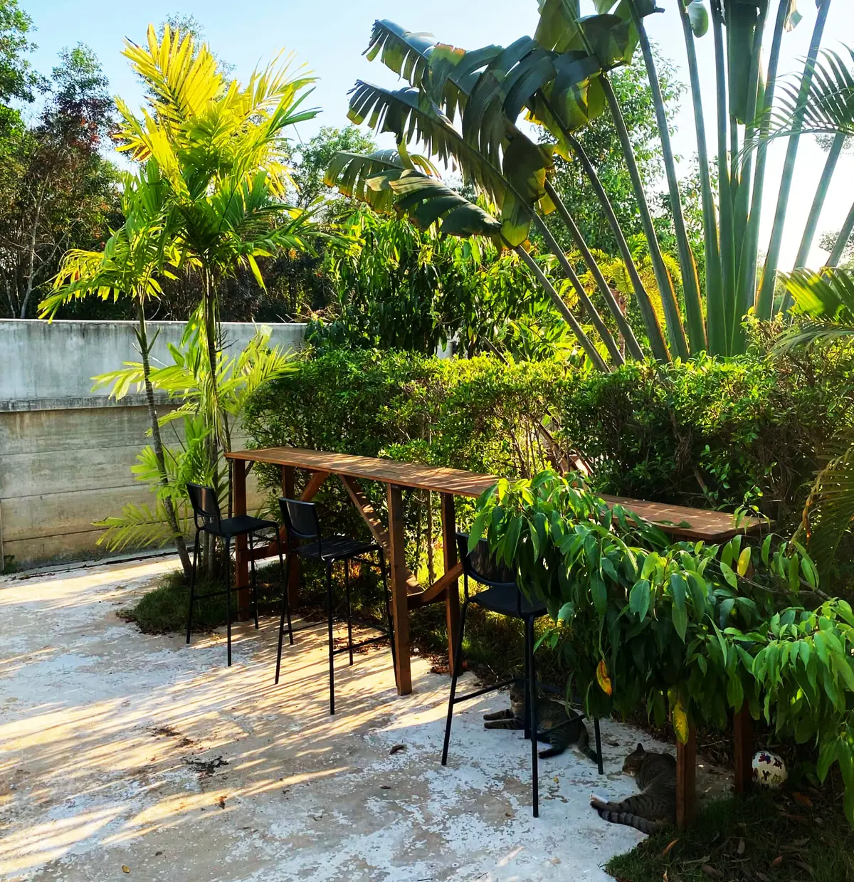 Smaller concrete social area with hand crafted wooden bar desk to hang around the grill.