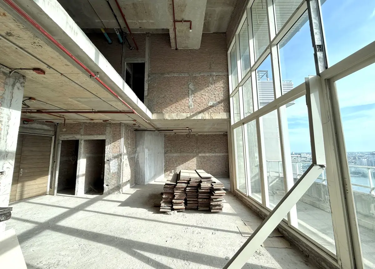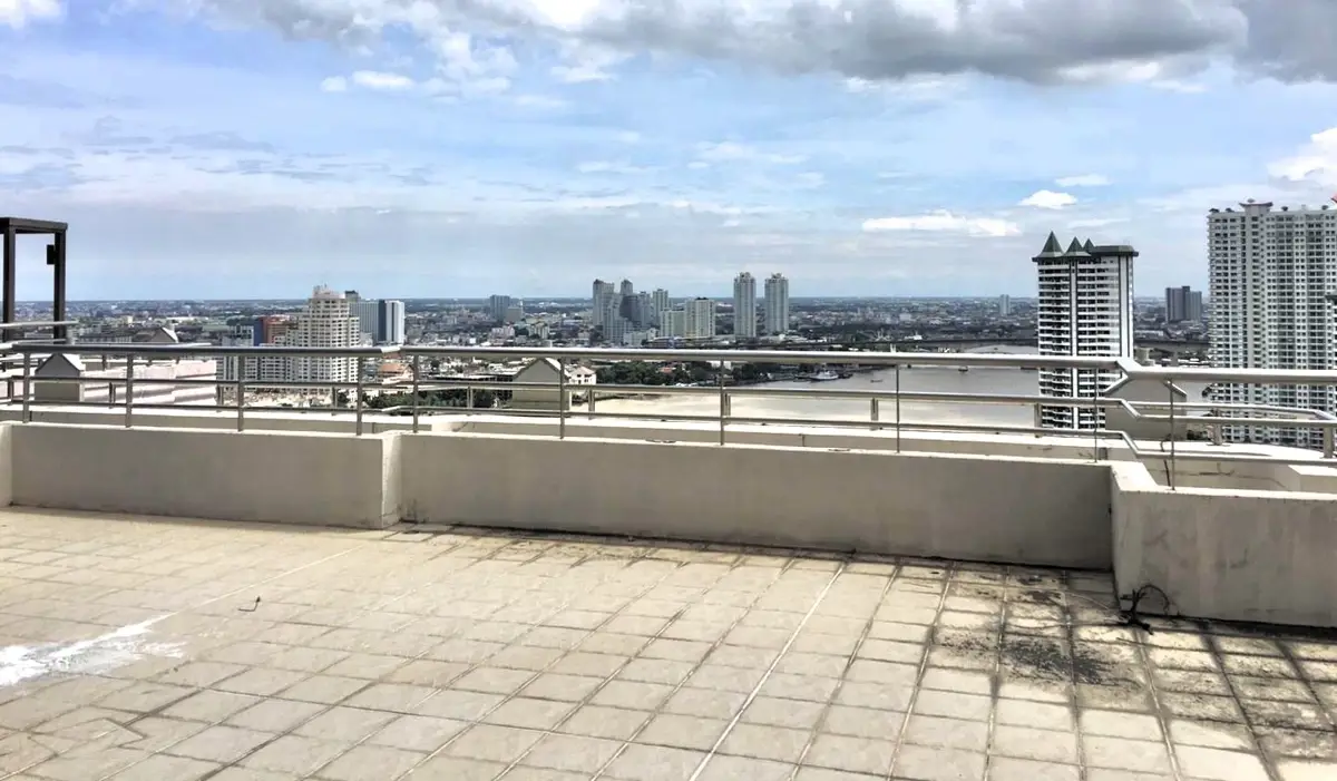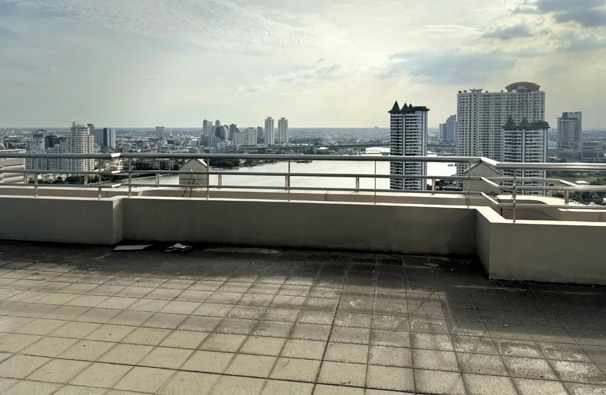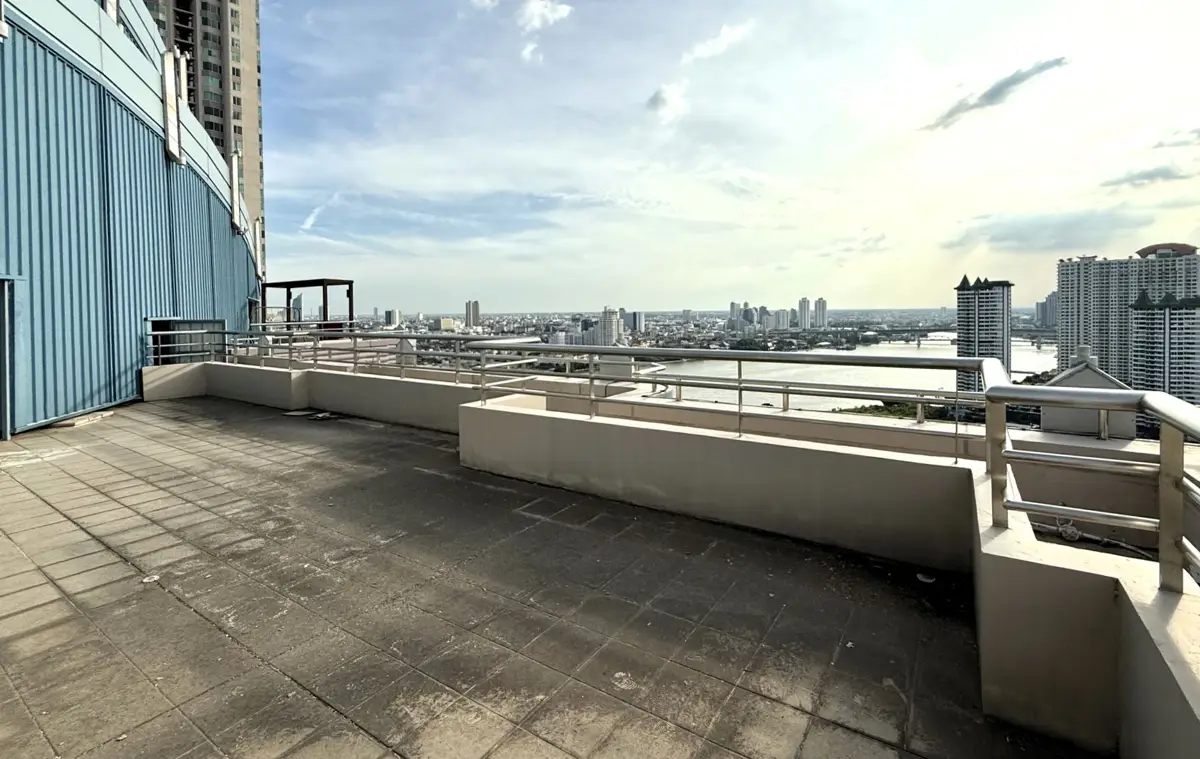 This is a bareshell (potentially 5 bedroom, 5.5 bathroom) penthouse on the market for sale at Watermark Chaophraya on Charoen Nakhon Road. The 50th floor freehold condo measures a spacious 273 sqm and is a duplex type with access to a private 100 sqm rooftop terrace. Watermark Chaophraya is a pet friendly building with great facilities, including swimming pool, gym, lounge, tennis court, garden, parking and security service.