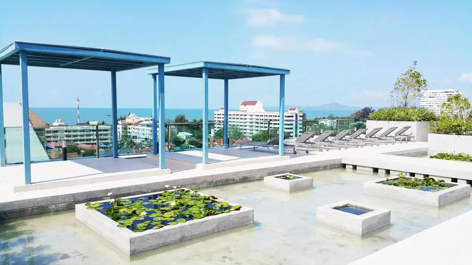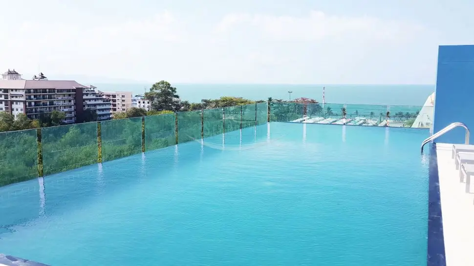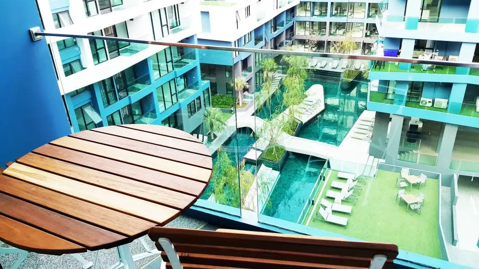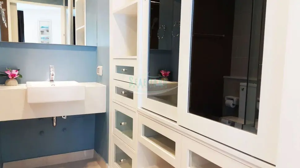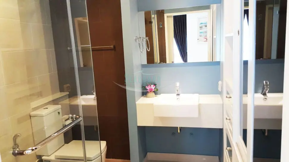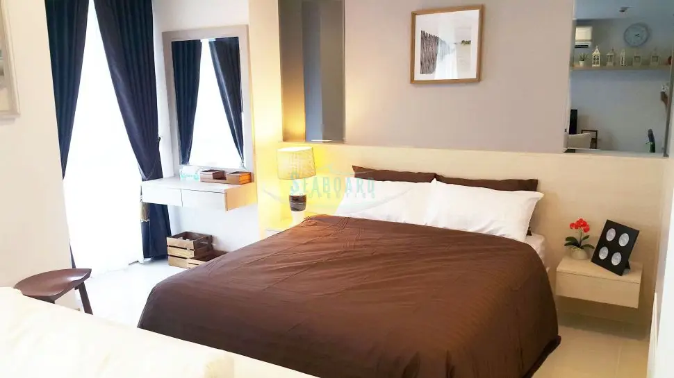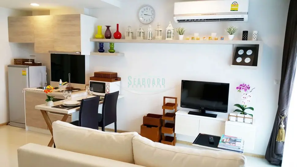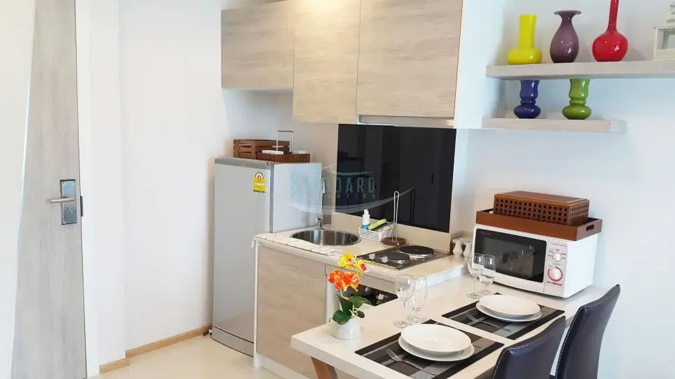 Acqua Condominium This building is located just next to Jomtien 2nd Road and only 300 meters from the Jomtien Beach. The complex has 2 building with 8 floors each. This condo unit is in a modern studio style and has a living area including the balcony of 35.25 sq.m. The apartment comes fully furnished with modern style furniture, a kitchenette, air con, and a built in wardrobe, flat screen TV and a washing machine. Enjoy the communal pool view from the balcony. Facilities of the building: 24 hour security guards, CCTV, communal pools, kid’s pool, garden, an island pond, Jacuzzi, steam room, fitness and many more. Can be rented with a long term contract at 17,000 Baht per month which excludes all utility bills. A 2 month deposit is required.Facilities