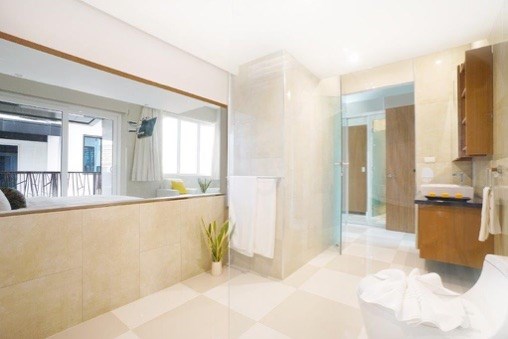 - Building B has a ground floor pool side area of 70sqm plus a garden studio of 58sqm. The 2nd and 3rd floors each have 2 1-bedroom units with 2 bathrooms each. On the 4th floor there is a complete 200sqm unit with 2 bedrooms, and 3 bathrooms with central laundry.