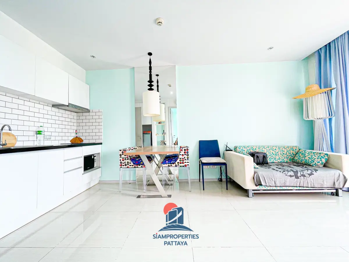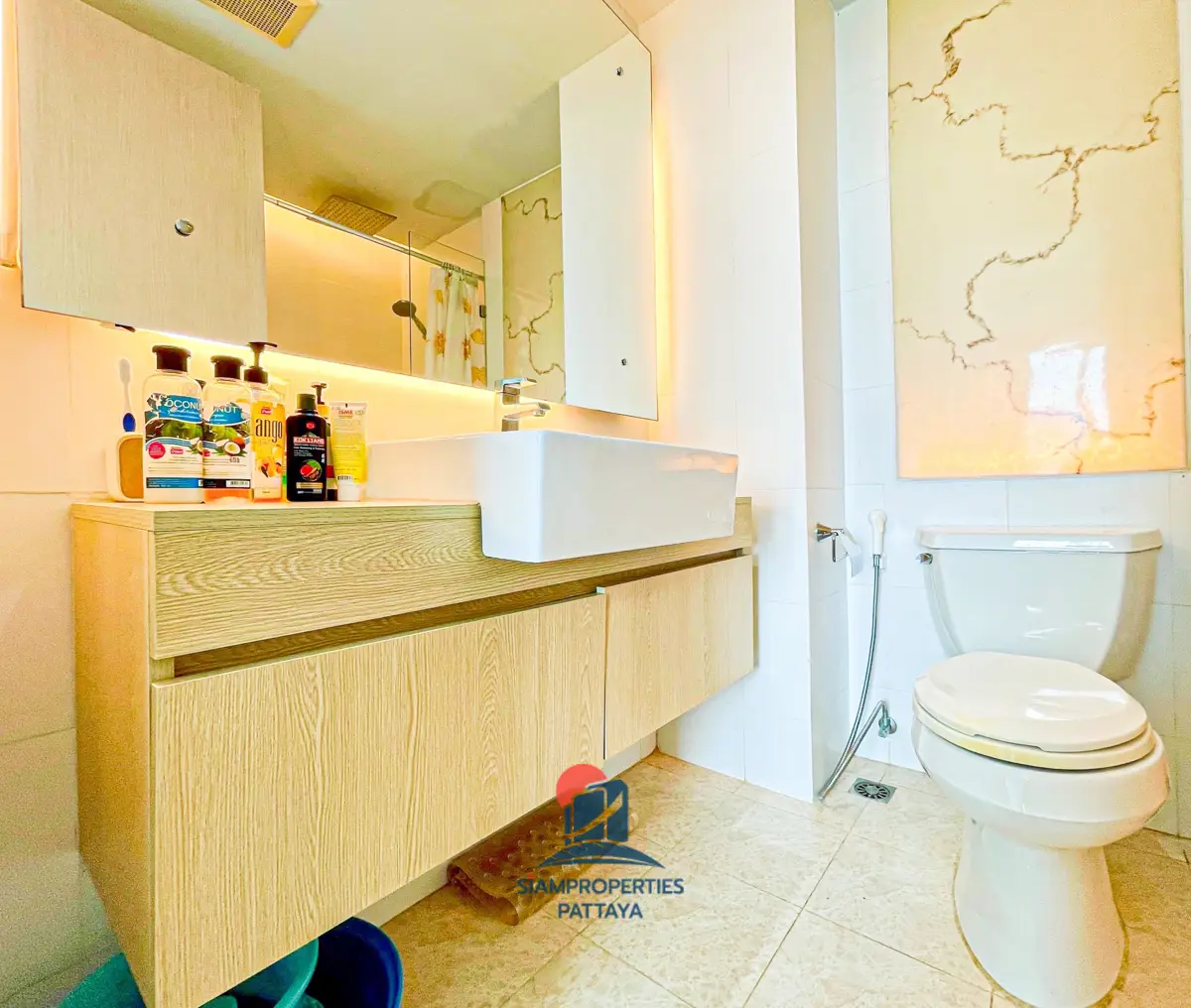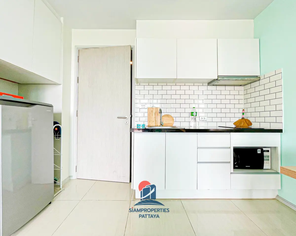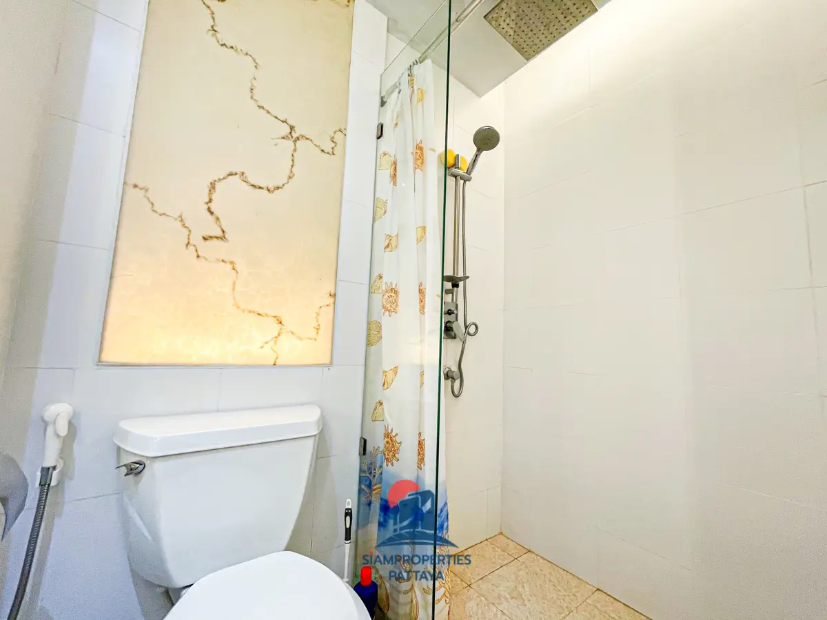 The condominium offers excellent connectivity, with easy access to Sukhumvit Road and a short 10-minute drive to Pattaya City. Its facilities cater to both relaxation and fitness, featuring an outdoor lagoon swimming pool equipped with water slides, lush gardens, a fitness center, a jacuzzi, covered parking, CCTV surveillance, and a 24-hour security system.