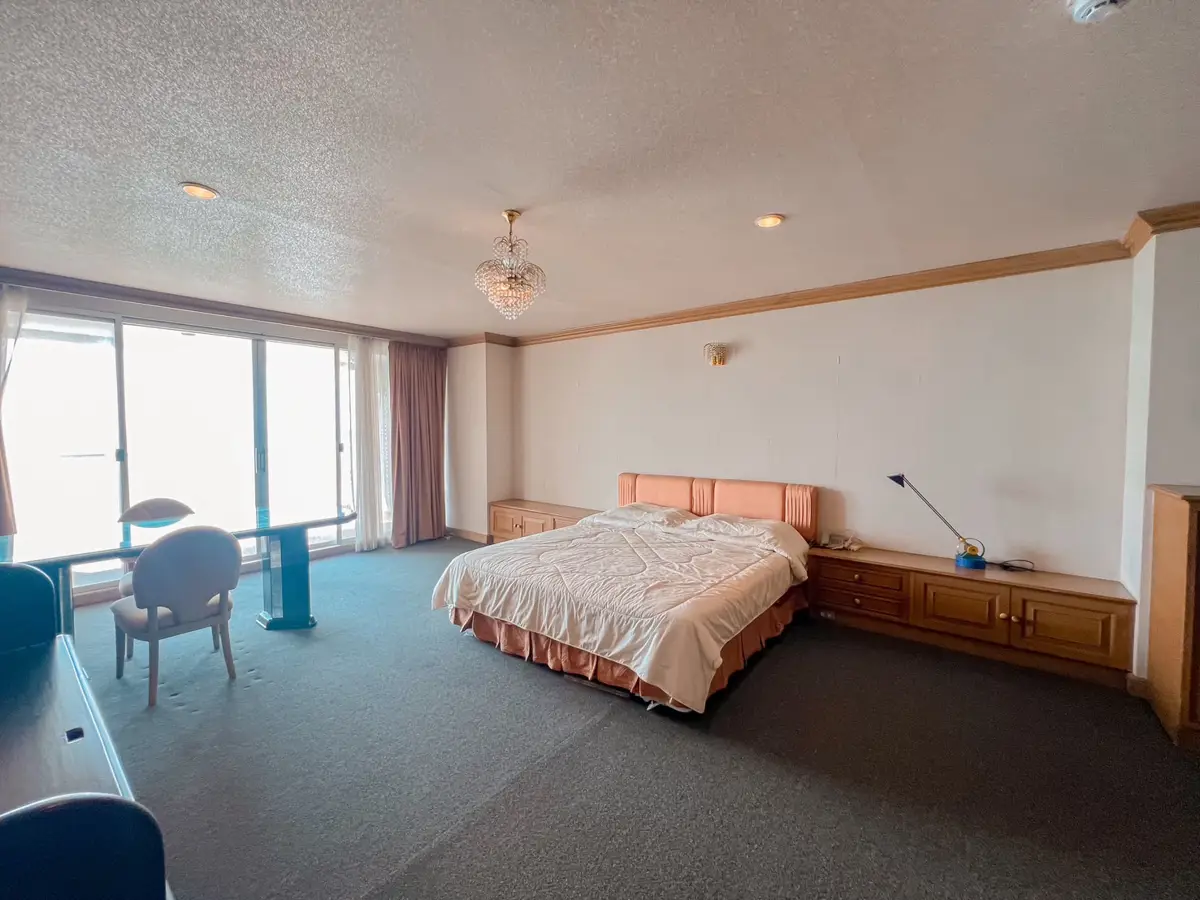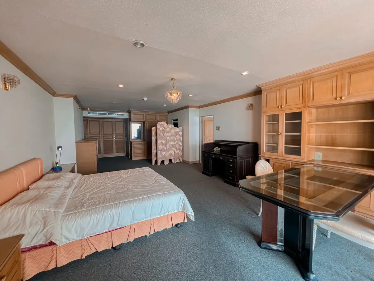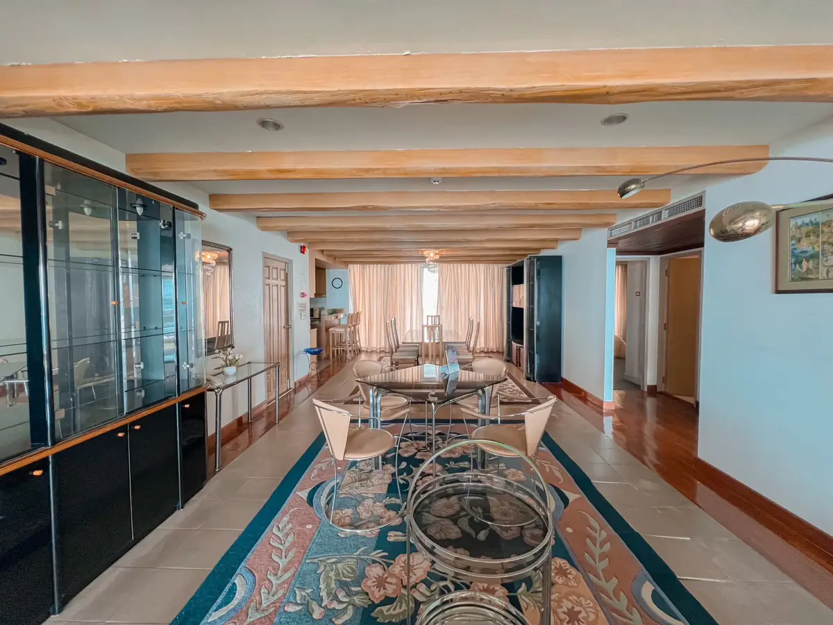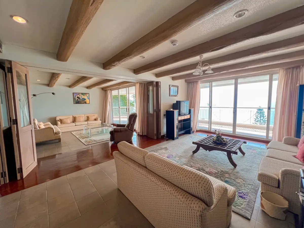 The beautiful three-bedroom unit, with a total living space of 373.11 square meters, features three bathrooms and is situated on the 3rd floor, offering stunning sea views of Pattaya Bay.