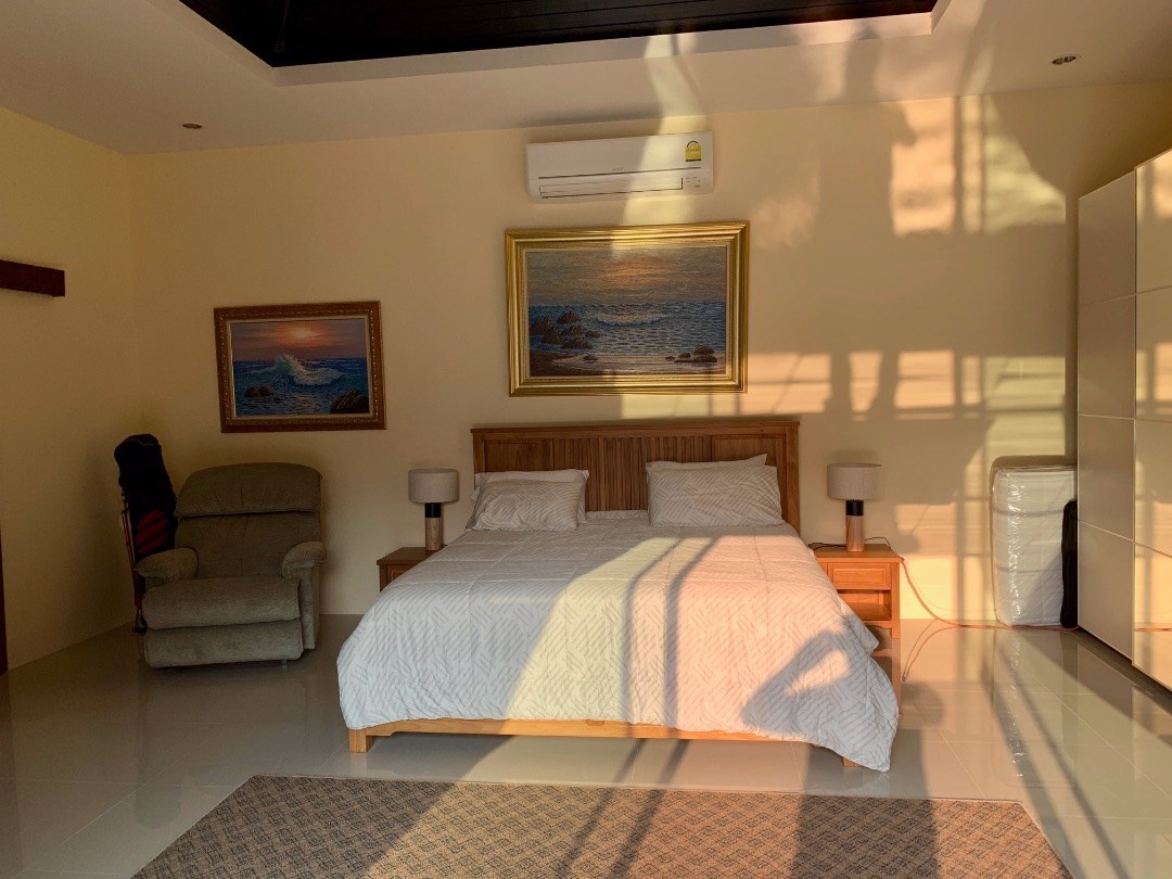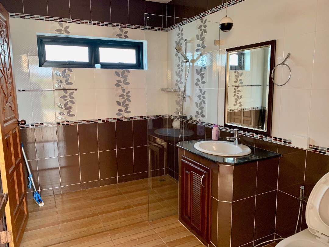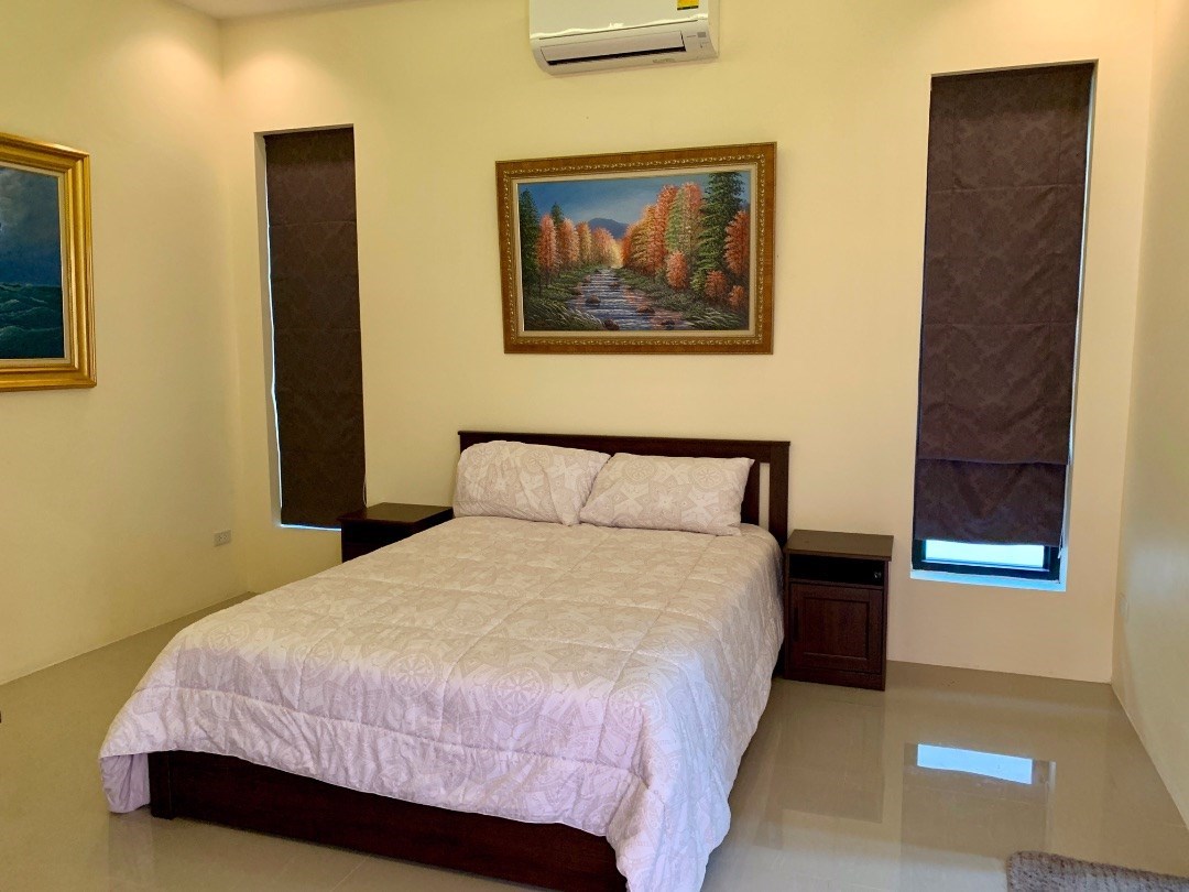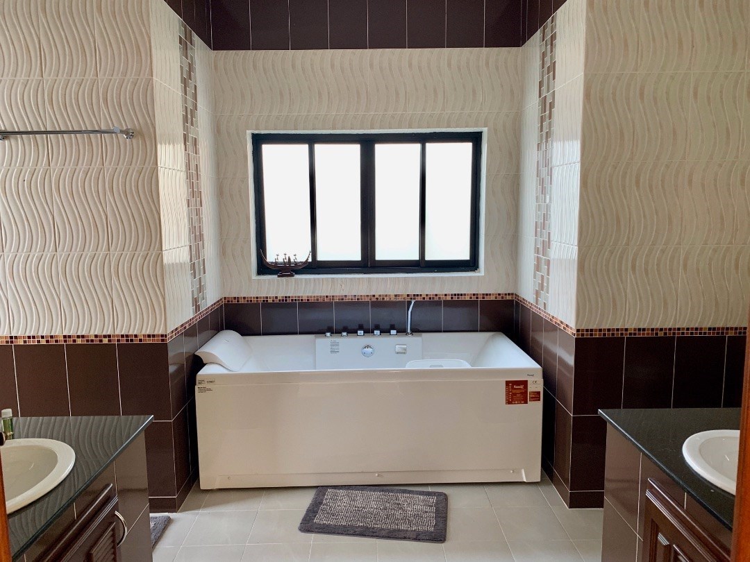 This Ban Chang Pool Villa features unsurpassed workmanship and quality construction. The villa is a 180+ square meters, single-story, four-bedroom home. Master bedrooms are lavishly large and equipped with relaxing Jacuzzi tubs. Guest suites are separate and are ideal for offices and guest accommodations each with ensuite toilet and shower. The villa also features a gorgeous and private swimming pool, perfect for unwinding or entertaining friends. The 39 sqm swimming pool is surrounded by a beautiful, fully enclosed garden, and has its own serene outdoor gazebo.