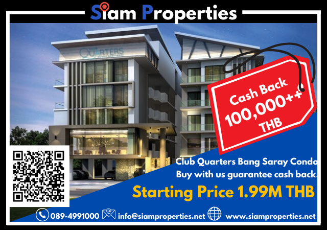 Buy with Siam Properties Pattaya, our customer will get cash back 100,000 THB