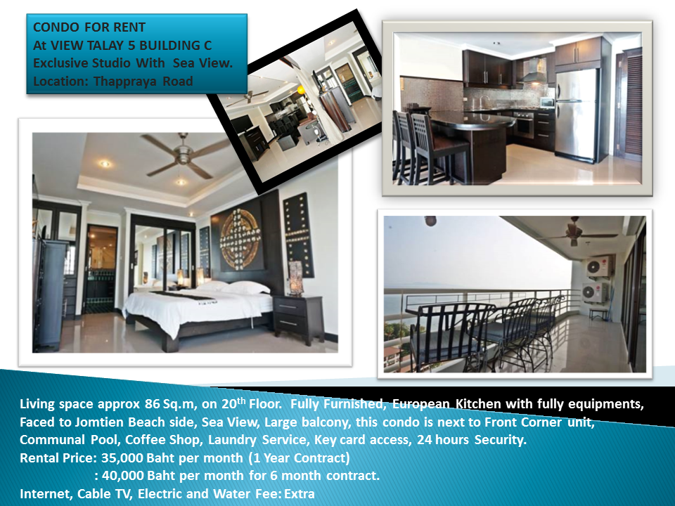 Living space approx 86 Sq.m, on 20th Floor. Fully Furnished, European Kitchen with fully equipments, Faced to Jomtien Beach side, Sea View, Large balcony, this condo is next to Front Corner unit, Communal Pool, Coffee Shop, Laundry Service, Key card access, 24 hours Security. Internet, Cable TV, Electric and Water Fee: Extra
