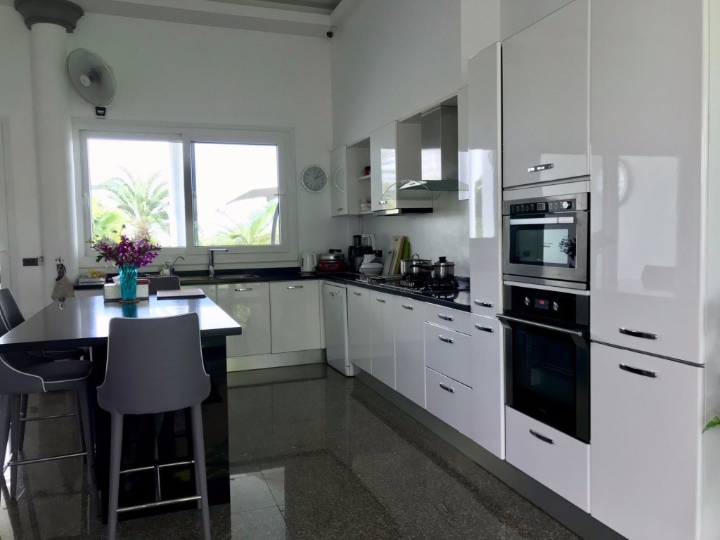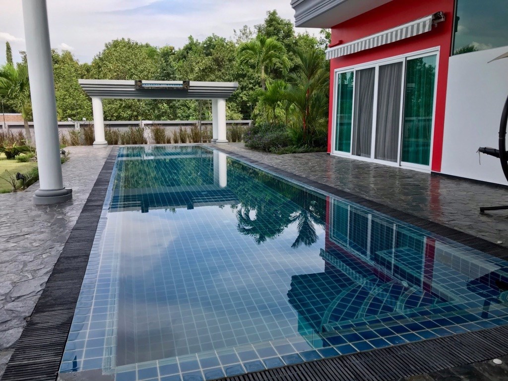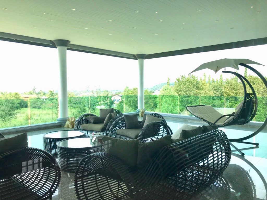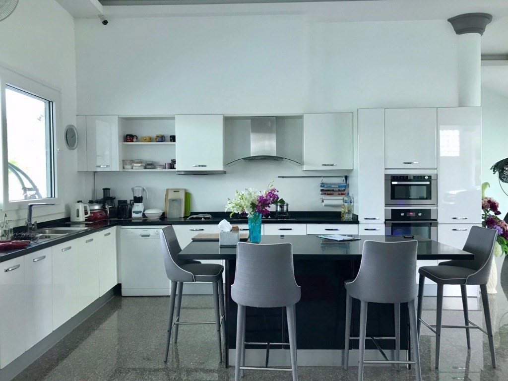 We have personally inspected this villa, just minutes from our office we would love to show it to you. Luxury pool villa built to the highest standards. The villa has 2 floors with viewing tower on a 3 level. 4 bedroom, 2 bathrooms, 2 extra toilets, European and Thai kitchens, Gym, Office with sea view, Maids room, Srorage room. 15.5m. salt water pool with jacuzzi and monument waterfall. Viewing tower with ocean view and amenities such as a wet bar. Car parking for 3 or more cars. Fishpond with waterfall and fountain. German windows and doors, insulated roof and 10cm q-con walls, LED dimmable lights, electric backup generator, 5Kw solar roof panel, extensive CCTV security system, automatic sunshades and rolling shutters. Extensive detail of the highest craftsmanship. Must see to appreciate. e.g. over 1 million thb in Swedish LED lighting alone. Financing service available.