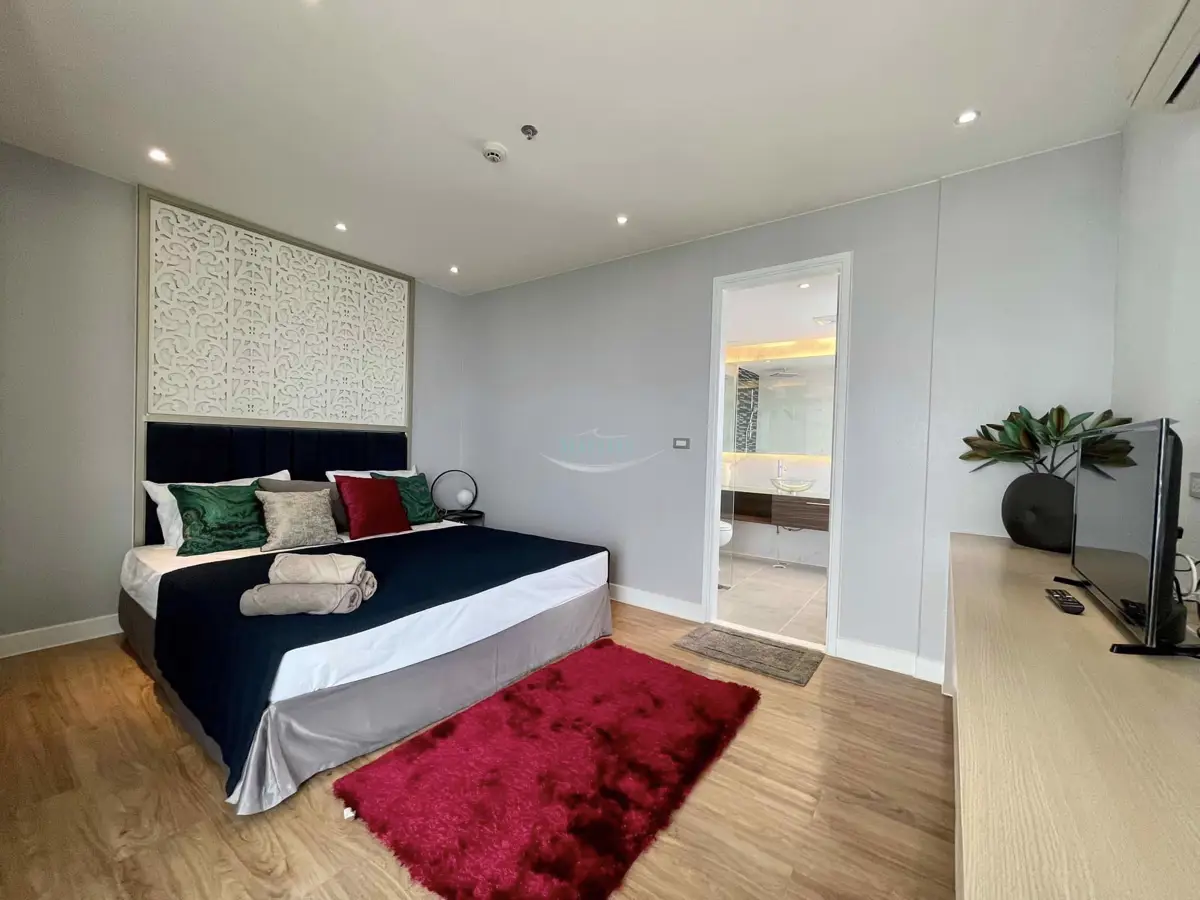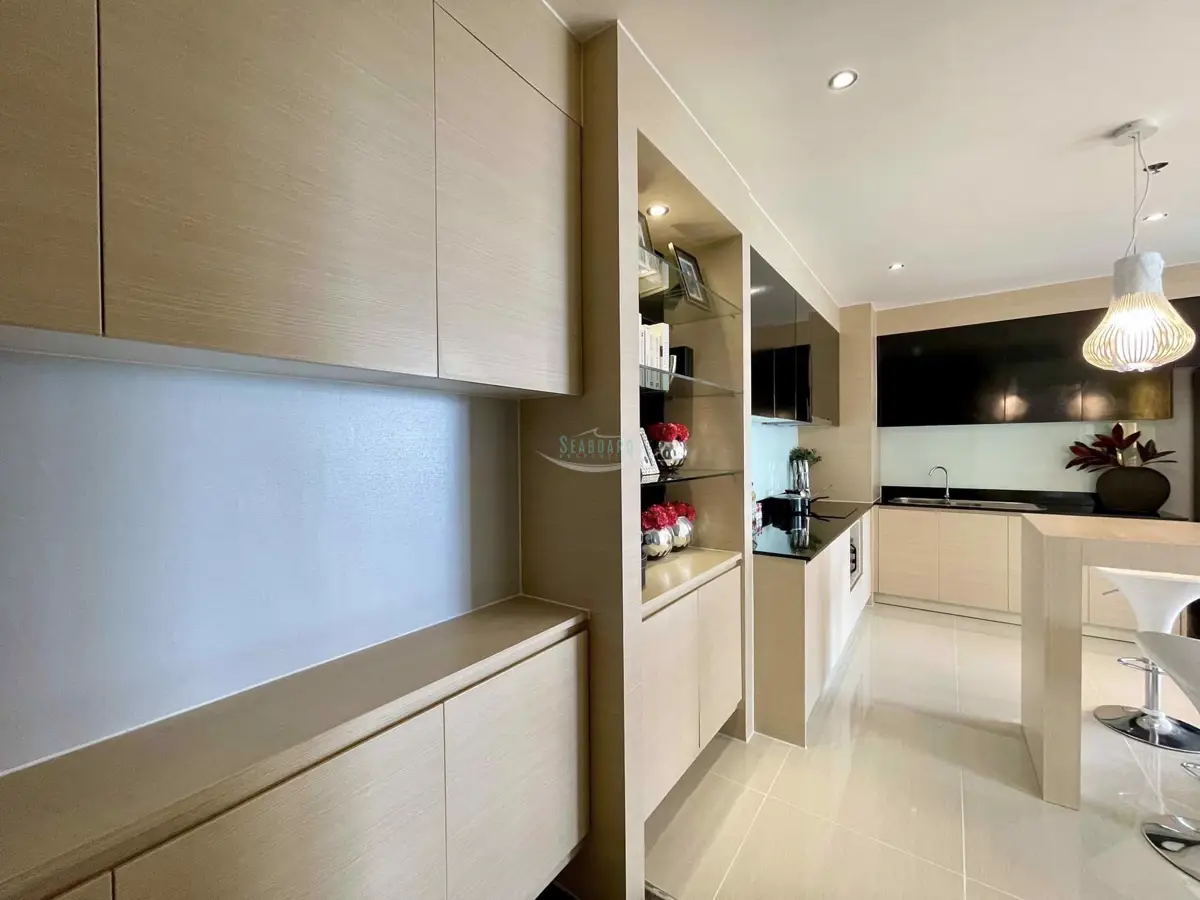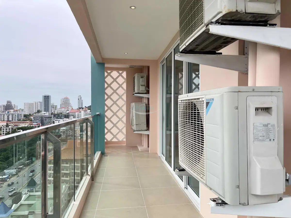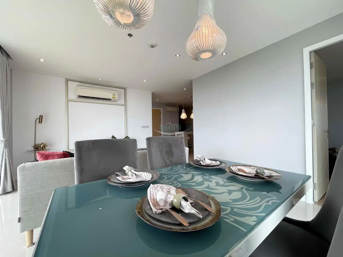 at a convenient location in the Jomtien area on the baht bus route. A recently remodeled, modern 2 bedroom, 2 bathroom apartment with balcony, 93 sq.m in size. It is fully furnished and decorated up to modern Western standards including a fitted European kitchen, and dining area, fully air-conditioned.