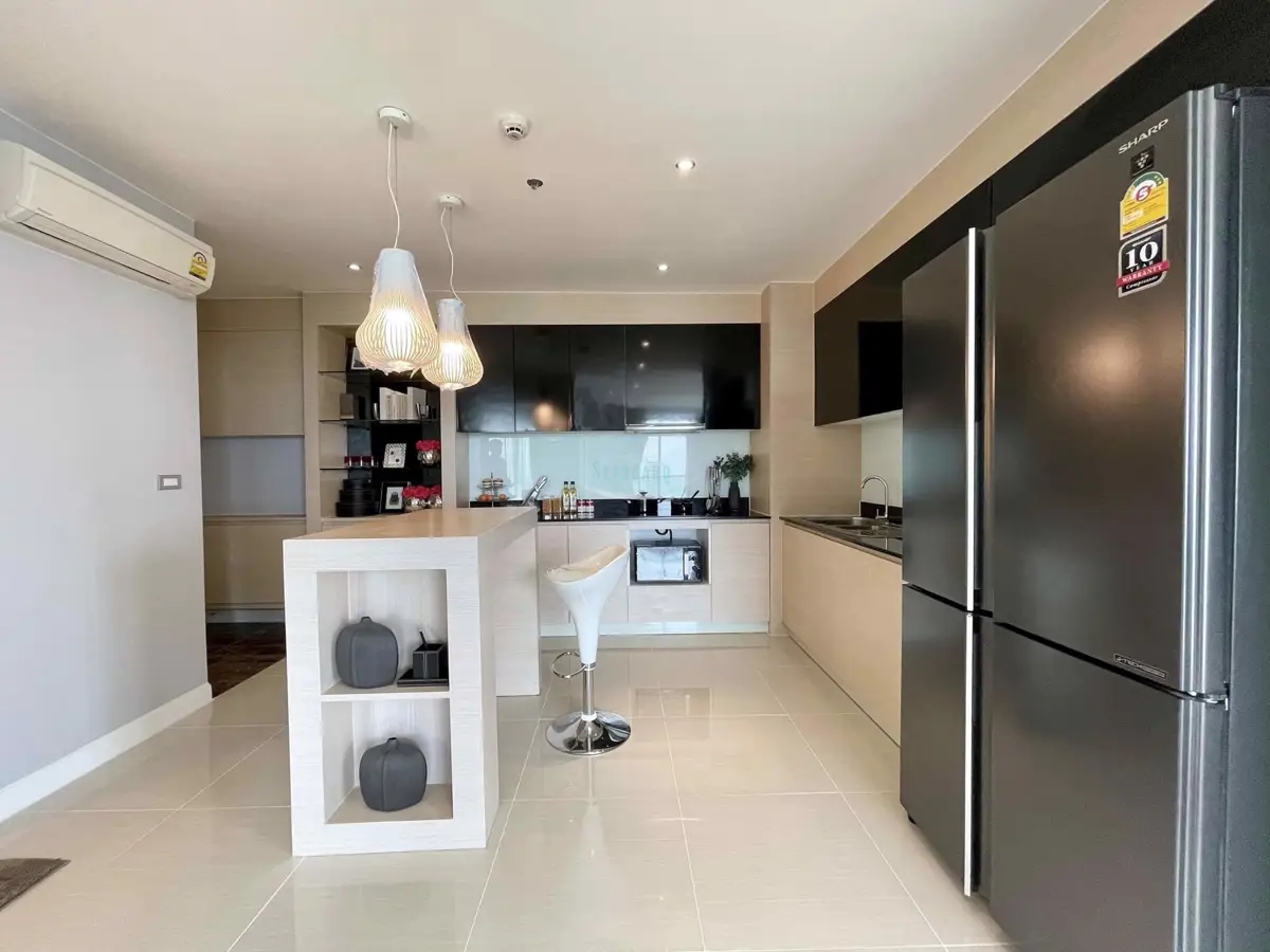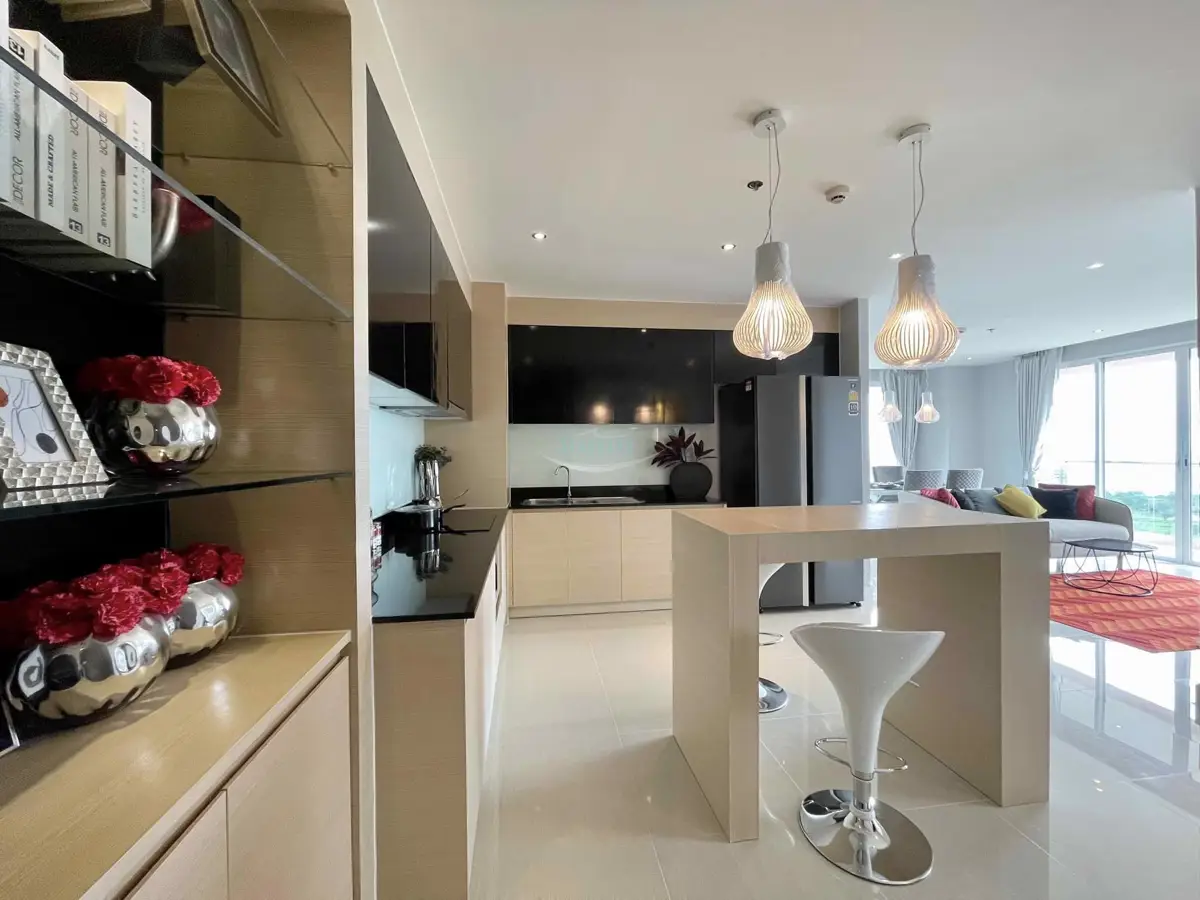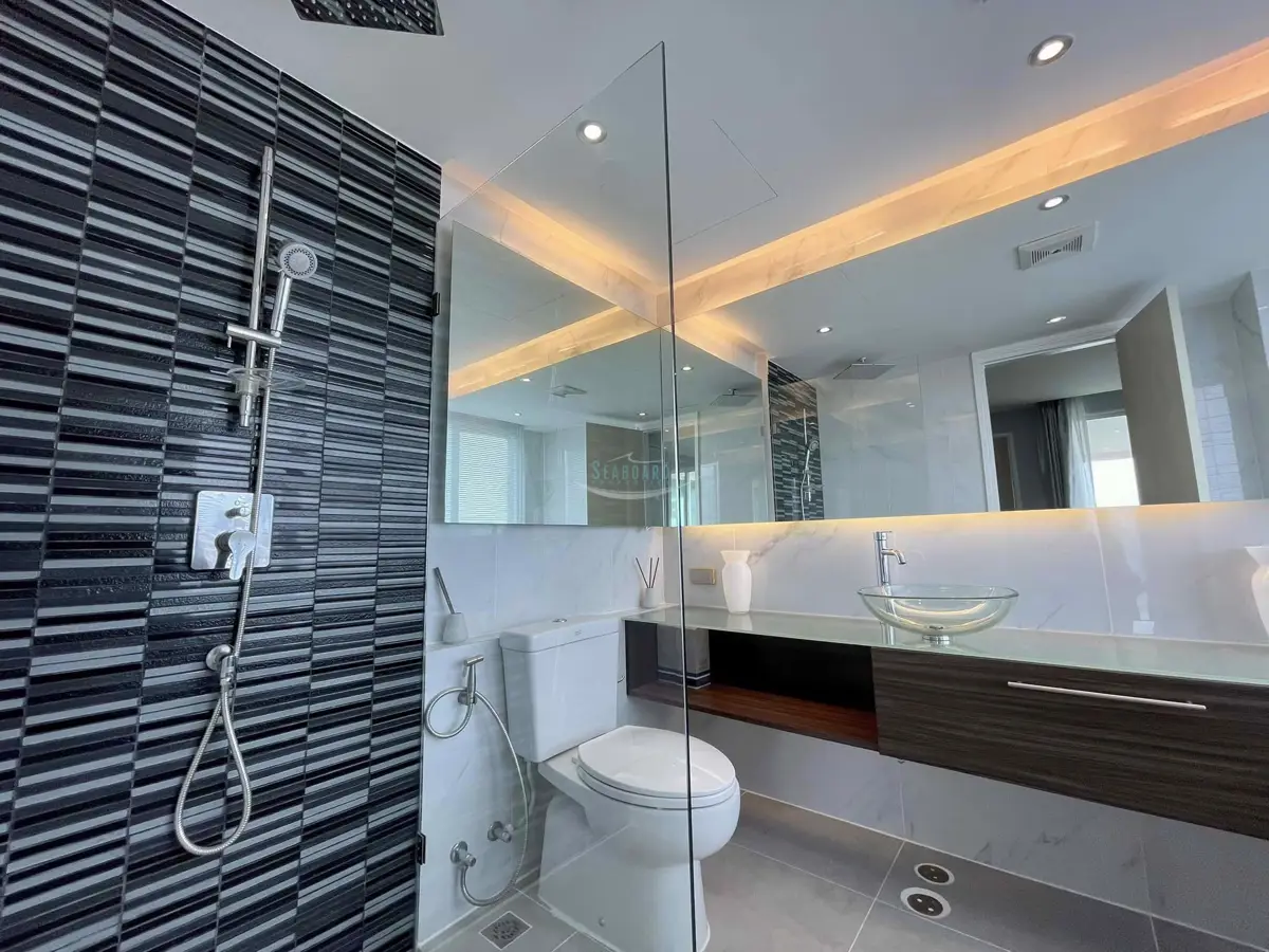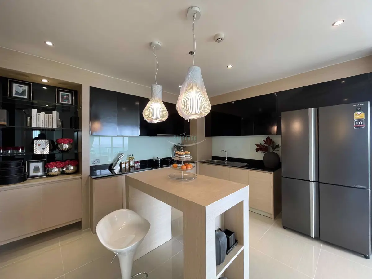 at a convenient location in the Jomtien area on the baht bus route. A recently remodeled, modern 2 bedroom, 2 bathroom apartment with balcony, 93 sq.m in size. It is fully furnished and decorated up to modern Western standards including a fitted European kitchen, and dining area, fully air-conditioned.
