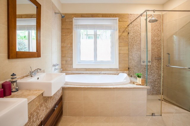 En-suite bathroom with double wash basin separate bath tub and glass shower cubicle