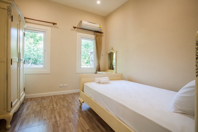 Third bedroom with single bed, free standing wardrobes and and vanity counter