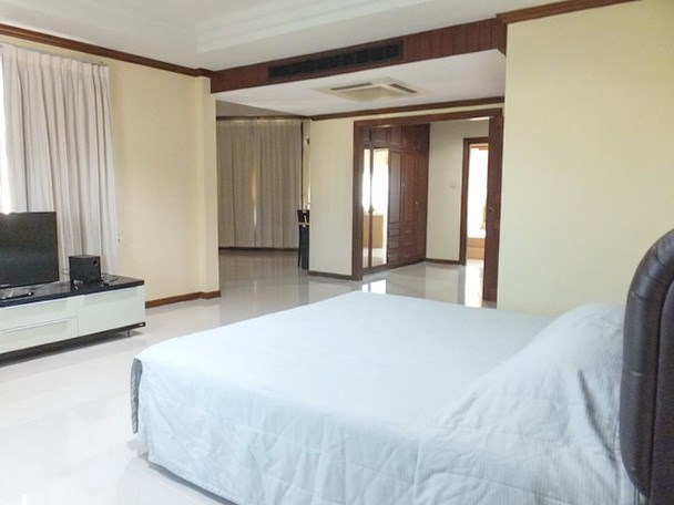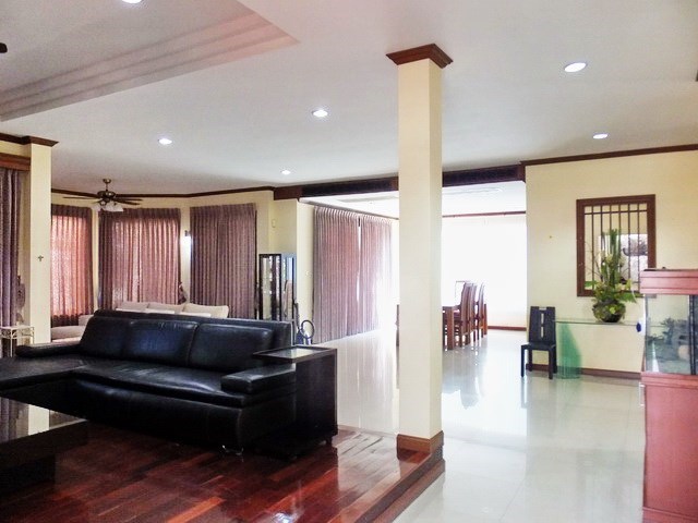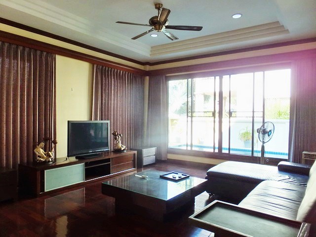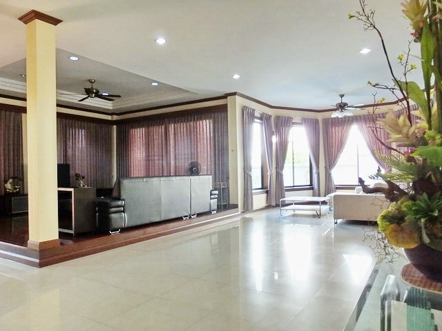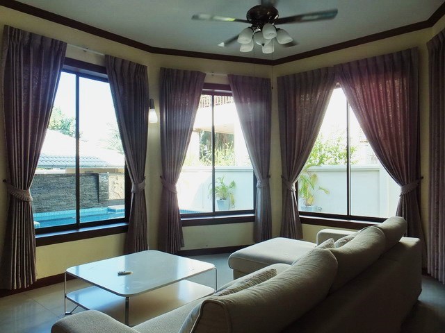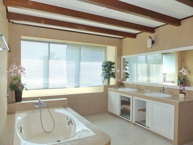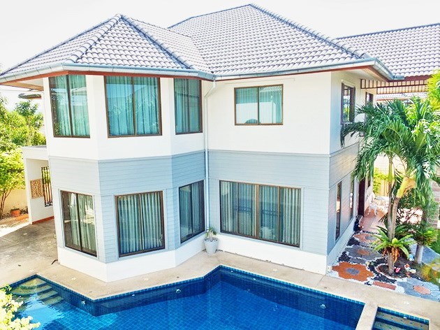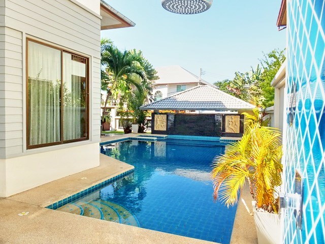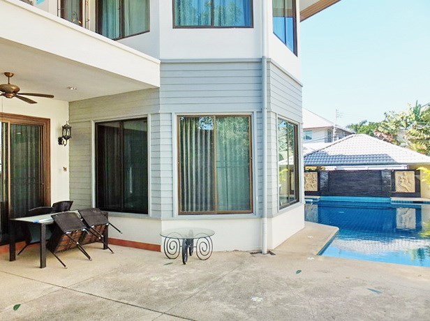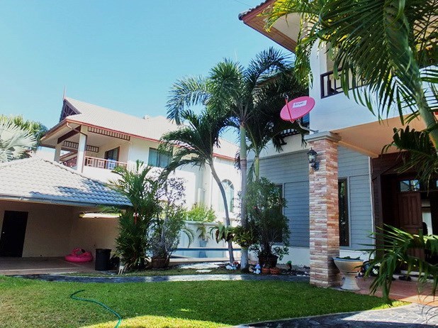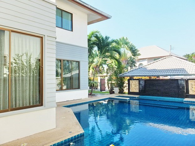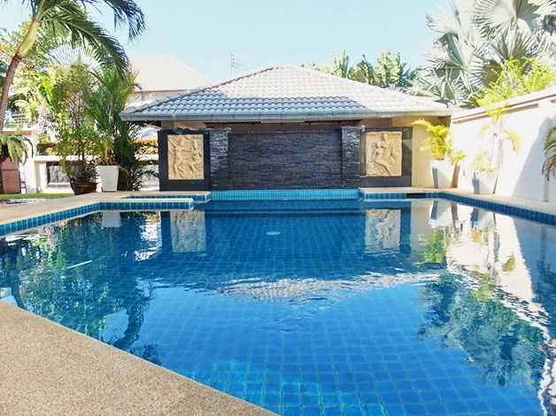 PATTAYA REAL ESTATE: Pool villa for rent East Pattaya, land size 520sqm, living area 250 sqm approx., 4 bedrooms, 4+1 bathrooms, European-style kitchen, fully furnished, tropical garden, 24-7 security, close to Sukhumvit road and Tesco lotus