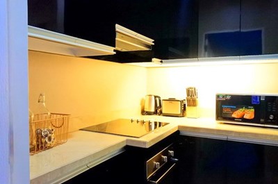 European-style kitchen with kitchen cabinets with soft closing draws, breakfast bar, granite counter tops, electric hob with extractor hood, oven, microwave and fridge freezer