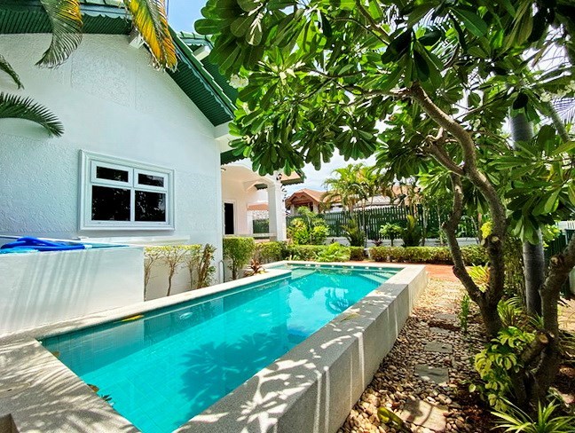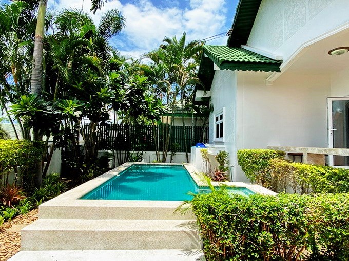 PATTAYA REAL ESTATE: House for rent East Pattaya, land size 360 sqm, living area 150 sqm approx., 3 bedrooms, 2 bathrooms, fully furnished, European-style kitchen, tropical garden, private swimming pool, 24-7 Security