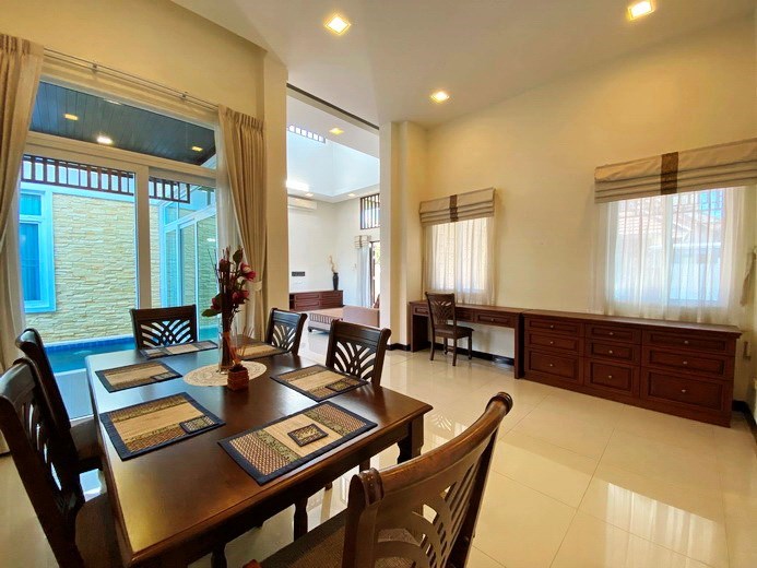 PATTAYA REAL ESTATE: House for rent East Pattaya, land size 364 sqm, living area 180 sqm, 3 bedrooms, 4 bathrooms, European-style kitchen, fully furnished, private swimming pool, tropical garden, carport, 24-7 security