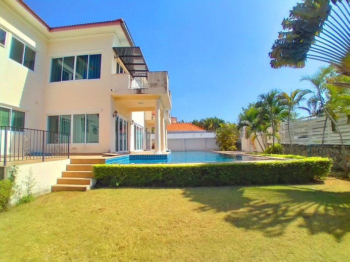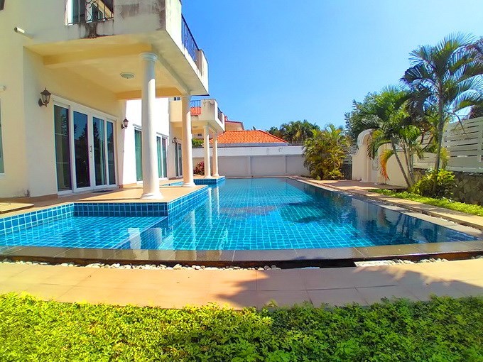 PATTAYA REAL ESTATE: Pool villa for rent East Pattaya, land size 880 sqm, living area 300 sqm approx., 4 bedrooms, 4+1 bathrooms, European-style kitchen, fully furnished, private swimming pool, lawn gardens, maid’s rooms, 24-7 security