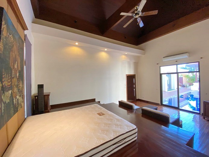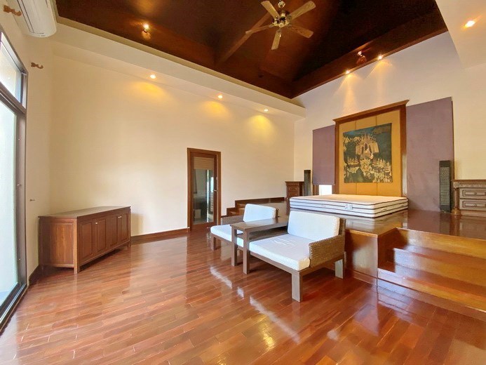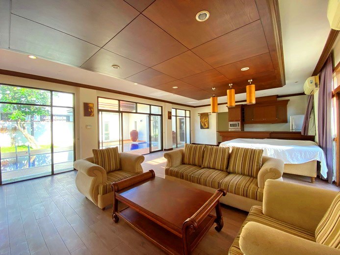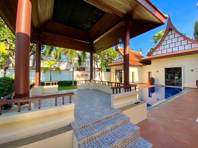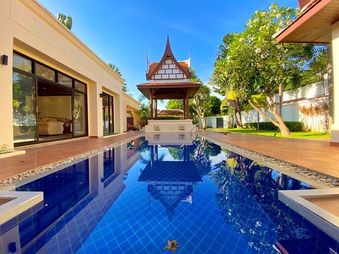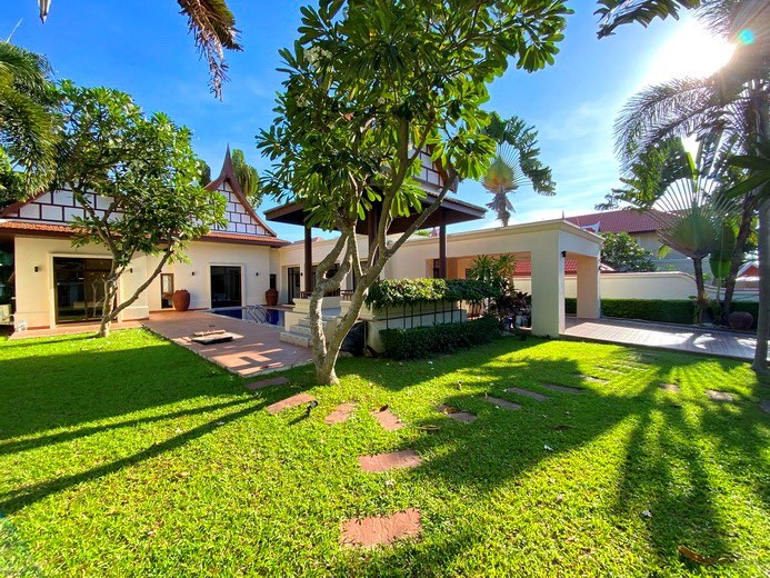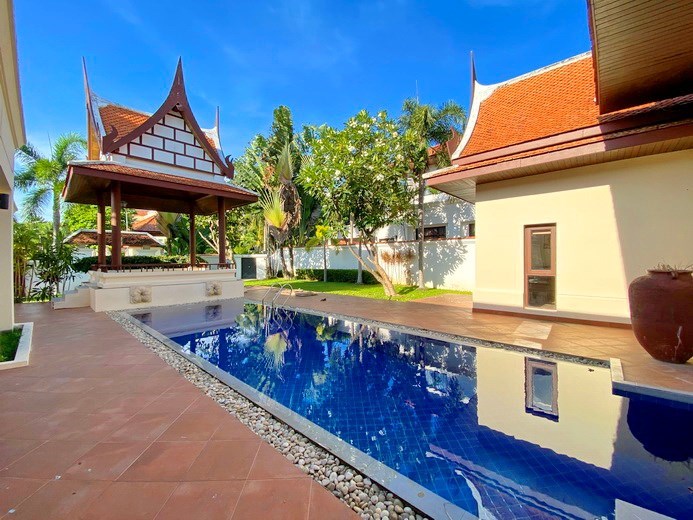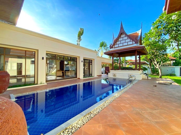 PATTAYA REAL ESTATE: Pool villa for rent East Pattaya, land size 756 sqm, living area 250 sqm approx., 3 bedrooms, 3 bathrooms, European-style kitchen, lawn garden, private swimming pool, sala, carport, 24-7 Security