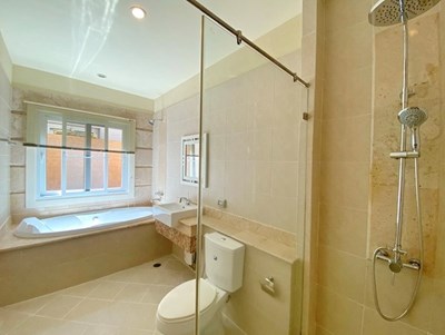 En-suite bathroom with separate bathtub and glass shower cubicle
