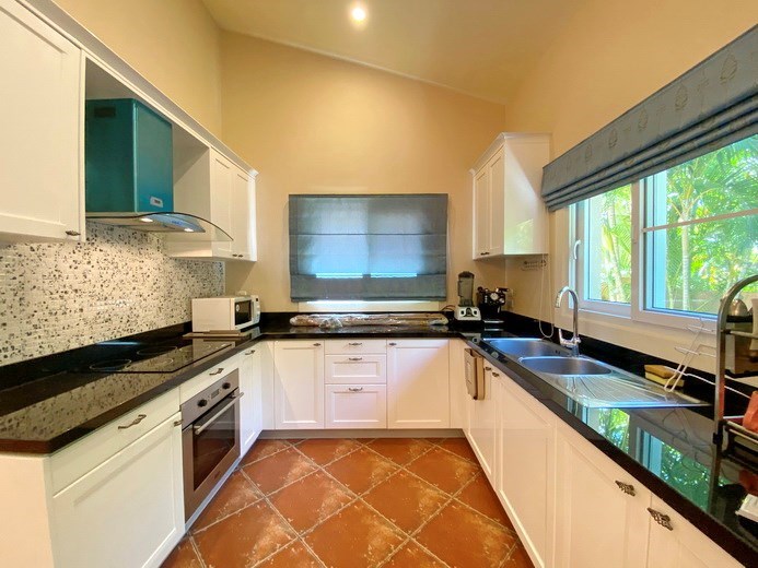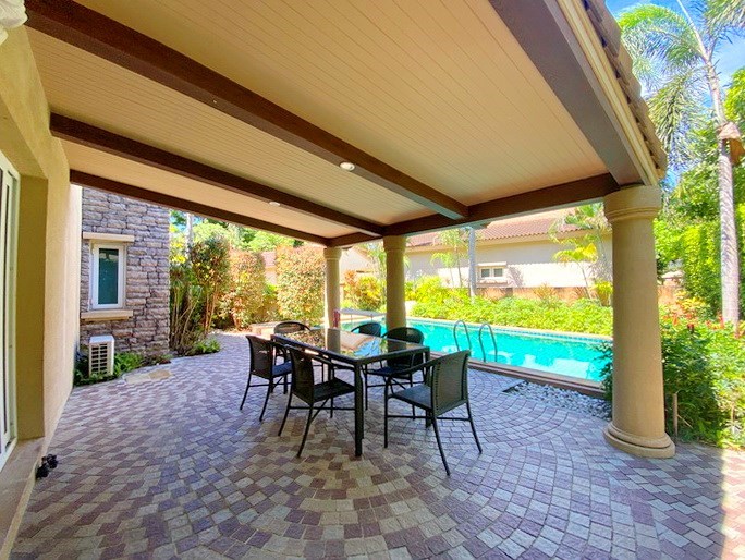 PATTAYA REAL ESTATE: House for Rent East Pattaya, land size 492 sqm, living area 200 sqm, 4 bedrooms, 2+1 bathrooms, European-style kitchen, fully furnished, private swimming pool, tropical garden, garage, 24-7 security